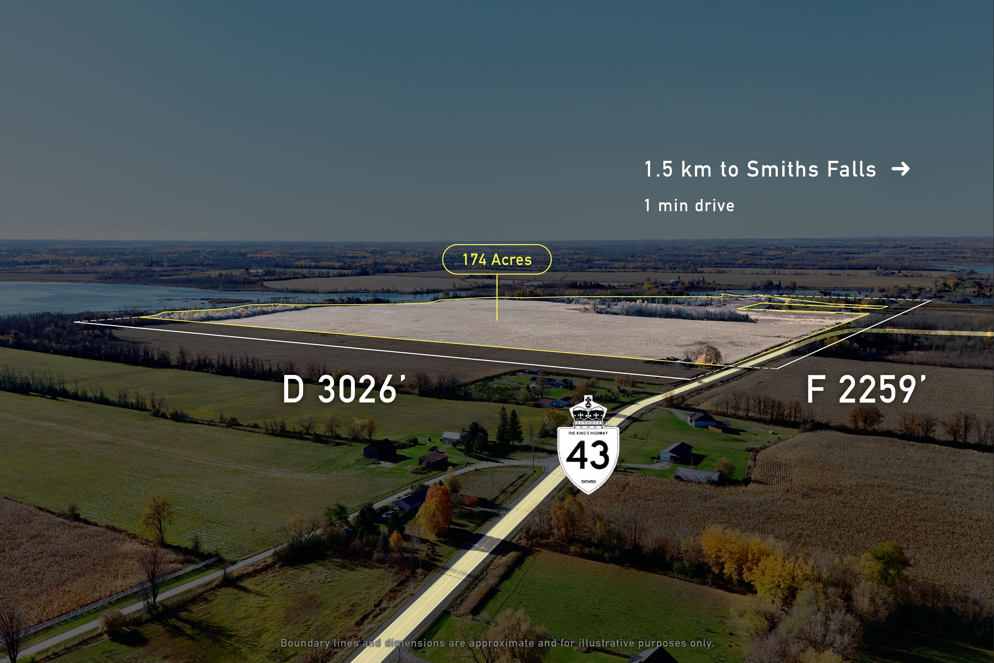 Additional details found in property brochure link below. Discover a 174-acre agricultural landholding along highway 43 in the smiths falls region, offering meaningful scale and approximately 95 acres of tile-drained, productive tillable land. The property features efficient field configuration suited to modern equipment and consistent crop production, supported by approximately 4,800 feet of water frontage that contributes to natural drainage and field performance. With solid regional access and a strong workable land base, this parcel presents a compelling opportunity for agricultural operators seeking scale, efficiency, and long-term farming viability. This property may not be subject to hst; however, all parties are advised to obtain independent advice from their accountant and legal counsel to determine the applicability of hst.