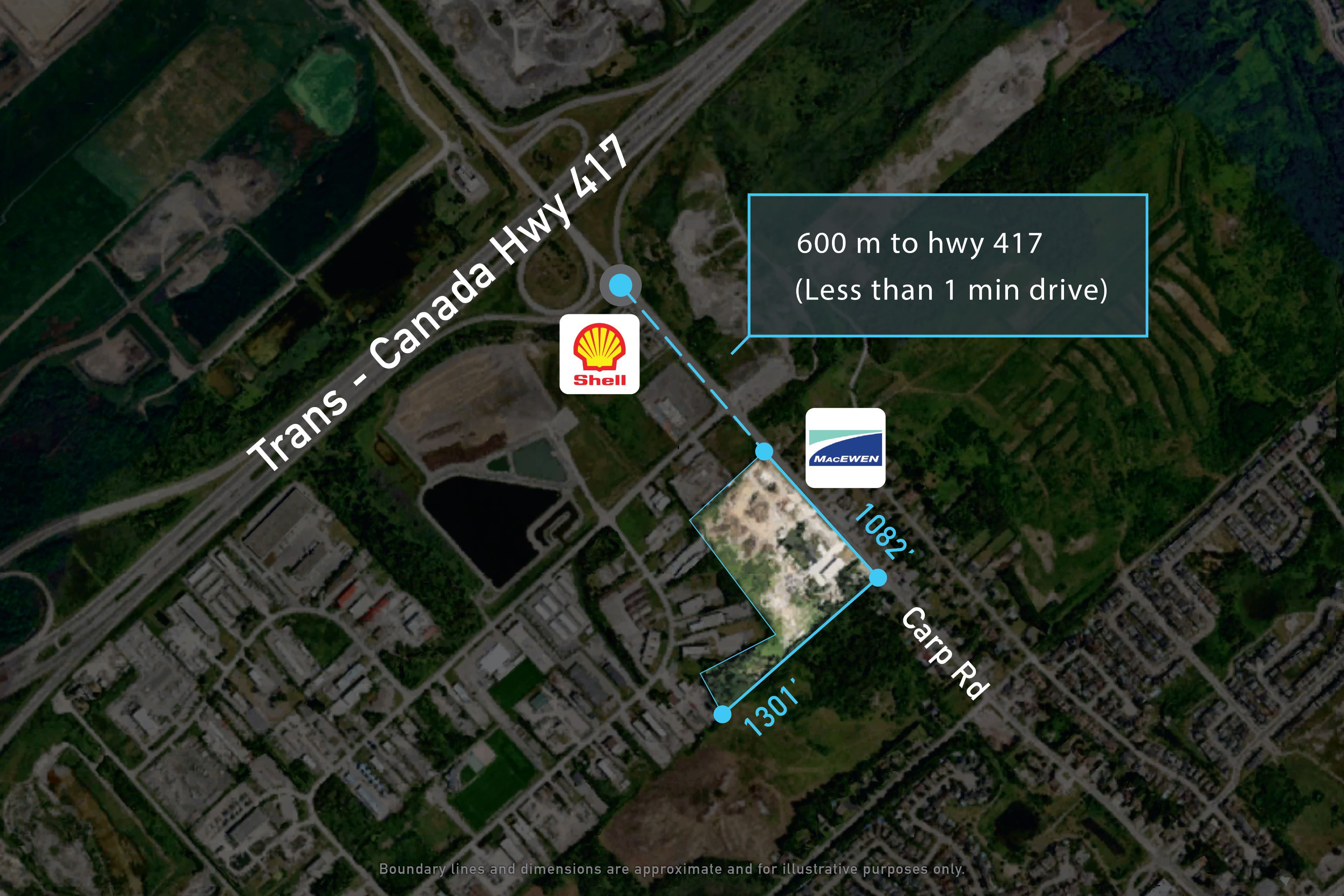 Prime 20-acre parcel strategically situated in the rapidly growing stittsville-ottawa area, offering direct access to highway 417. Recently incorporated into the urban boundaries and designated for logistics and industrial use, this property presents diverse opportunities for logistics and light industrial applications. Services at the property line include hydro, gas, and water. The city of ottawa is currently in the planning and engineering phase of expanding carp road to four lanes and bringing in sewer services. Position your investment strategically in this dynamic landscape. (seller is open to a vtb pending terms).