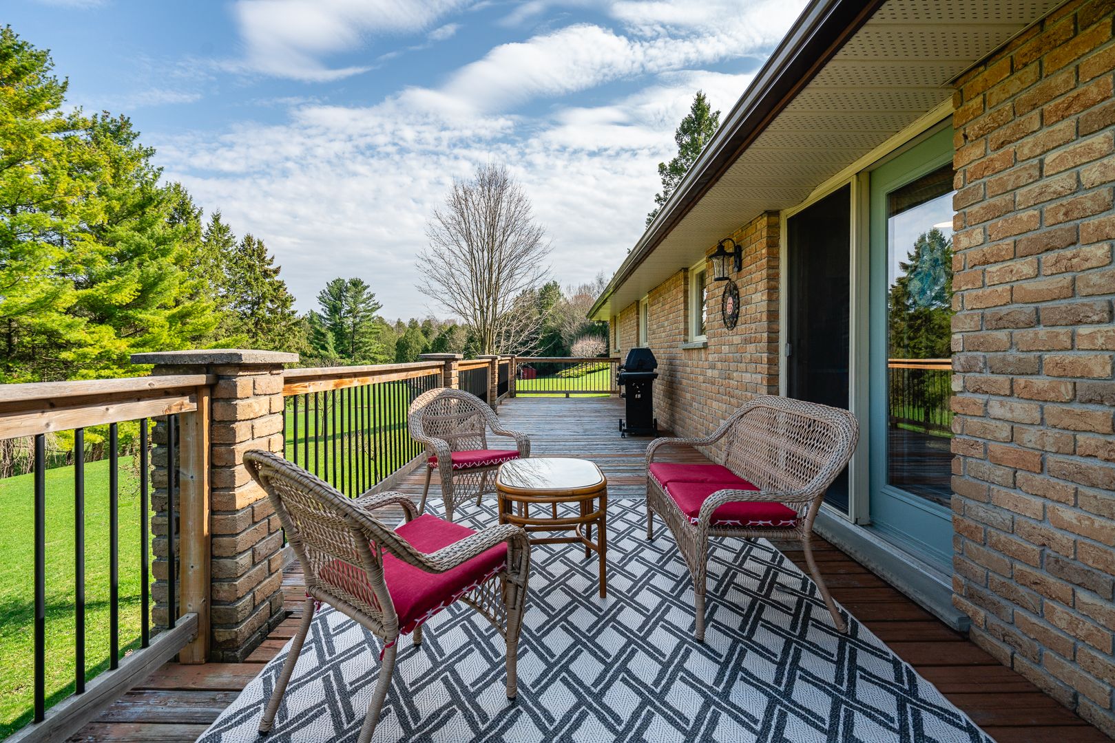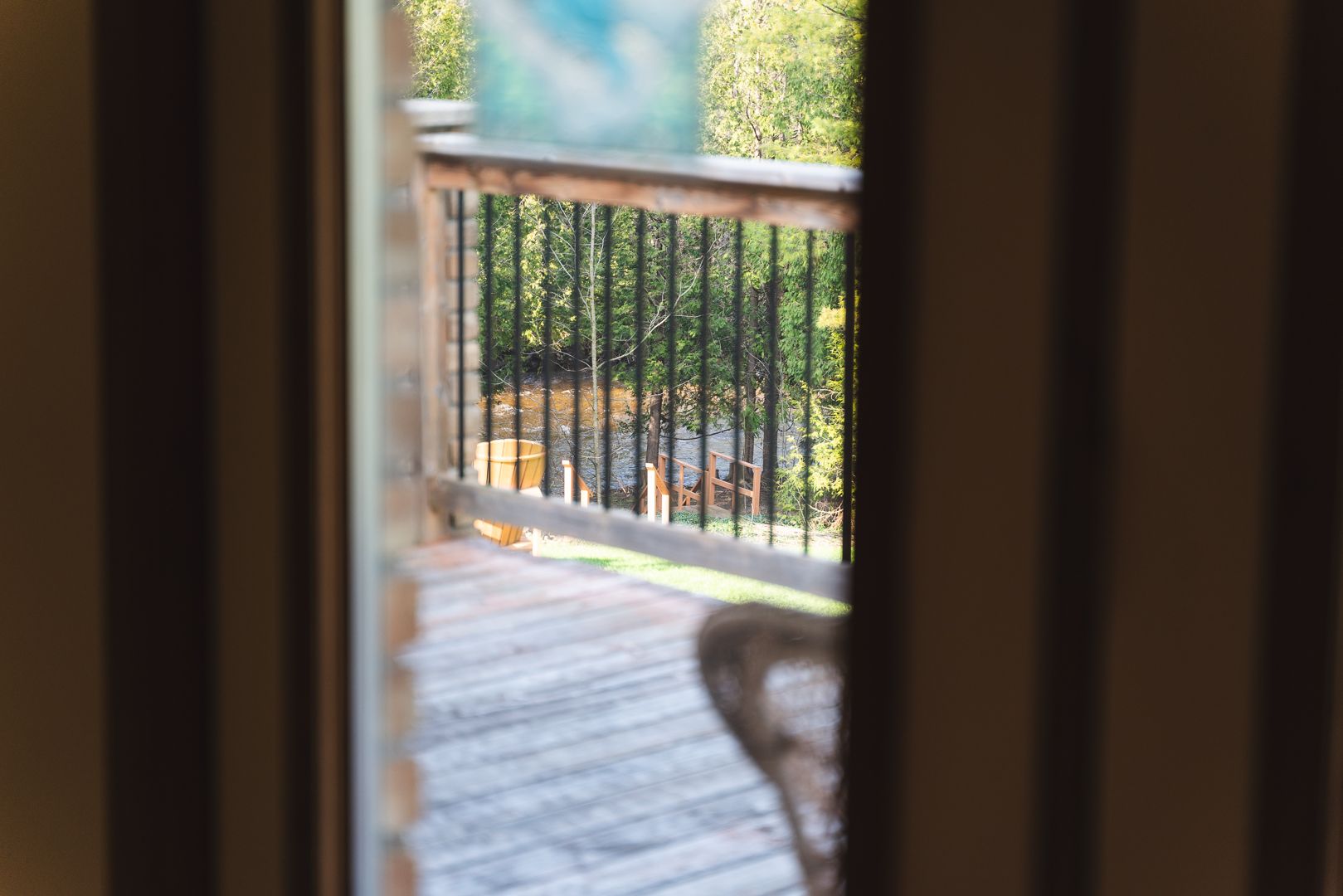 • Large deck overlooks forest and river, great for relaxing outdoors.