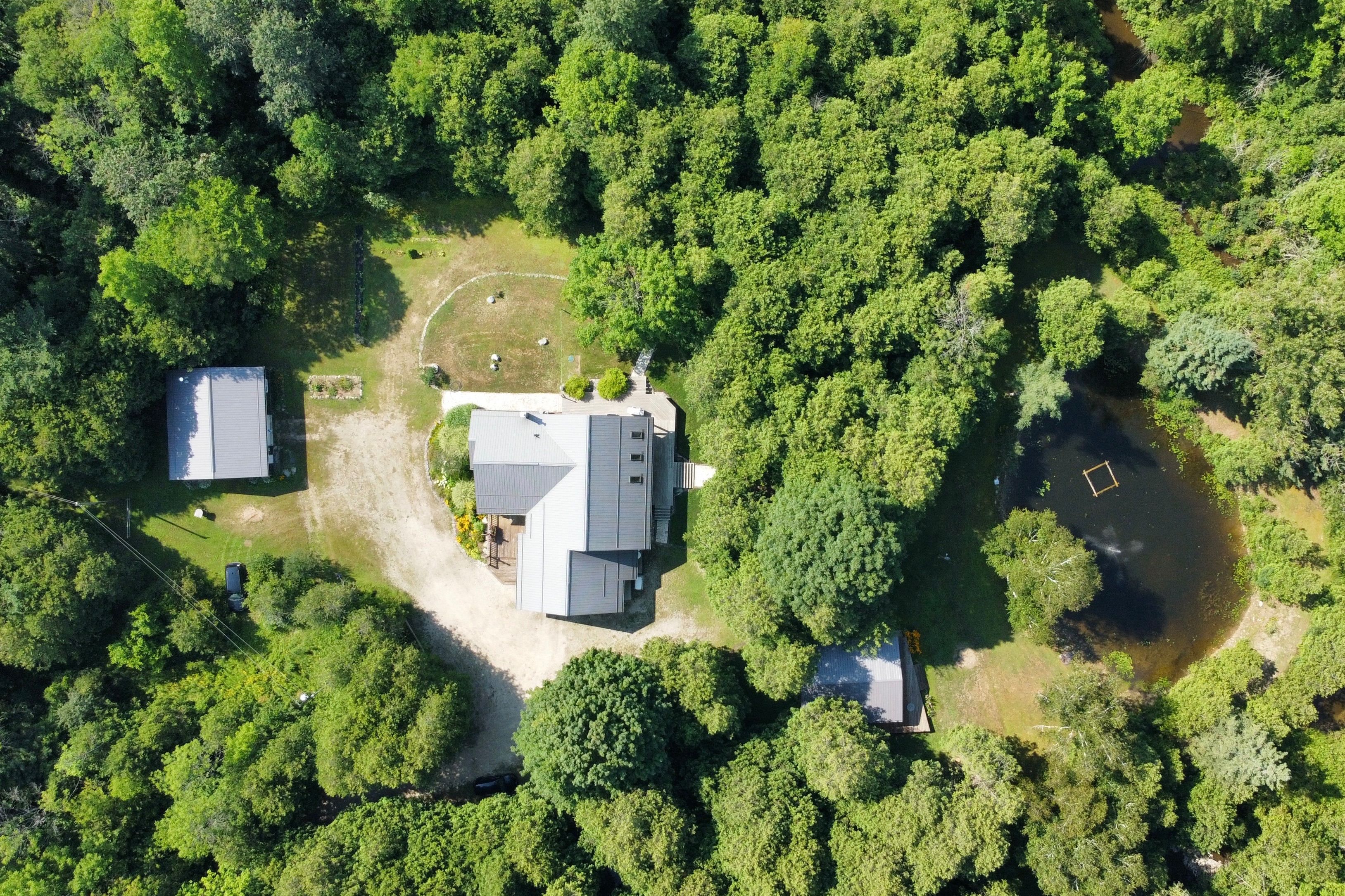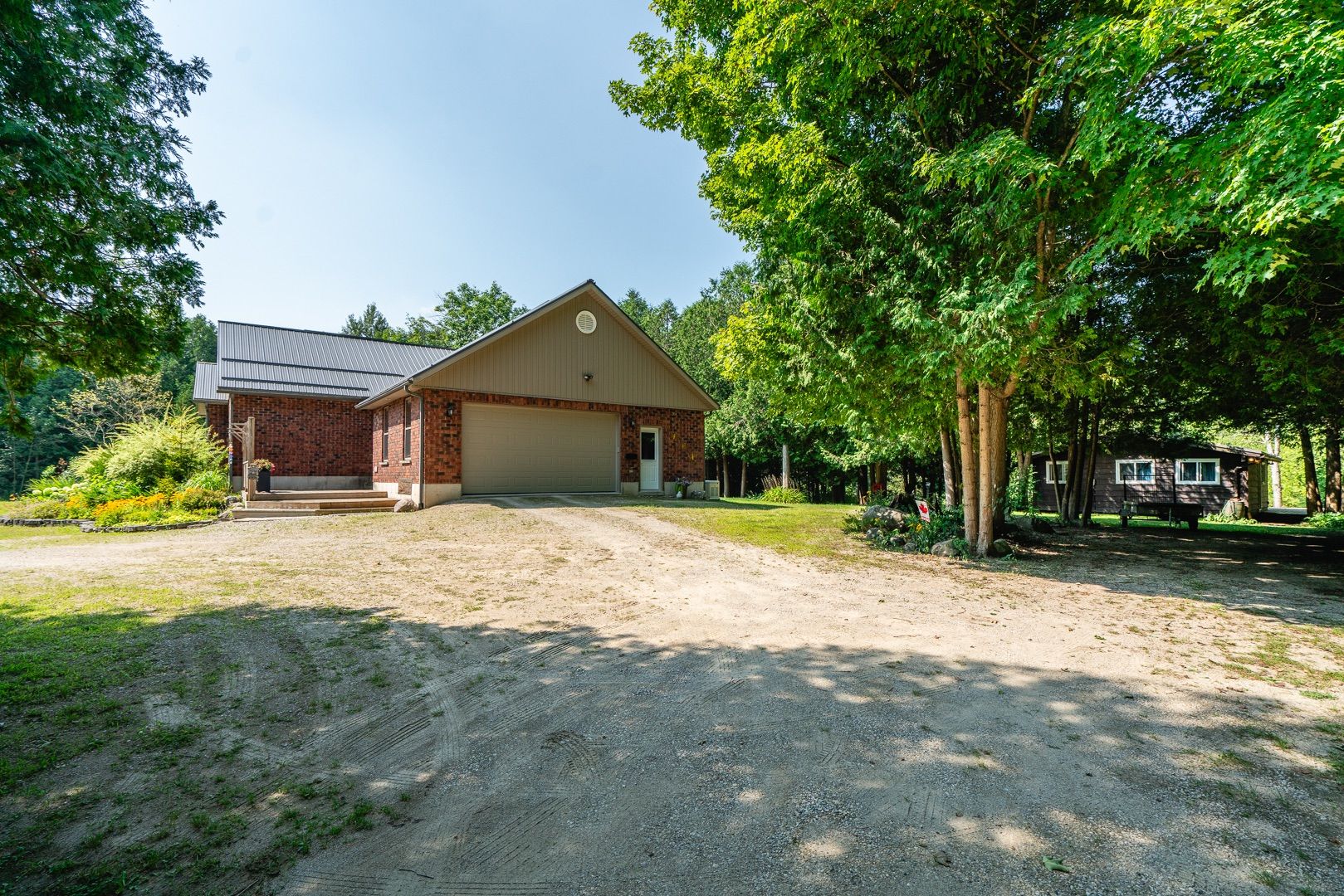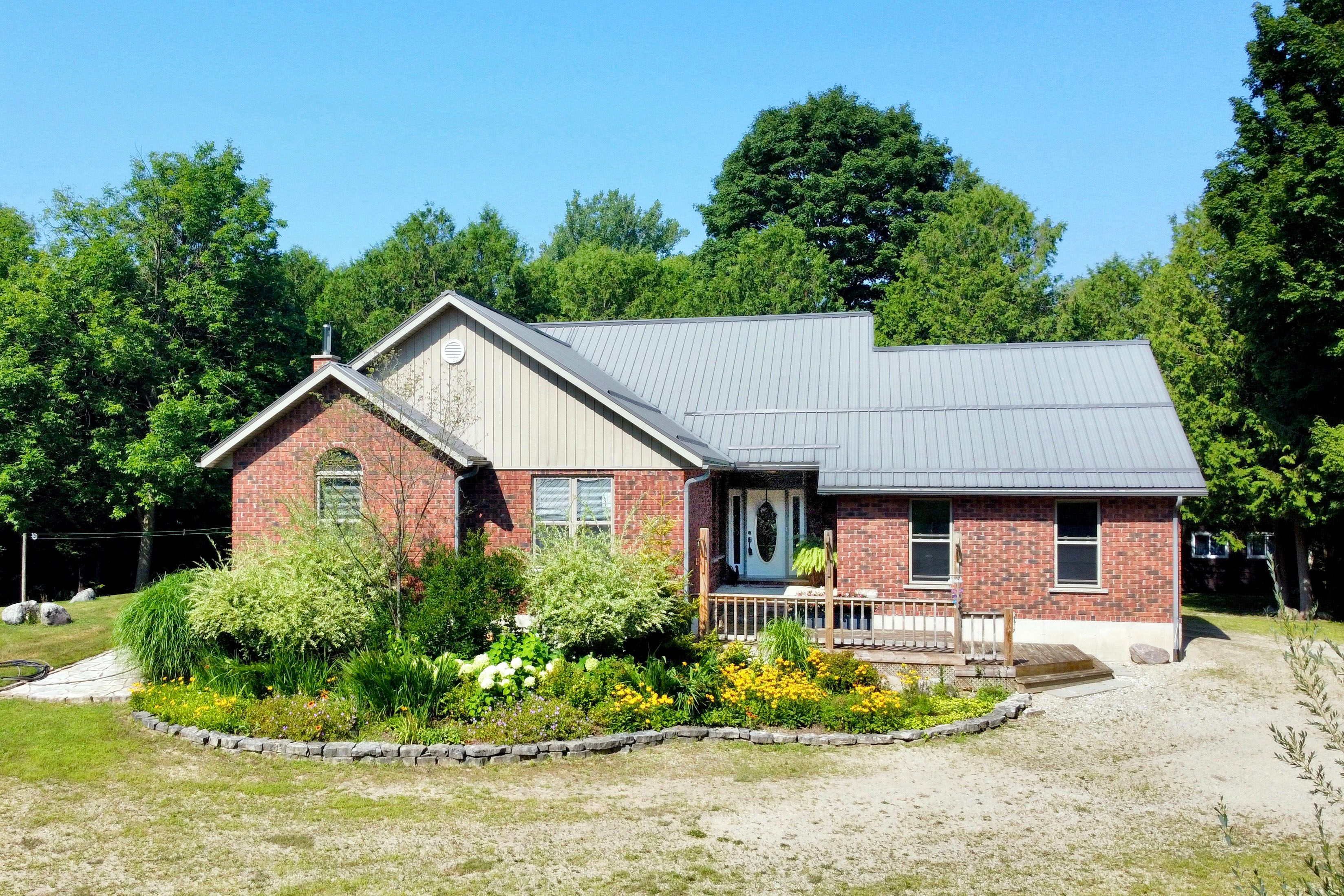 This 2006 brick bungalow sits on over 20 acres and comes complete with a 28' x 32' workshop, charming cottage, private pond, walking or atv trails, and the beautiful deer creek running through the property. Offering over 2800 sq. Ft. Of total living space, the home features a bright living room with soaring vaulted ceilings, a primary suite with a walk-in closet and 3-piece ensuite, and a versatile room perfect for a home office or 3rd main floor bedroom. The fully finished basement expands your living area with a large rec room, hobby room, office, 3rd full bath, tons of storage, a convenient walk-up to the outdoors, and a 4th sleeping area-ideal for guests or extended family. Appliances are included, and the attached two-car garage adds even more functionality. Step outside to expansive decks overlooking the pond, where frogs and turtles make their home, or cast a line in the creek and enjoy fishing right on your own property. Nature lovers will appreciate the abundance of wildlife and peaceful surroundings at every turn. Just steps from the house you'll find your newly renovated cottage, an ideal guest space, art studio filled with natural light, or quiet getaway. With its natural beauty and complete privacy, this property is a rare opportunity to own a country retreat with every feature you could ask for!