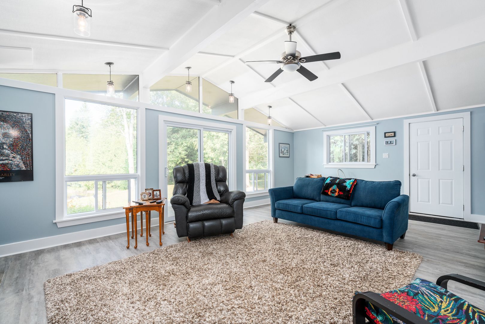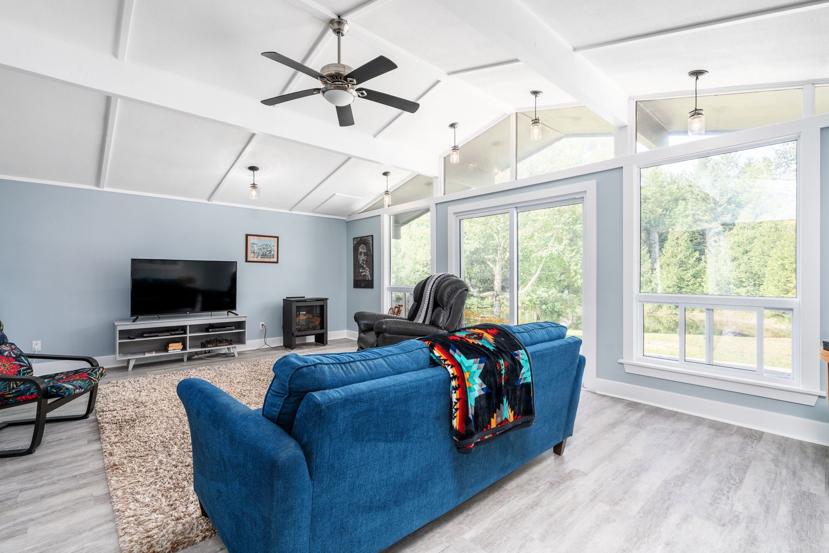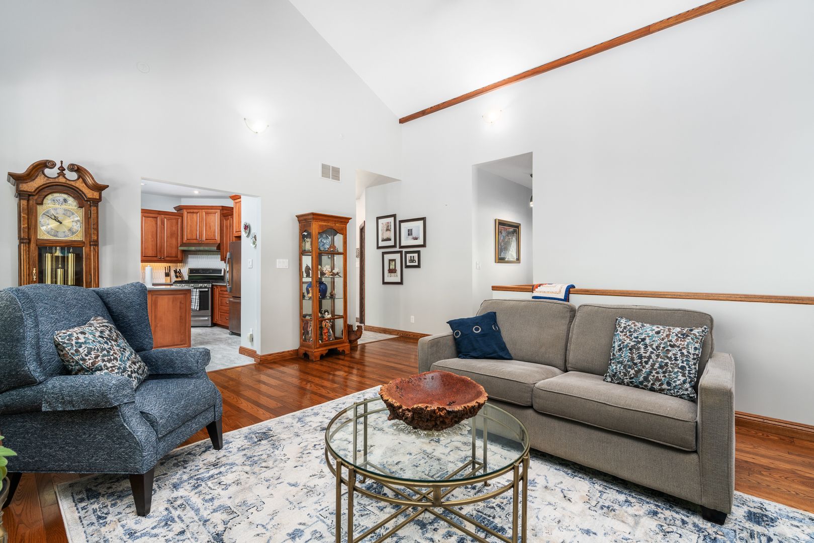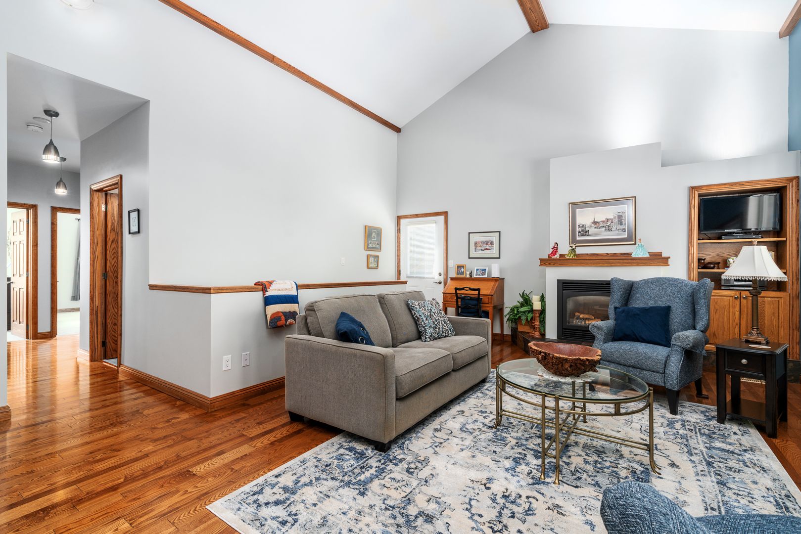• Bright living room with high vaulted ceilings for an open feel.