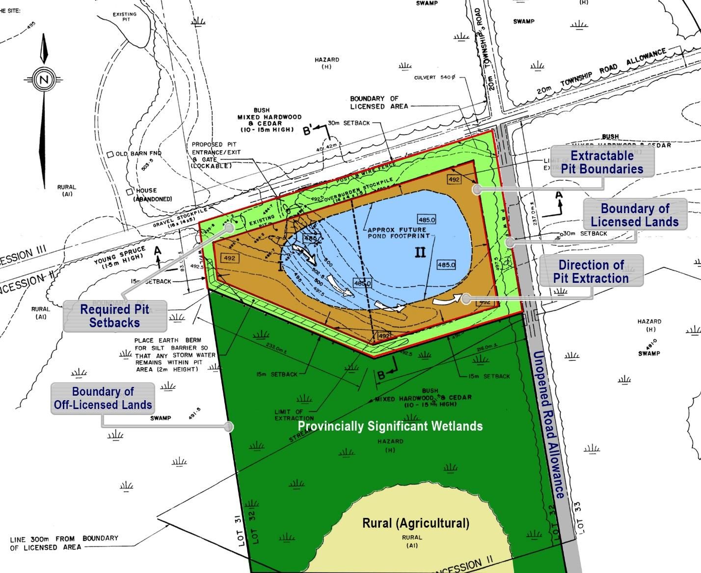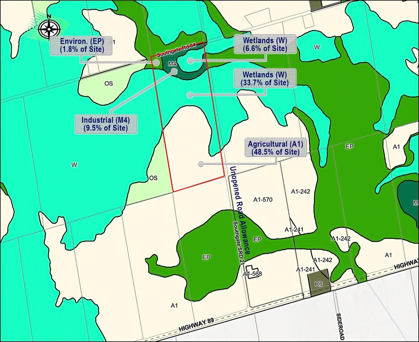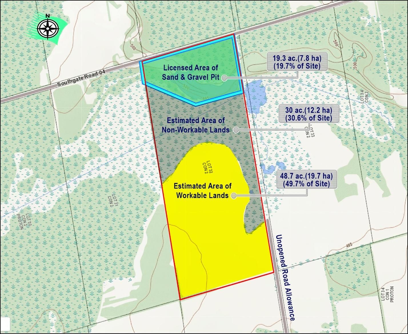Opportunity 98 acres vacant land with mixed uses, current use is aggregate pit, extractive industrial zone (m4) license number 4875 southern region, aurora midhurst owen sound district (to be transferred at the buyers expense)there is 40. 3 % wetlands protection zone (w) 1. 8% is environmental protection zone (ep) back of property is + - 48. 5%, agricultural zone (a1) is + - 45% and pit area is zoned extractive m4 zoning + - 9. 5%there is still aggregate in the pit, approx. 88,500 tonnes plus what is out on the ground. Great opportunity for a contractor, pit operator. Pretty pond on the property from the previous excavating, clear blue water. Good agricultural land at the back of the property, access is through the road 21 off highway 89, pit access if rom southgate rd 04
