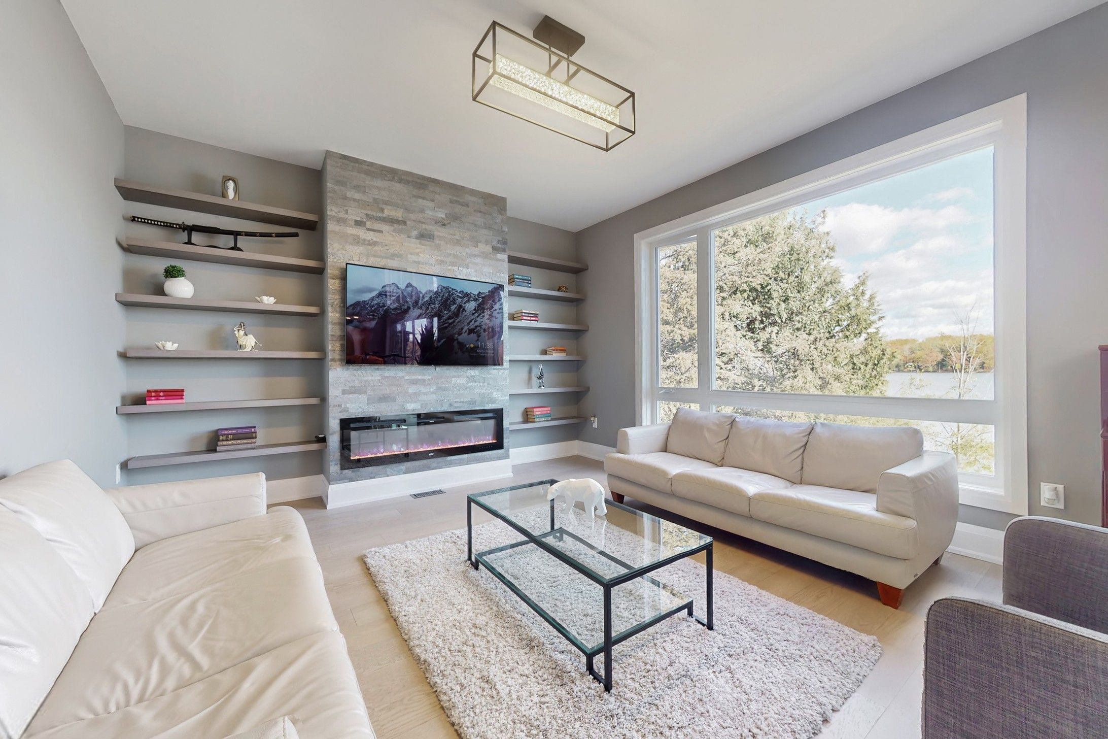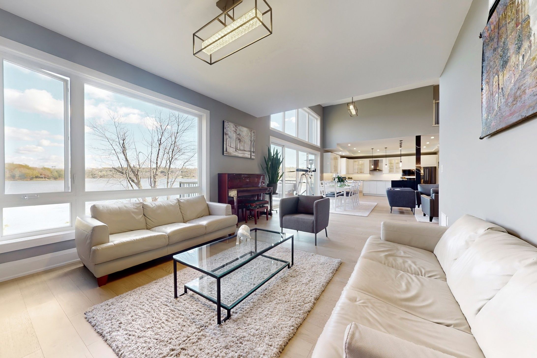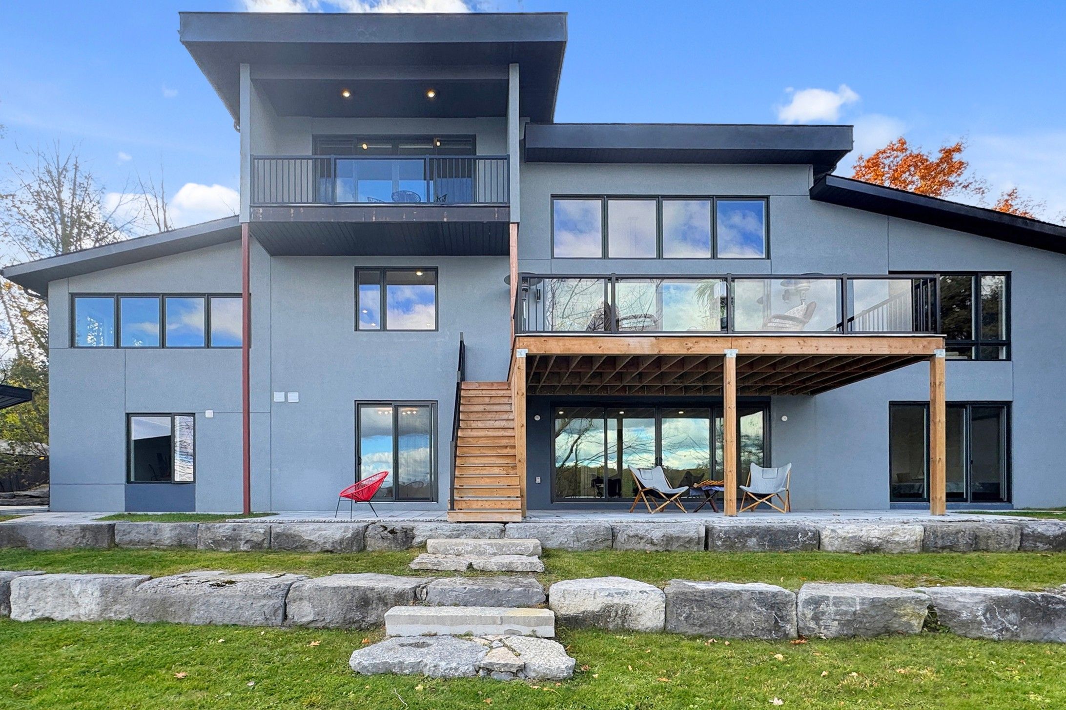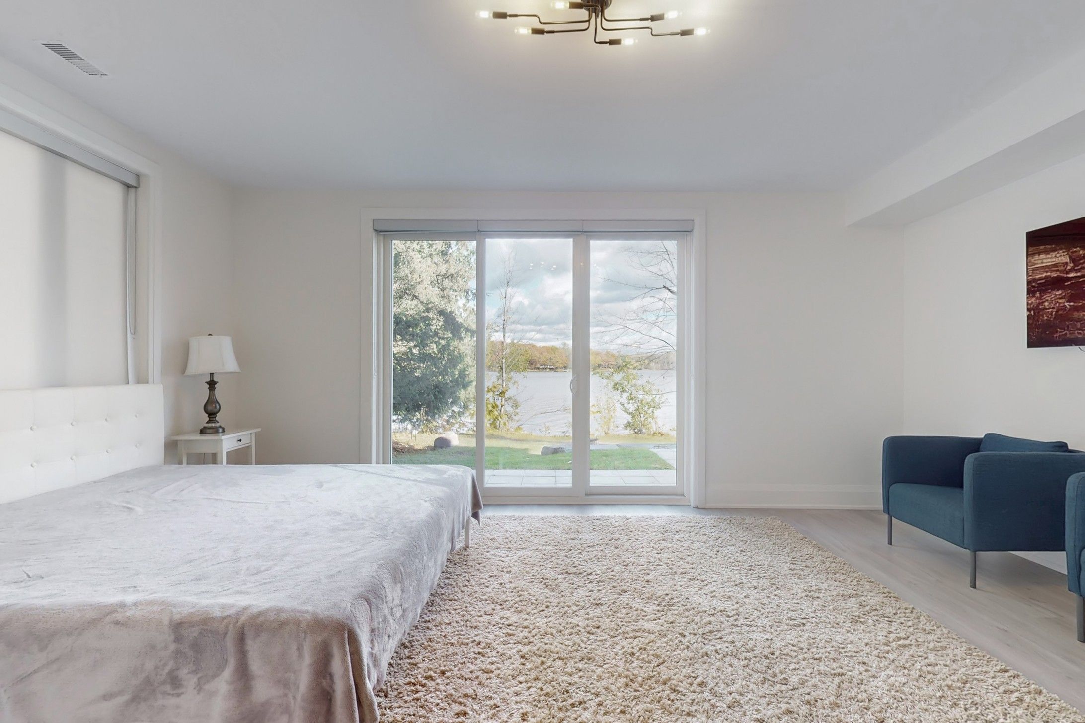 Stunning custom-built lakefront home with 175 ft of private shoreline surrounded by mature trees. The master bedroom loft with a walkout to a balcony with breathtaking lake views and a luxurious ensuite. The main floor with 10 to 16 ft ceilings, a spacious open-concept layout, large windows for natural light, and a walkout to a terrace overlooking the lake. The elegant foyer features built-in closets on both sides, modern kitchen includes a cozy built-in breakfast area and unique architectural design. The walk-out basement offers 9 ft ceilings, two bedrooms with ensuites, and access to a lake view terrace from both the bedrooms and the recreation room. A separate side entrance leads to a private "man cave" with a kitchenette and 3-piece bath - perfect for guests or hobbies. Enjoy a lakeside sauna with a sitting and relaxation area, a garage with large windows, and a mudroom with built-in closets and a convenient dog spa for post-walk cleanups. Heated bathroom floors. House is built using the icf construction method for superior efficiency and durability, this home also includes a central backup generator and a heat pump system.
