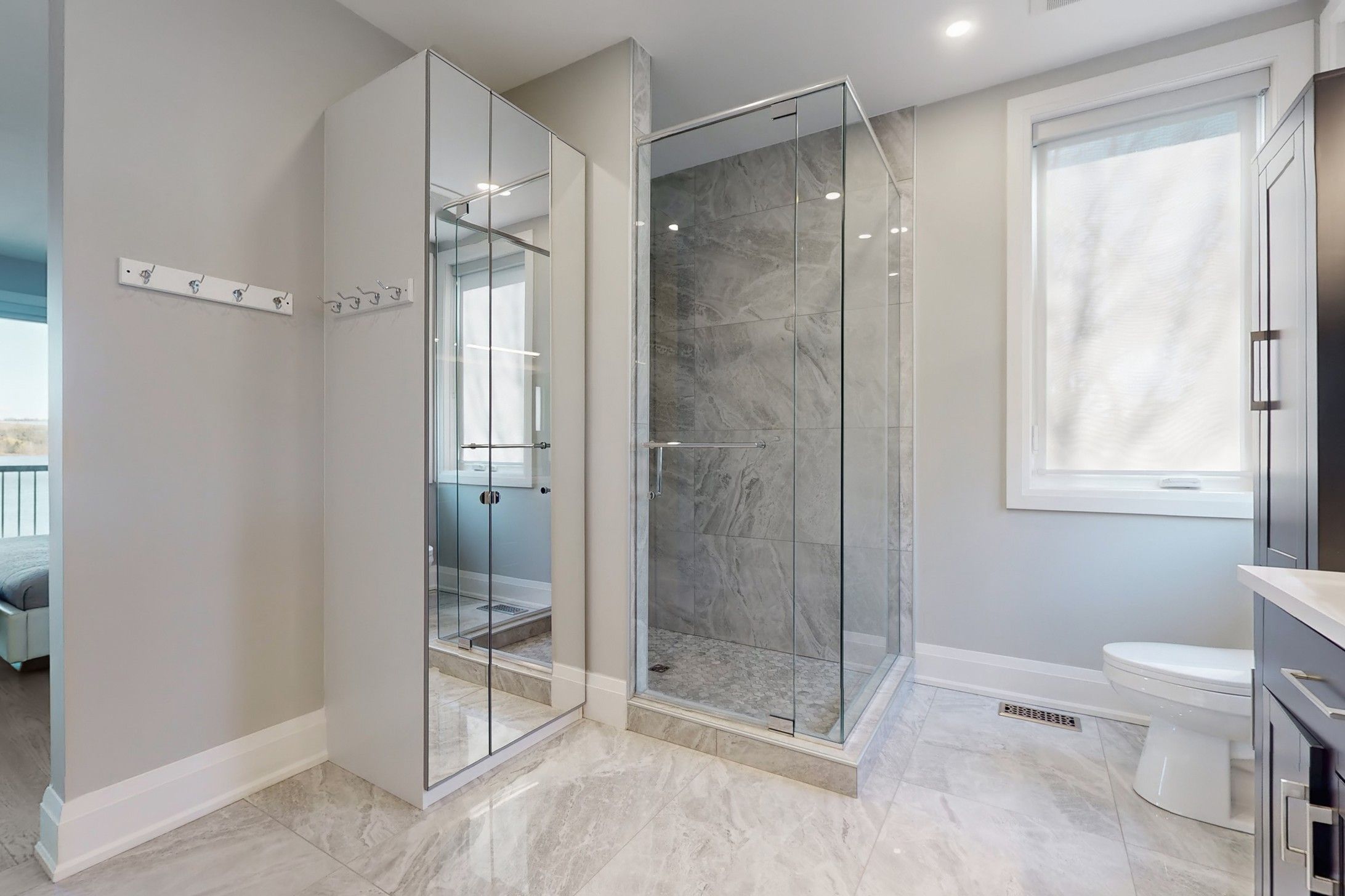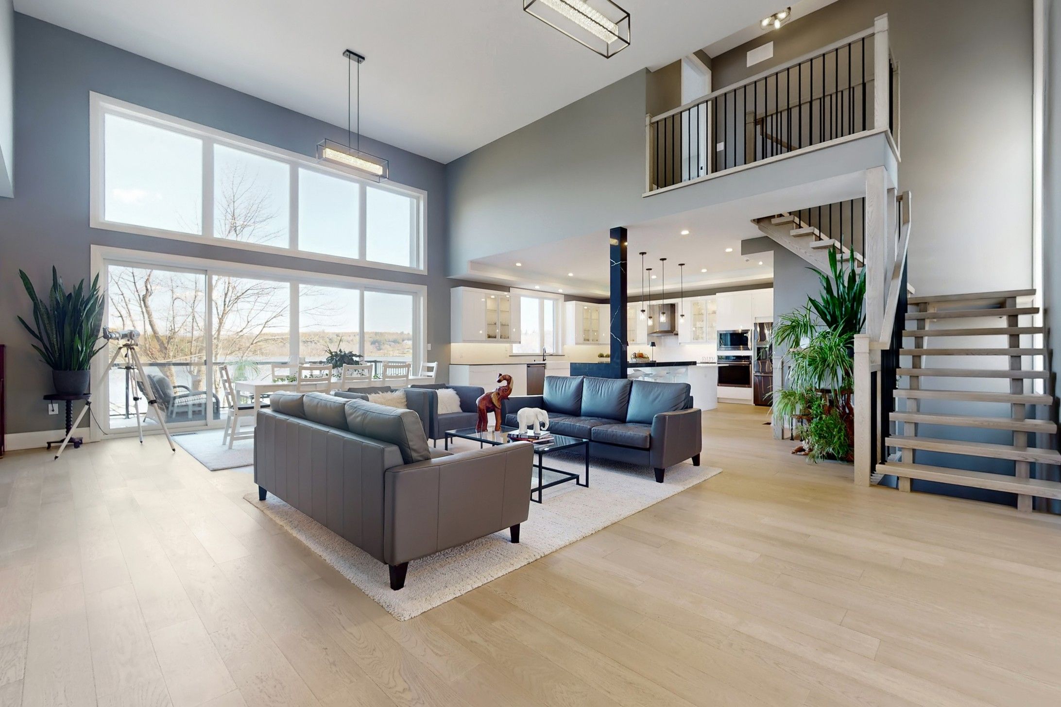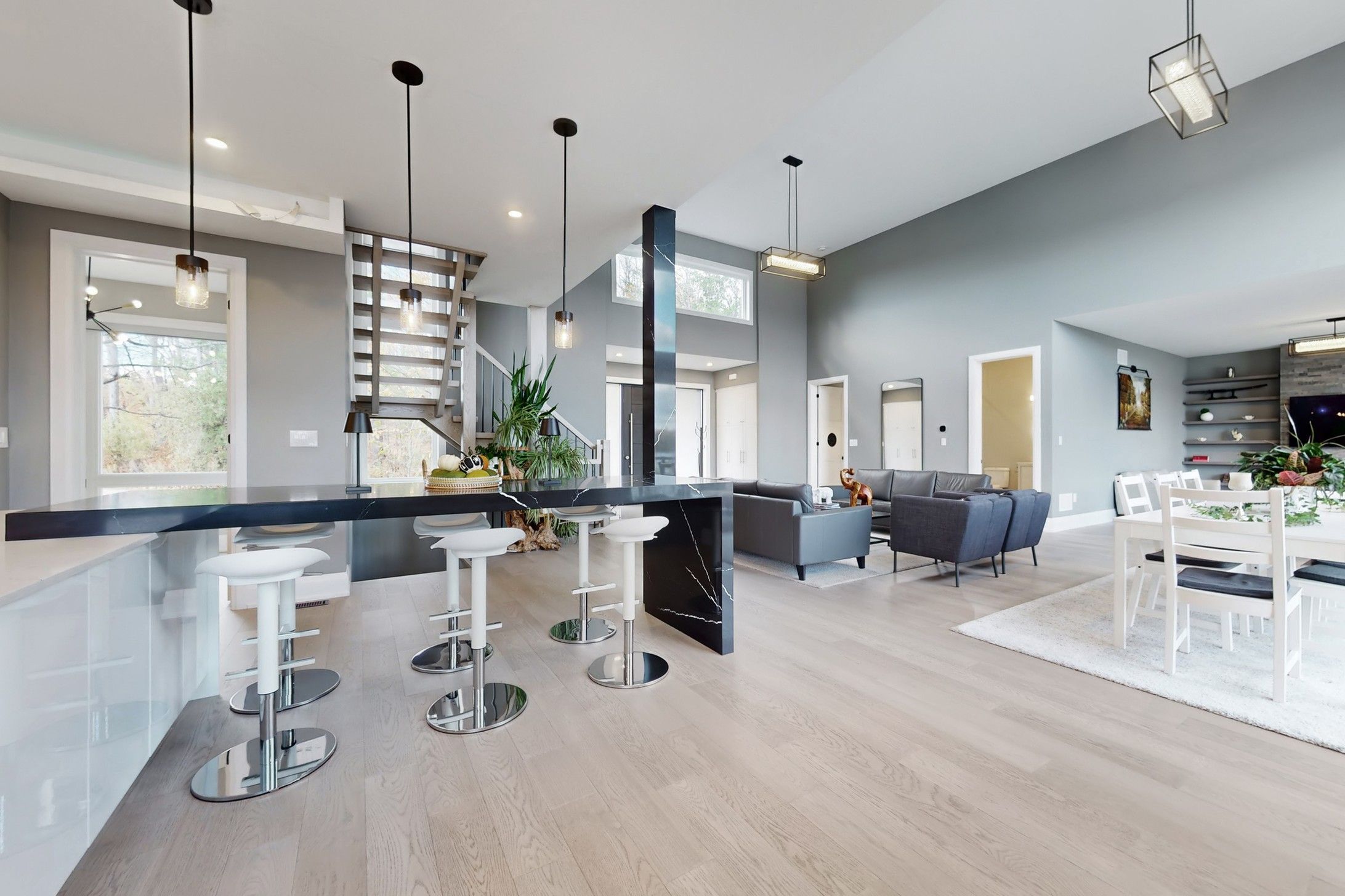 Stunning custom-built lakefront home with 175 ft of private shoreline surrounded by mature trees. The master bedroom loft with a walkout to a balcony with breathtaking lake views and a luxurious ensuite. The main floor with 10 to 16 ft ceilings, a spacious open-concept layout, large windows for natural light, and a walkout to a terrace overlooking the lake. The elegant foyer features built-in closets on both sides, modern kitchen includes a cozy built-in breakfast area and unique architectural design. The walk-out basement offers 9 ft ceilings, two bedrooms with ensuites, and access to a lake view terrace from both the bedrooms and the recreation room. A separate side entrance leads to a private "man cave" with a kitchenette and 3-piece bath - perfect for guests or hobbies. Enjoy a lakeside sauna with a sitting and relaxation area, a garage with large windows, and a mudroom with built-in closets and a convenient dog spa for post-walk cleanups. Heated bathroom floors. House is built using the icf construction method for superior efficiency and durability, this home also includes a central backup generator and a heat pump system.