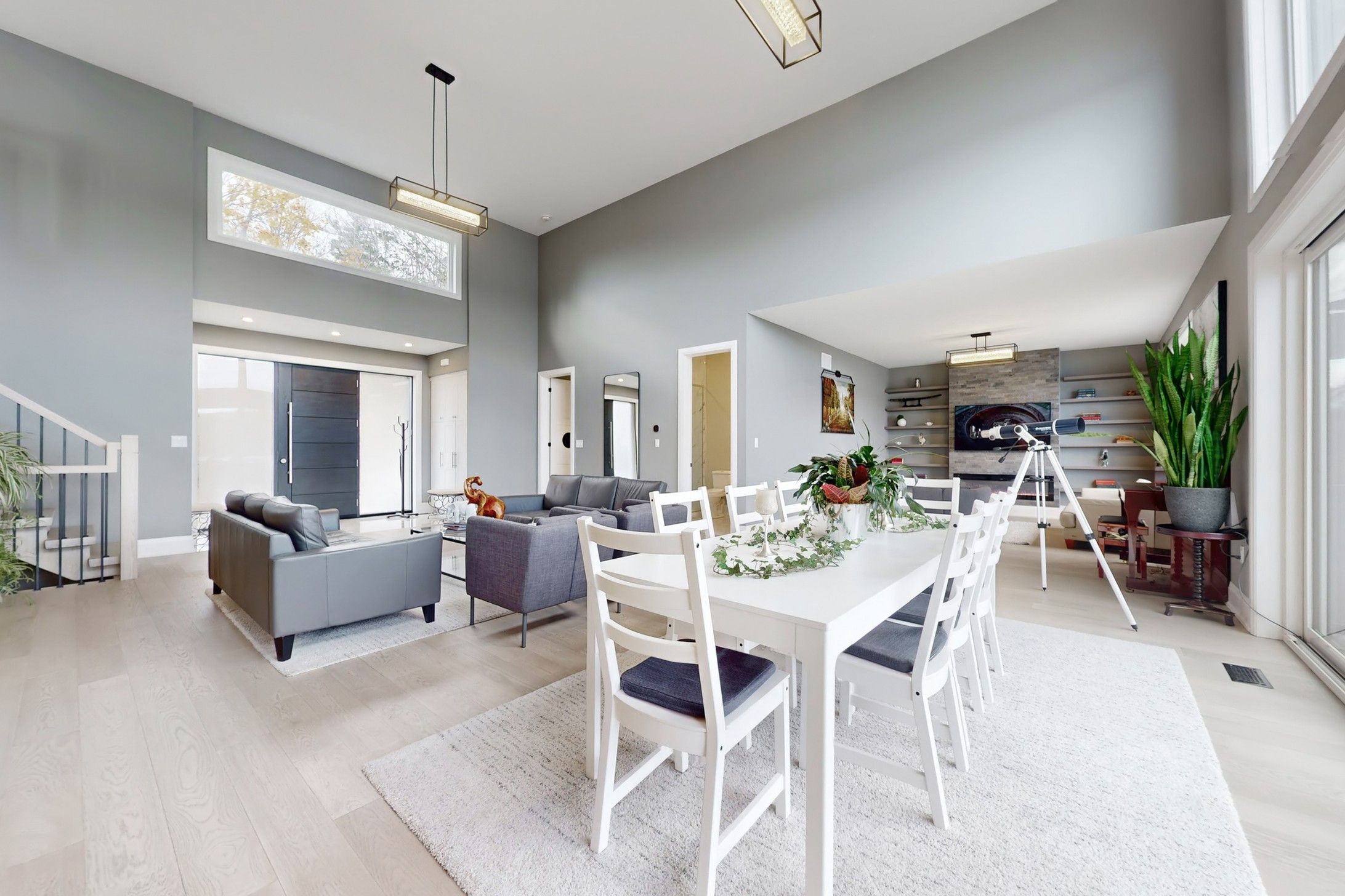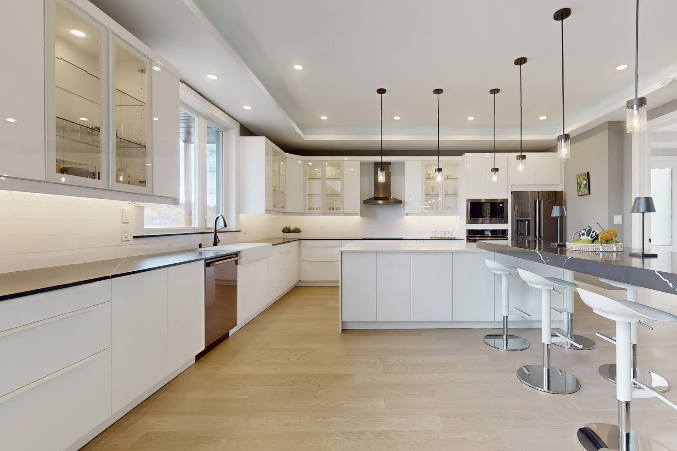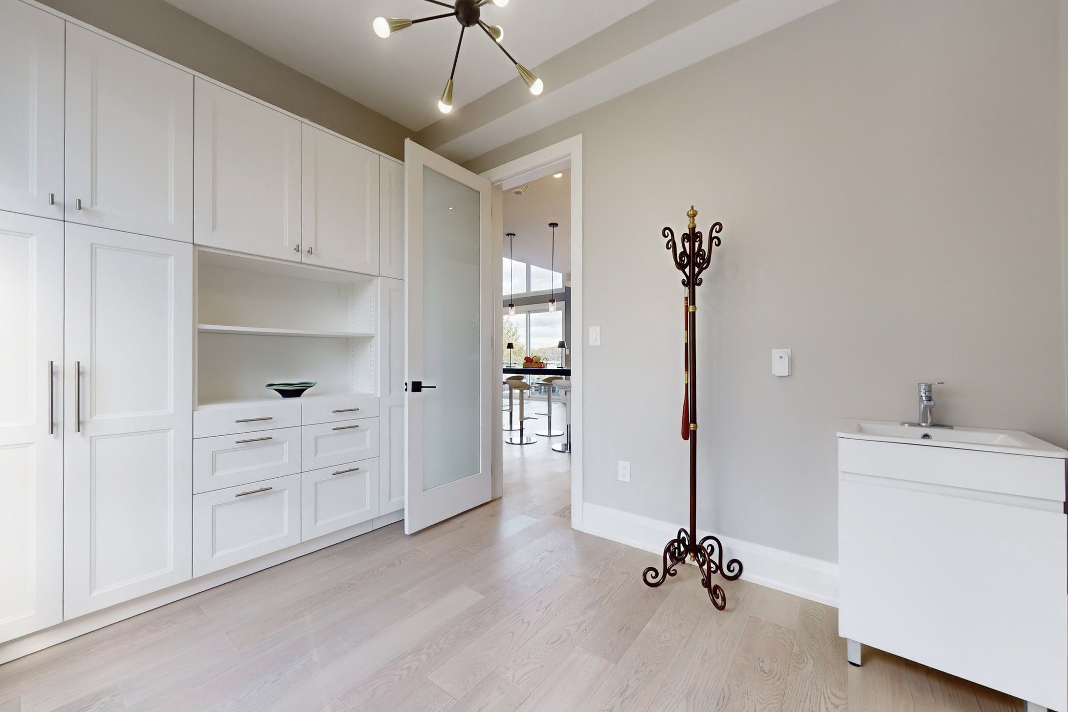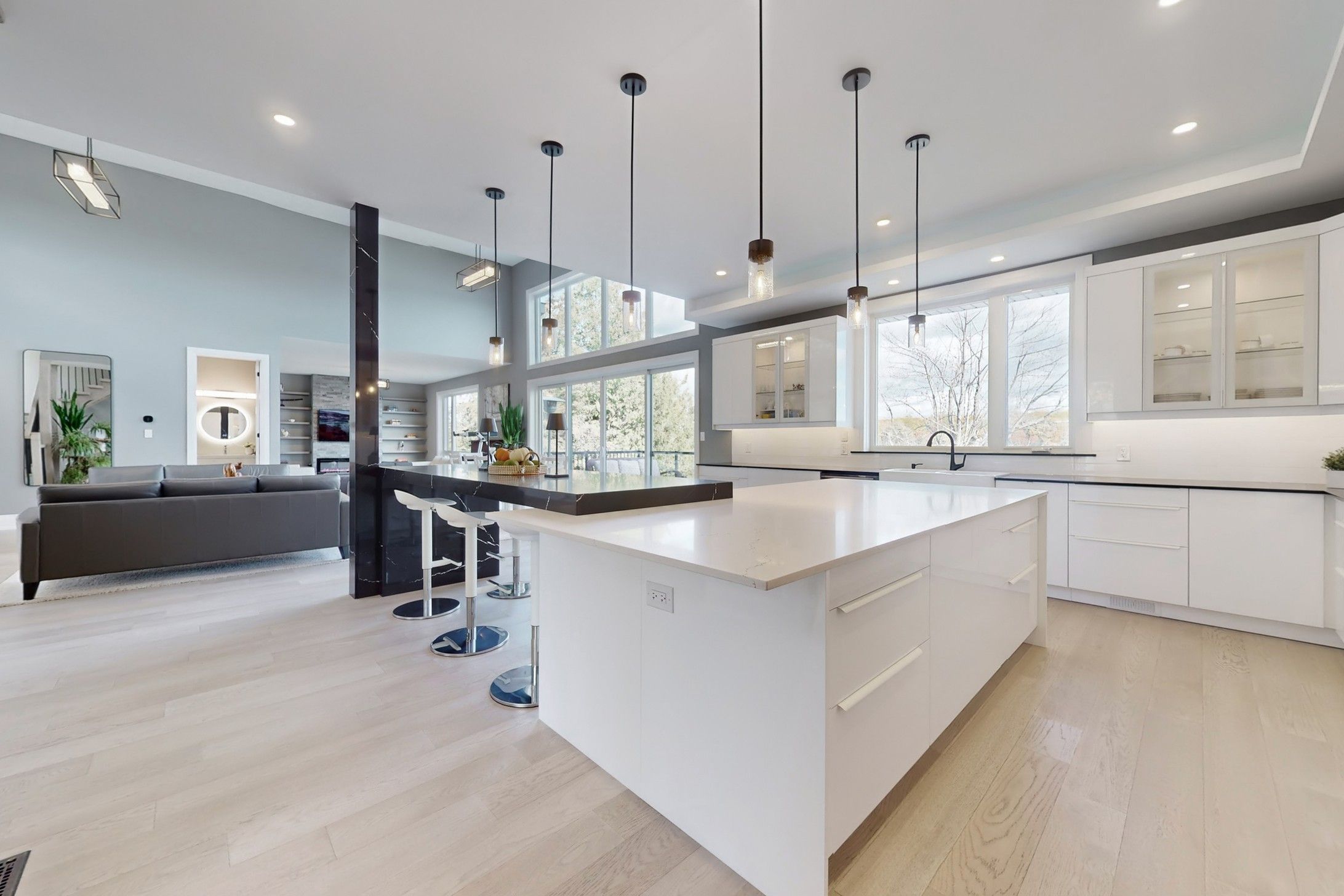 Stunning custom-built lakefront home with 175 ft of private shoreline surrounded by mature trees. The master bedroom loft with a walkout to a balcony with breathtaking lake views and a luxurious ensuite. The main floor with 10 to 16 ft ceilings, a spacious open-concept layout, large windows for natural light, and a walkout to a terrace overlooking the lake. The elegant foyer features built-in closets on both sides, modern kitchen includes a cozy built-in breakfast area and unique architectural design. The walk-out basement offers 9 ft ceilings, two bedrooms with ensuites, and access to a lake view terrace from both the bedrooms and the recreation room. A separate side entrance leads to a private "man cave" with a kitchenette and 3-piece bath - perfect for guests or hobbies. Enjoy a lakeside sauna with a sitting and relaxation area, a garage with large windows, and a mudroom with built-in closets and a convenient dog spa for post-walk cleanups. Heated bathroom floors. House is built using the icf construction method for superior efficiency and durability, this home also includes a central backup generator and a heat pump system.