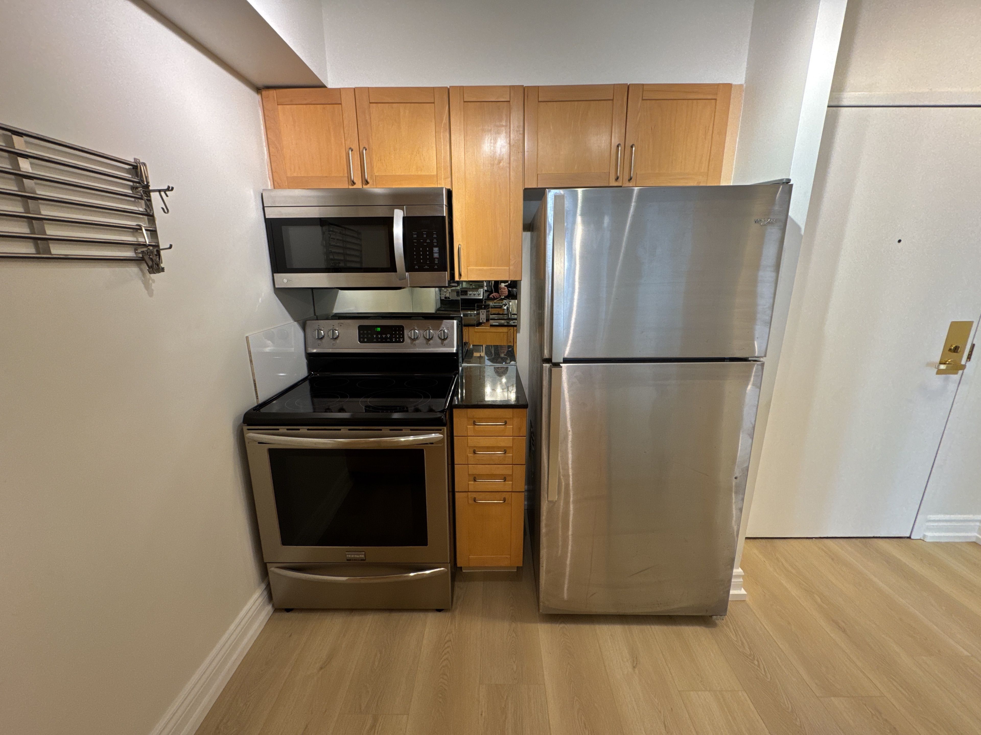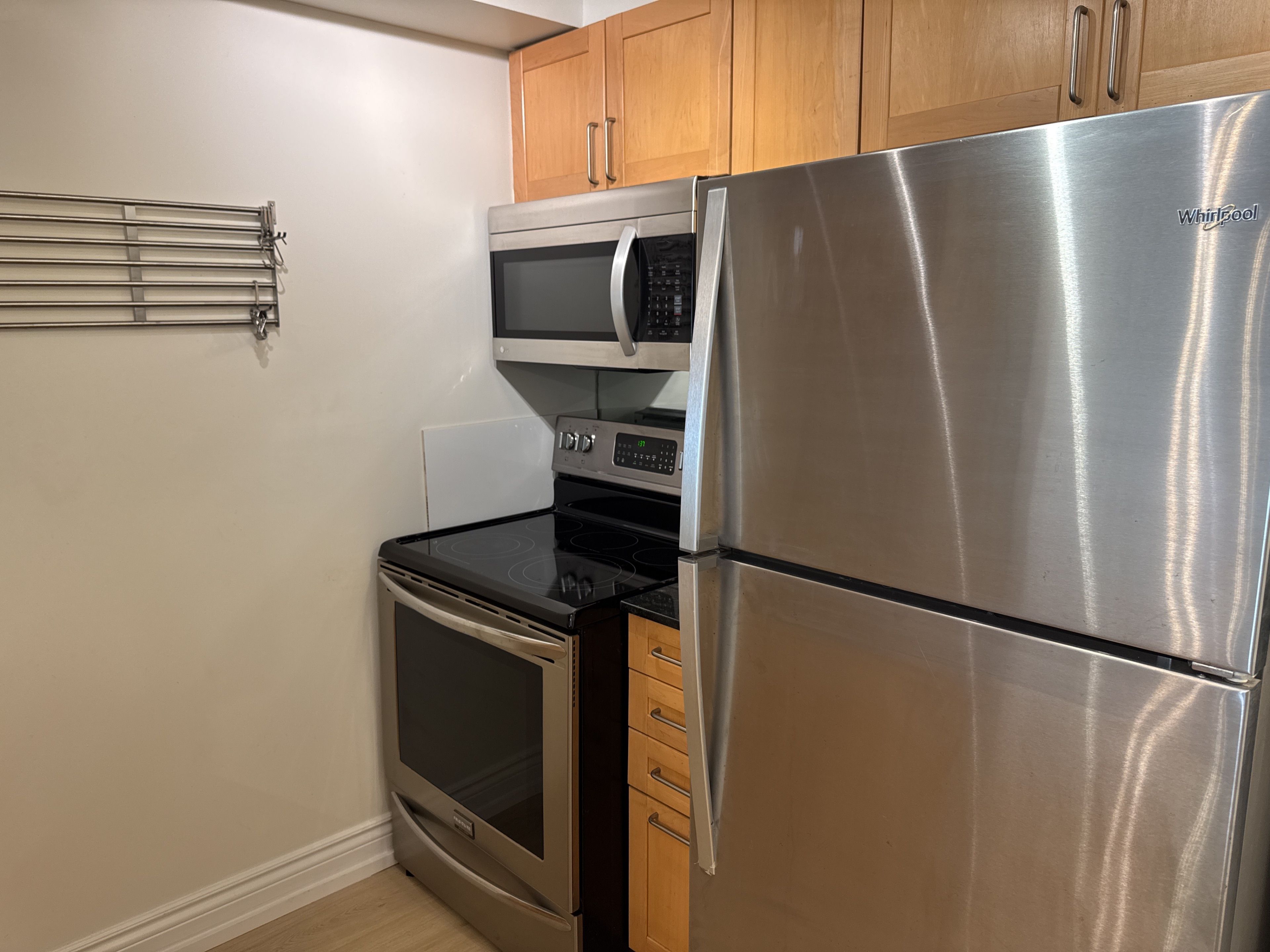 • Modern stainless steel appliances and granite counters in the kitchen.