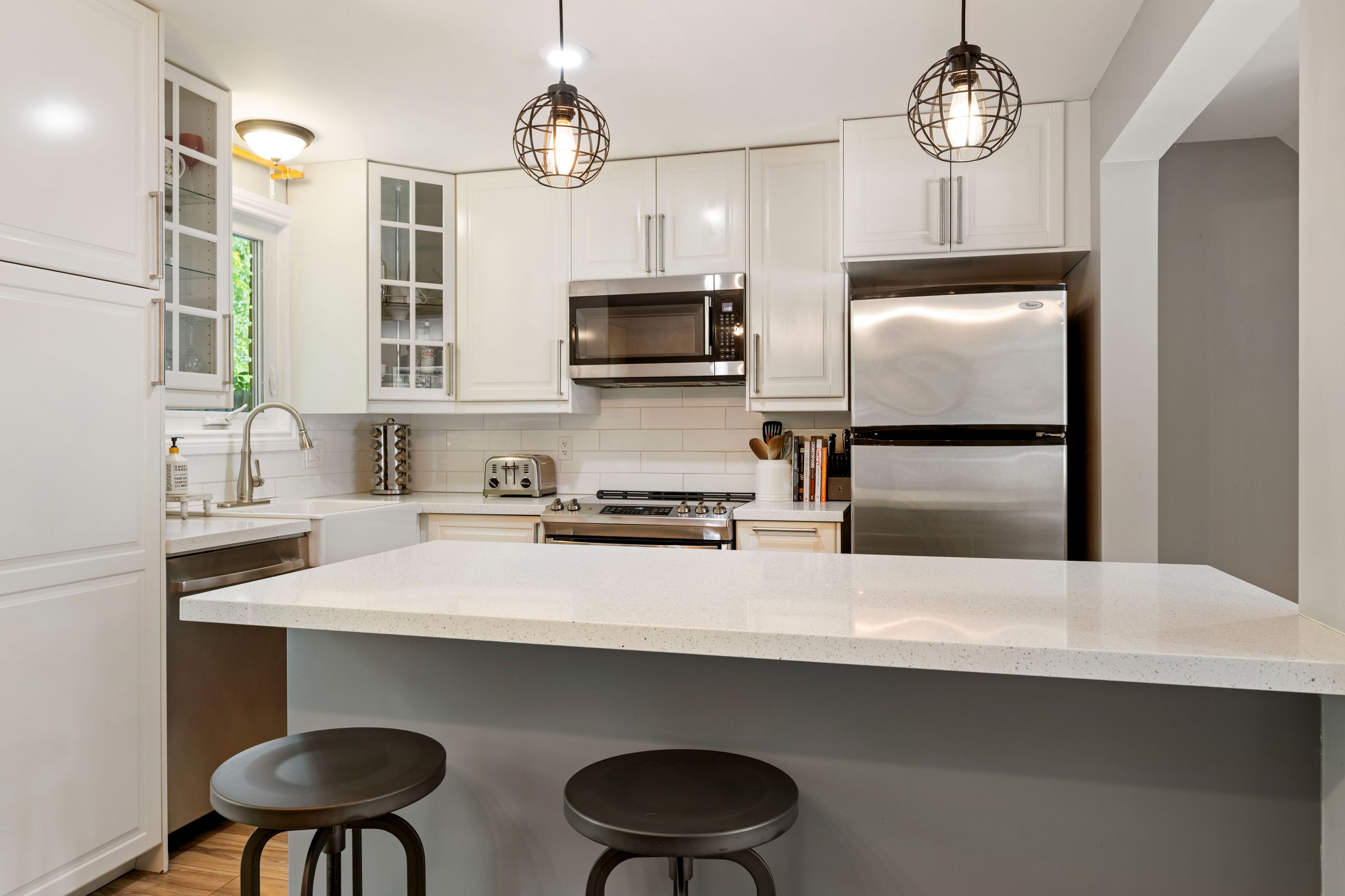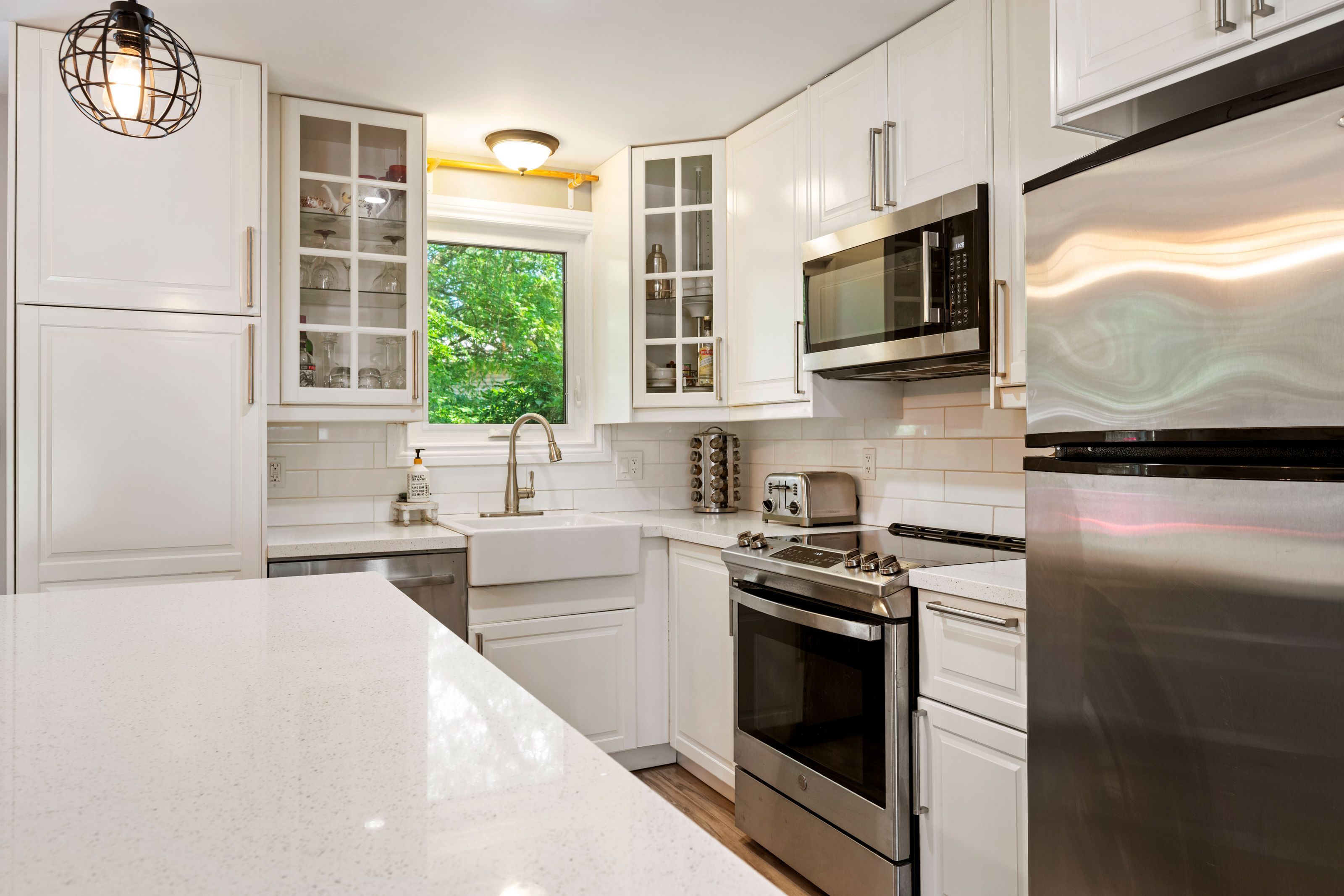 • Updated kitchen with quartz countertops and stainless steel appliances.
