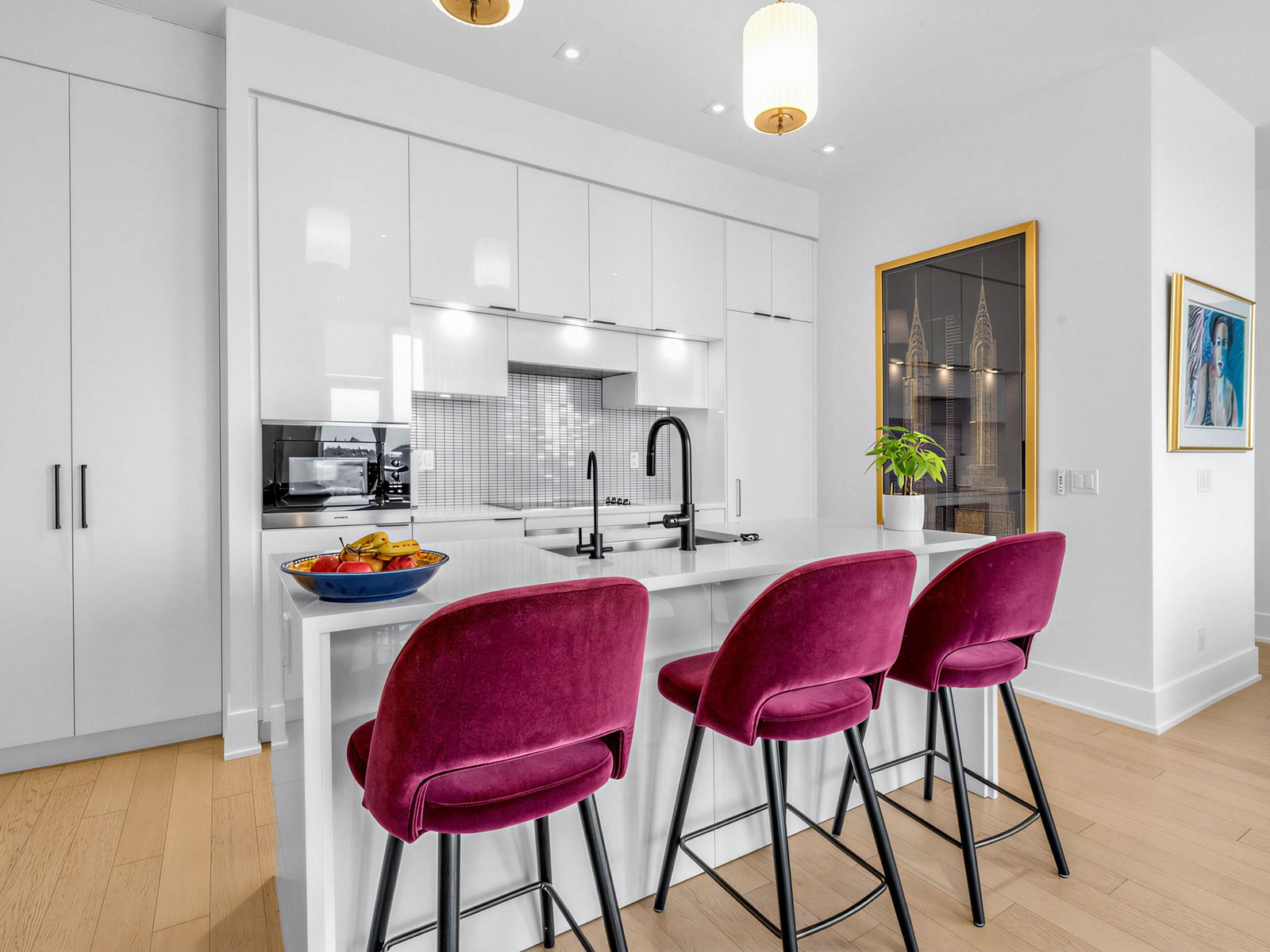 • Modern chef's kitchen featuring a hidden café station and generous island.