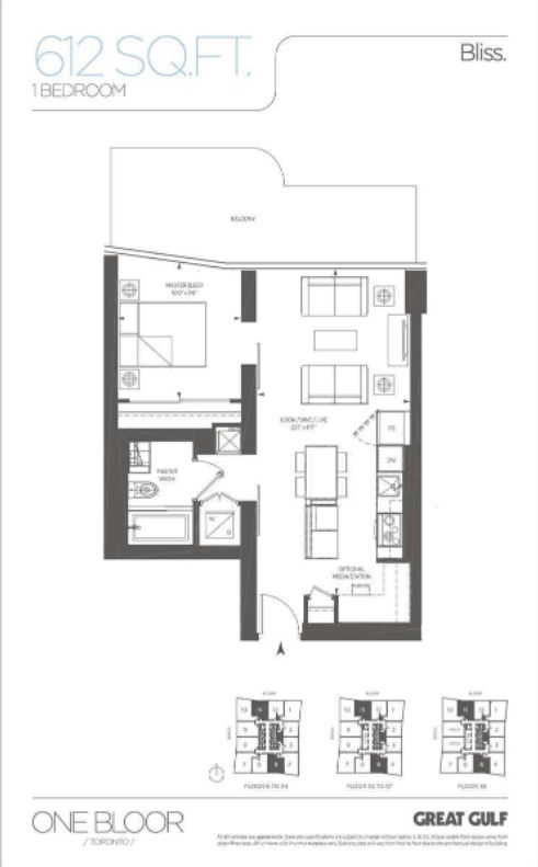 • Spacious 1 bed + media center layout for versatile living.