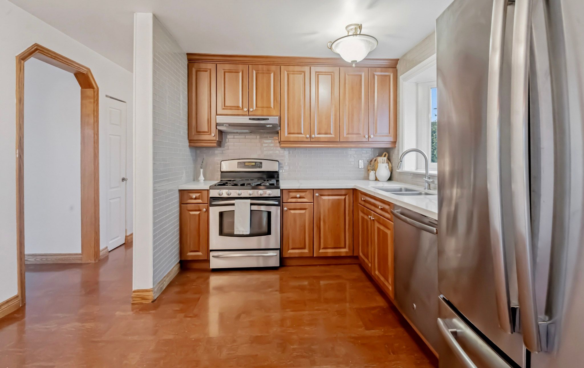 • Newly renovated kitchen with quartz countertops and hardwood flooring.