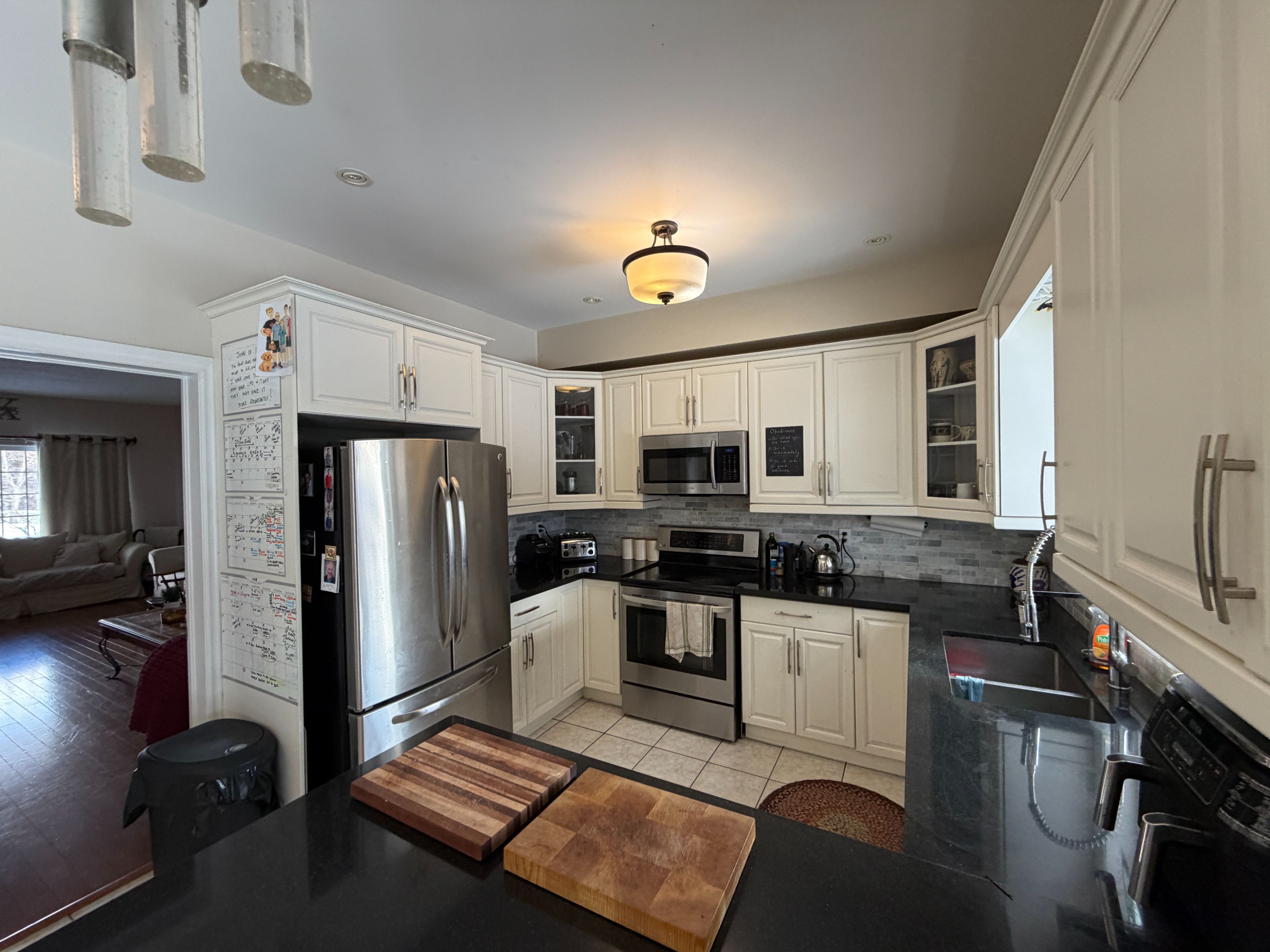 • Modern kitchen with granite countertops and hardwood flooring.