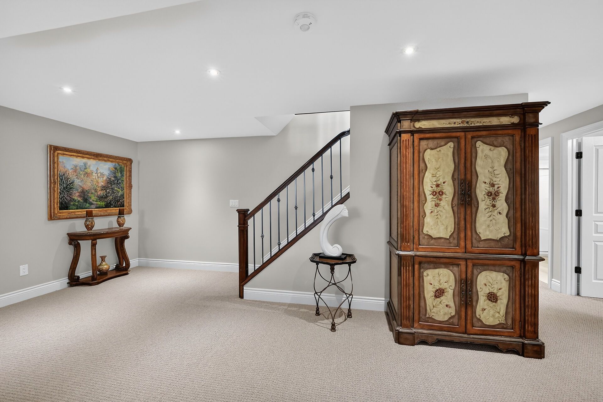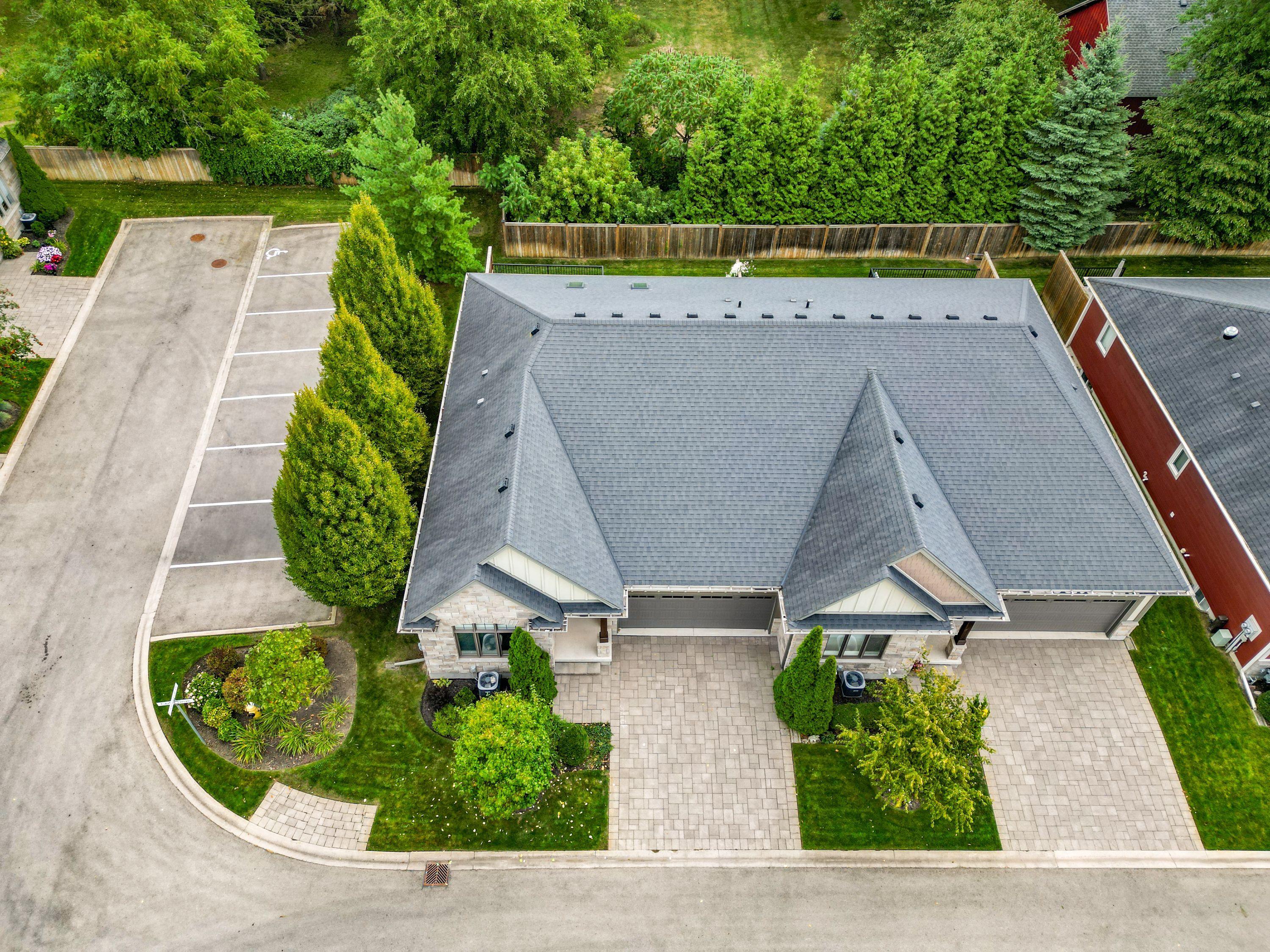 Stunning st. Davids bungalow townhome: unrivaled privacy & master craftsmanshipexperience maintenance-free luxury in this executive end-unit bungalow townhome, perfectly situated in the prestigious st. Davids community. From the moment you arrive, the stone exterior, interlock double drive, and professional landscaping set a sophisticated tone. The interior reveals over 2,200 sq. Ft. Of refined living space defined by cove ceilings, low-sheen hardwood, and california shutters. The chef-inspired kitchen features premium solid-surface counters, an expansive breakfast bar, and an abundance of cabinetry. Bathed in natural light from skylights and vaulted ceilings, the living room offers a cozy gas fireplace-the heart of the home. Retreat to the primary suite featuring a walk-in closet and private ensuite, or host guests in the airy front bedroom with its own vaulted ceilings. The fully finished lower level feels like an extension of the main floor, boasting large windows in every room, a spacious rec room, two additional bedrooms, and a 3-piece bath. Step outside to your private oasis: a large composite deck with an electric awning overlooking a serene, treed view. Low condo fees cover snow and lawn care, ensuring a lifestyle of pure relaxation.