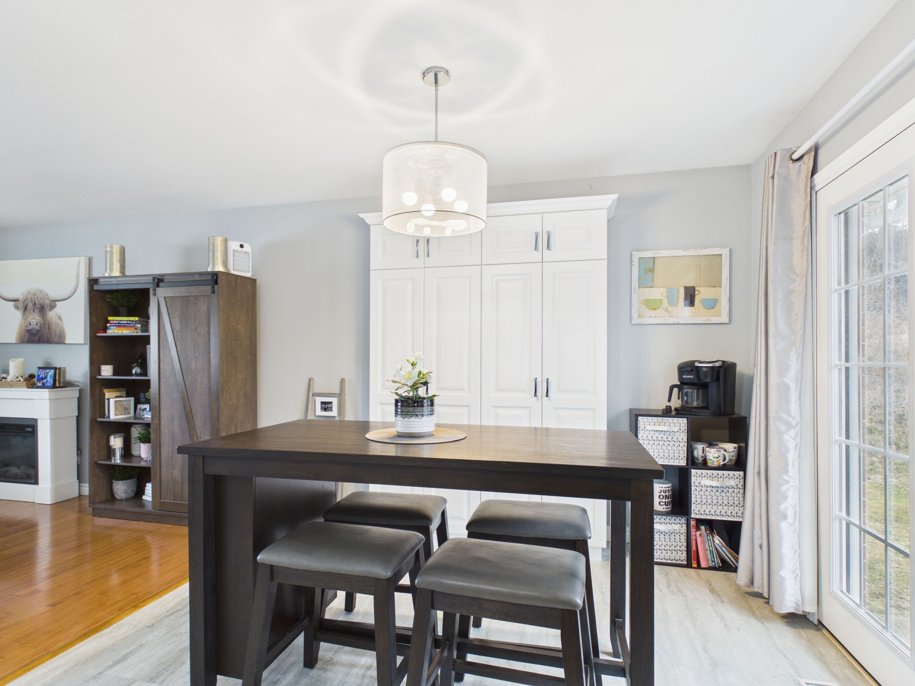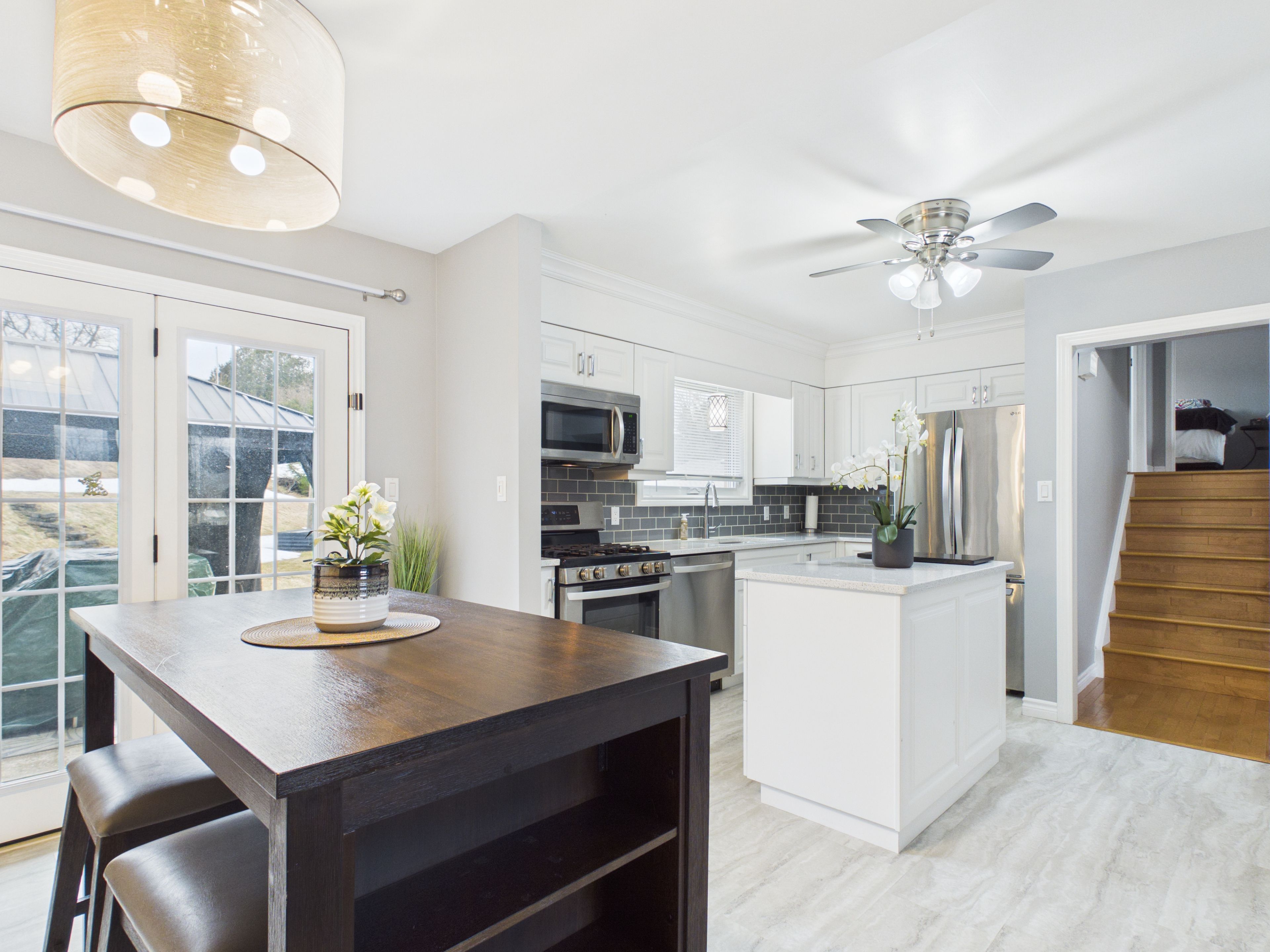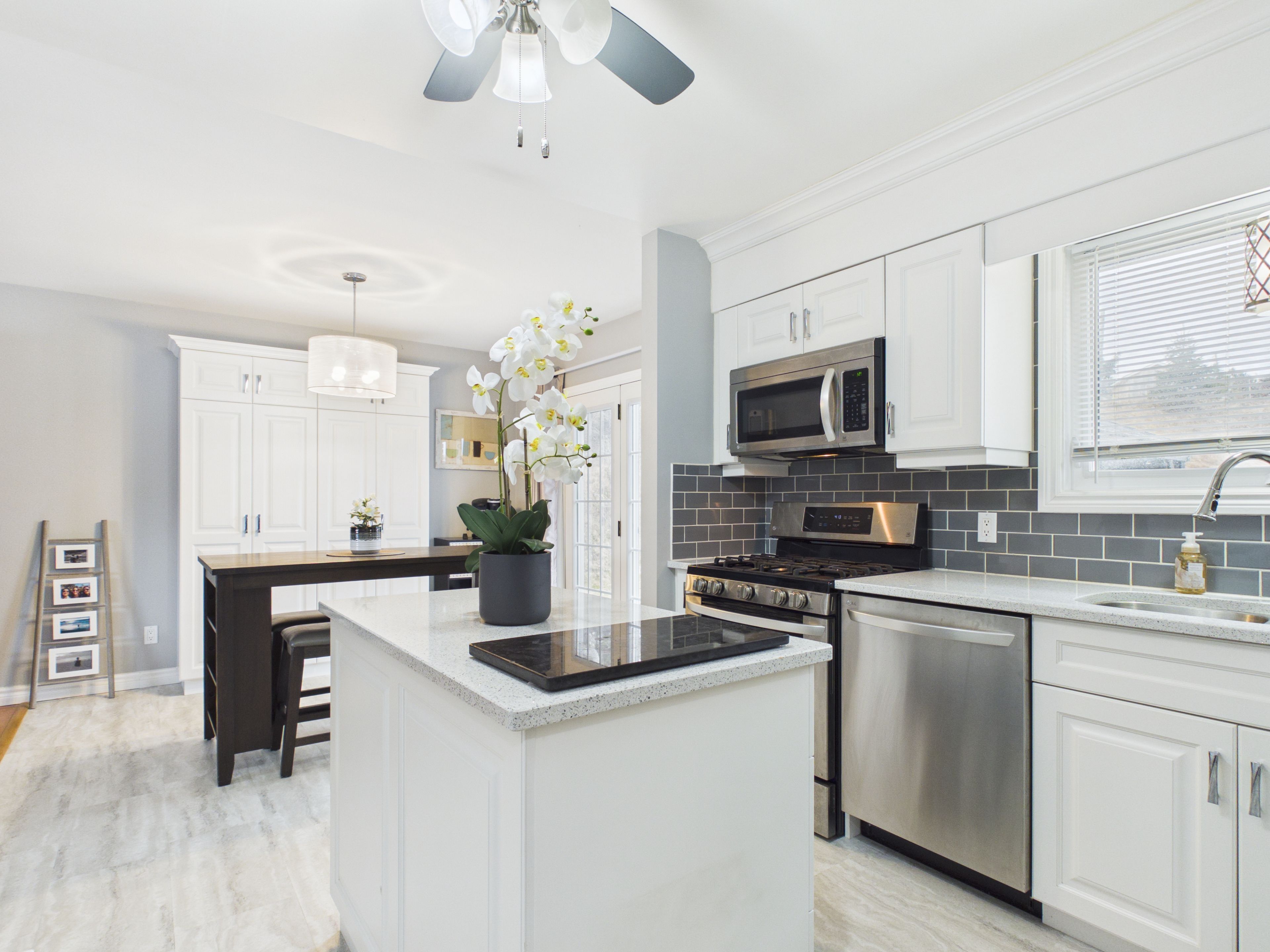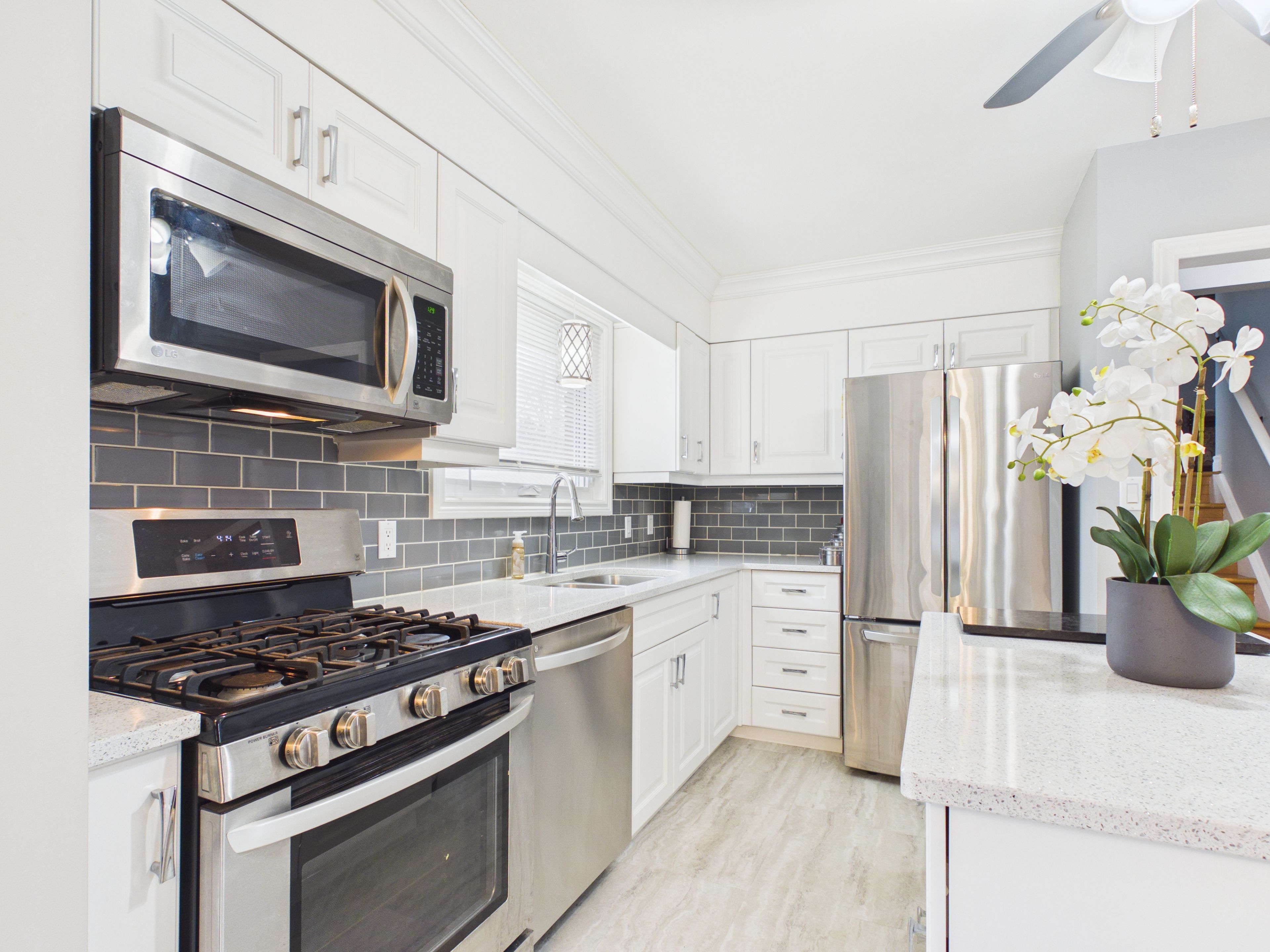 • Renovated eat-in kitchen with stylish quartz countertops and appliances.