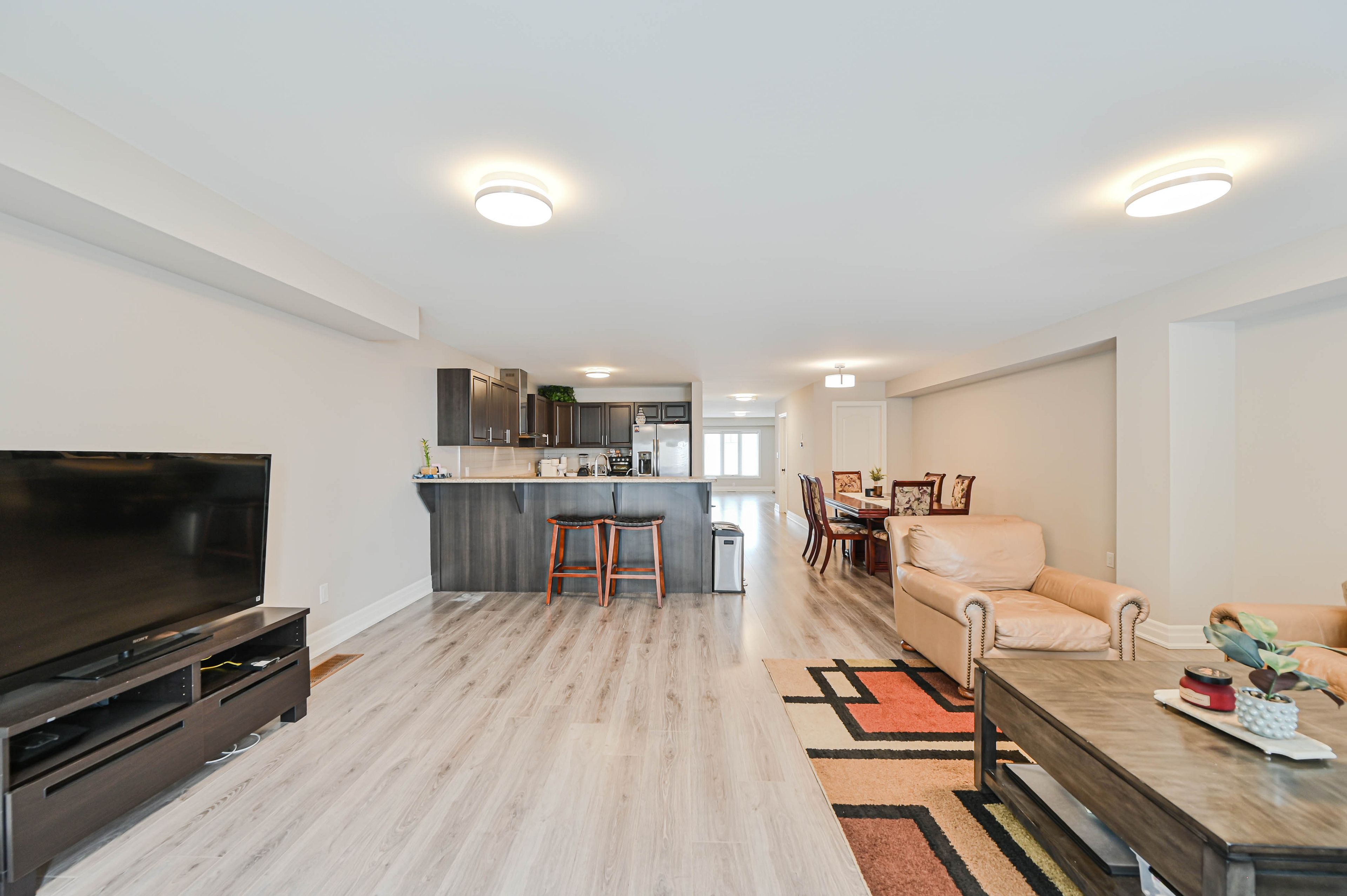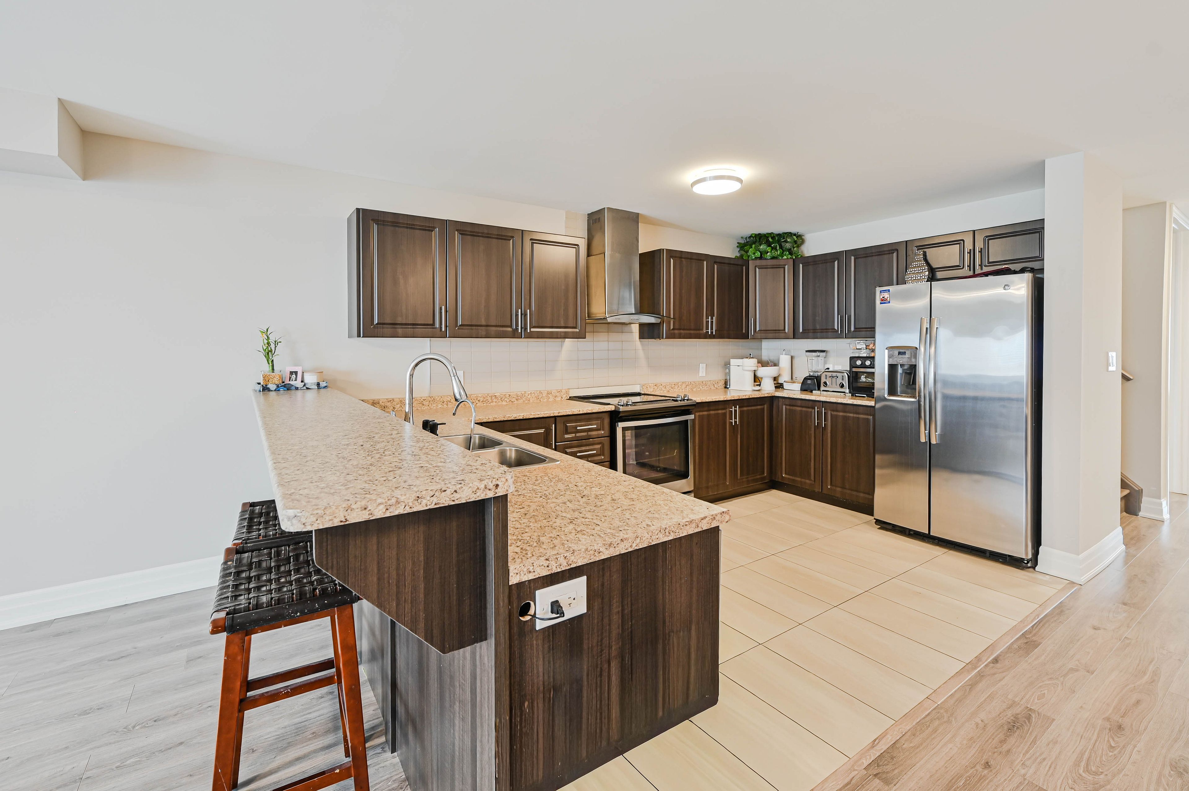 Absolutely gorgeous 2576 square feet with finished basement freehold end-unit townhouse that feels like a semi with side yard. Four spacious bedrooms on 2nd level, 3 bedrooms with w/i closet. Laundry on 2nd level as well for your convenience and another in basement. This residence is thoughtfully designed for comfort and style. The open-concept main floor is bright and inviting with access to deck from family room and laminate floors that flow seamlessly throughout. Fresh paint add to the homes charm. Water softener installed for whole house with extra water filter installed in main kitchen. The finished lower level offers a versatile space with a fifth bedroom with w/i closet. Separate laundry, kitchen with fridge stove and dishwasher in basement ideal for extended family, guests or extra income. Enjoy the convenience of direct garage and backyard access from the basement. Located in walk in distance to shopping, school, parks public transit and go station.