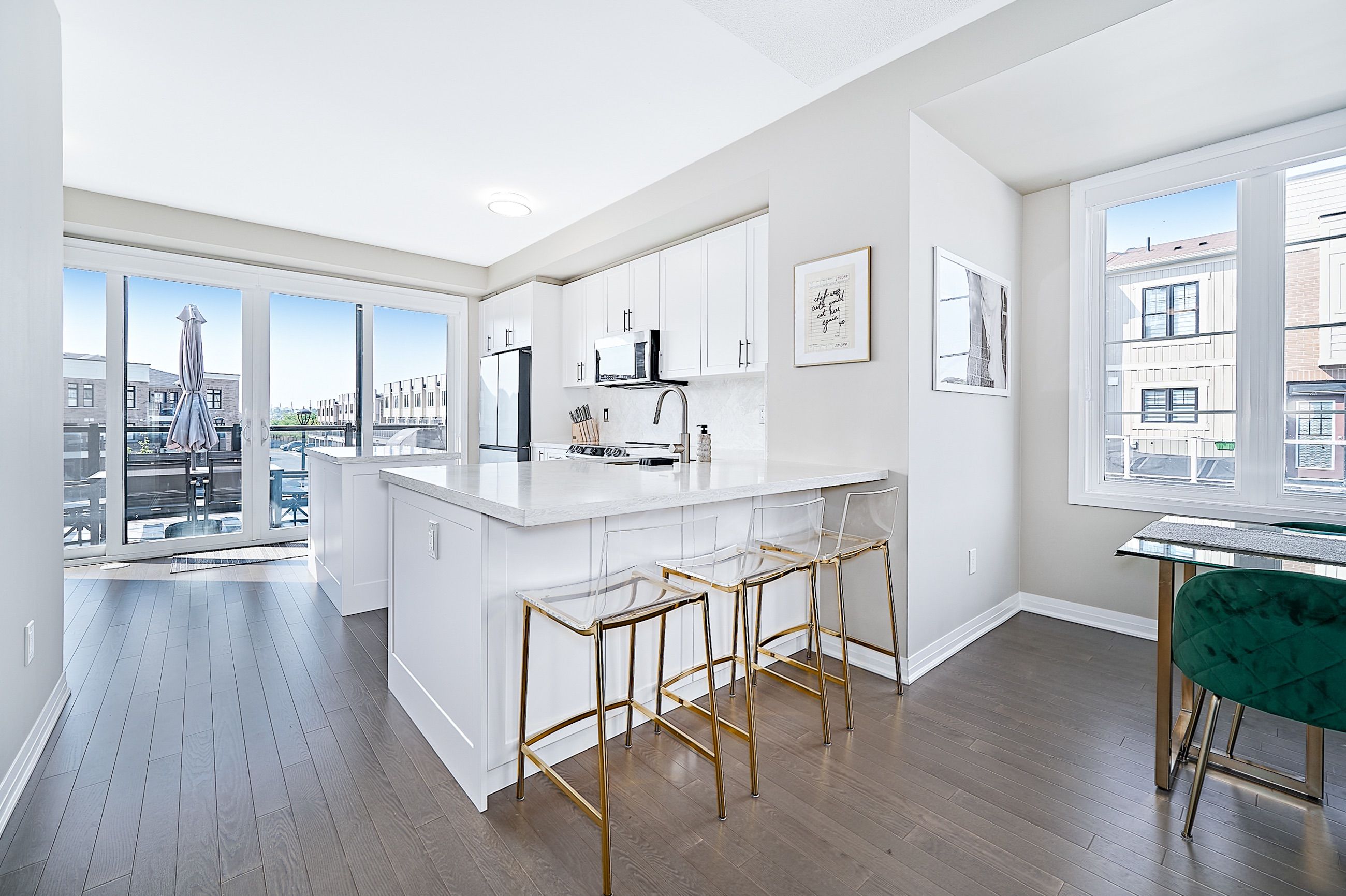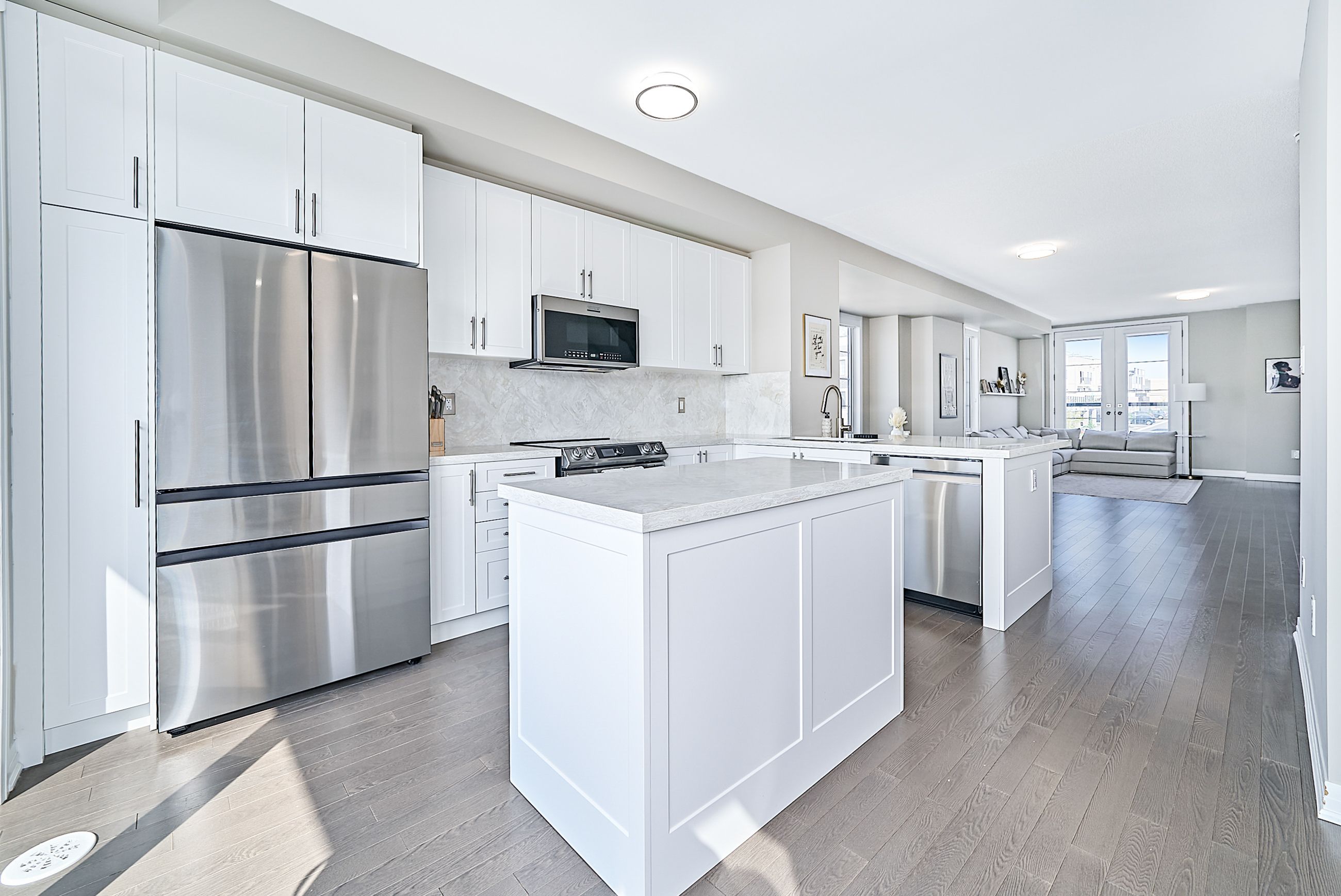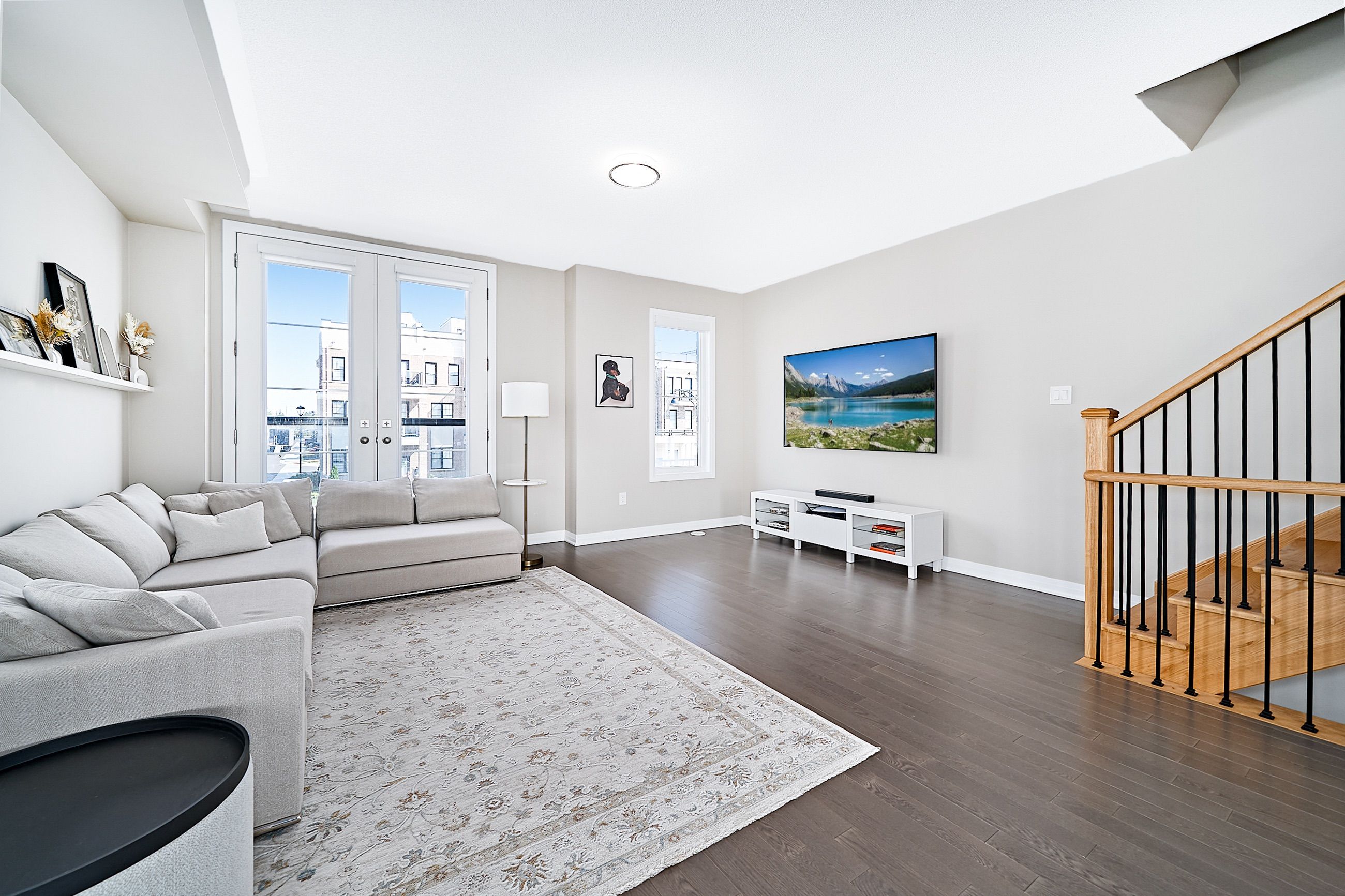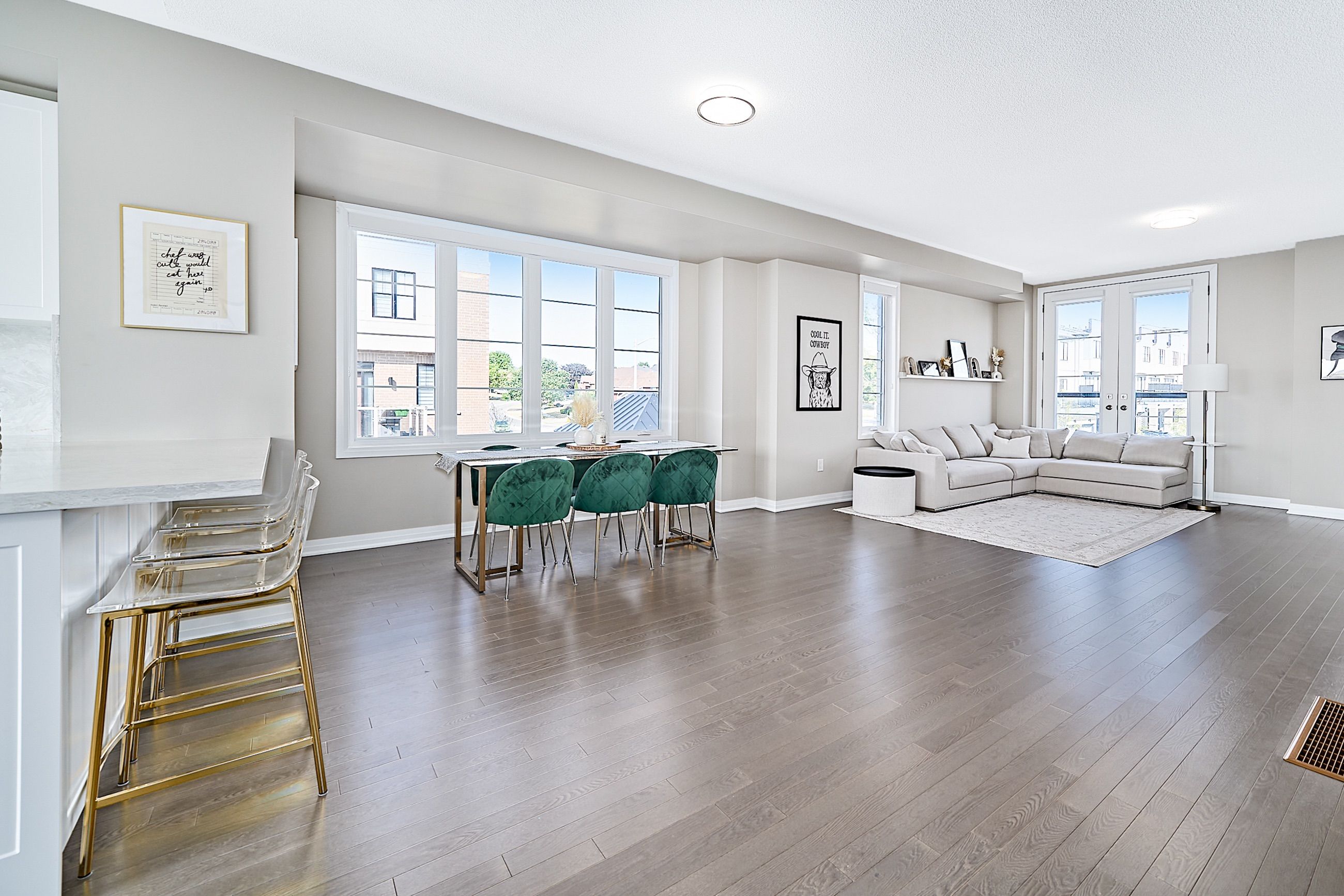 This exquisite 4-bedroom, 4-bathroom end-unit townhouse spans over 2,200 sq ft. - where over $50,000 in premium upgrades elevate modern luxury. Boasting 9-foot ceilings throughout, this home features an open-concept main level with massive windows, flooding the space with natural light and showcasing gleaming hardwood floors that extend to the staircase. Custom blinds offer uv protection while ensuring the sunlight fills the home. The gourmet kitchen, renovated in 2024, is a chefs dream with a stainless steel samsung bespoke double-door fridge featuring an auto-filling water jug and dual ice cube sizes, a matching bespoke stove, dishwasher, and over-the-range microwave. Quartz countertops and backsplash add elegance, while the coffee bar (2025) includes a quartz counter, pot lights, pantry, appliance garage, and bar fridge. Large sliding glass doors lead to a 200 sq ft balcony, perfect for entertaining. The lower level offers a versatile bedroom or office, full bathroom, and mudroom, ideal for guests. Upstairs, the primary suite impresses with a walk-in closet and a luxurious 3-piece ensuite with a walk-in shower and quartz countertop. Bedroom 2 features a private balcony, and a 240 sq ft rooftop terrace provides a stunning retreat. A main-floor powder room adds convenience. 2 car driveway plus 1. 5 garage parking spaces. Located in a vibrant townhouse community with a kids playground, this home is steps from an elementary school, high school, tennis courts, park, and splash park. Enjoy proximity to shopping, restaurants, coffee shops, and the bowmanville go station. Historic downtown bowmanville, trails, and the beachfront are a short drive away. With extensive upgrades and an unbeatable location, this townhouse is a rare gem!