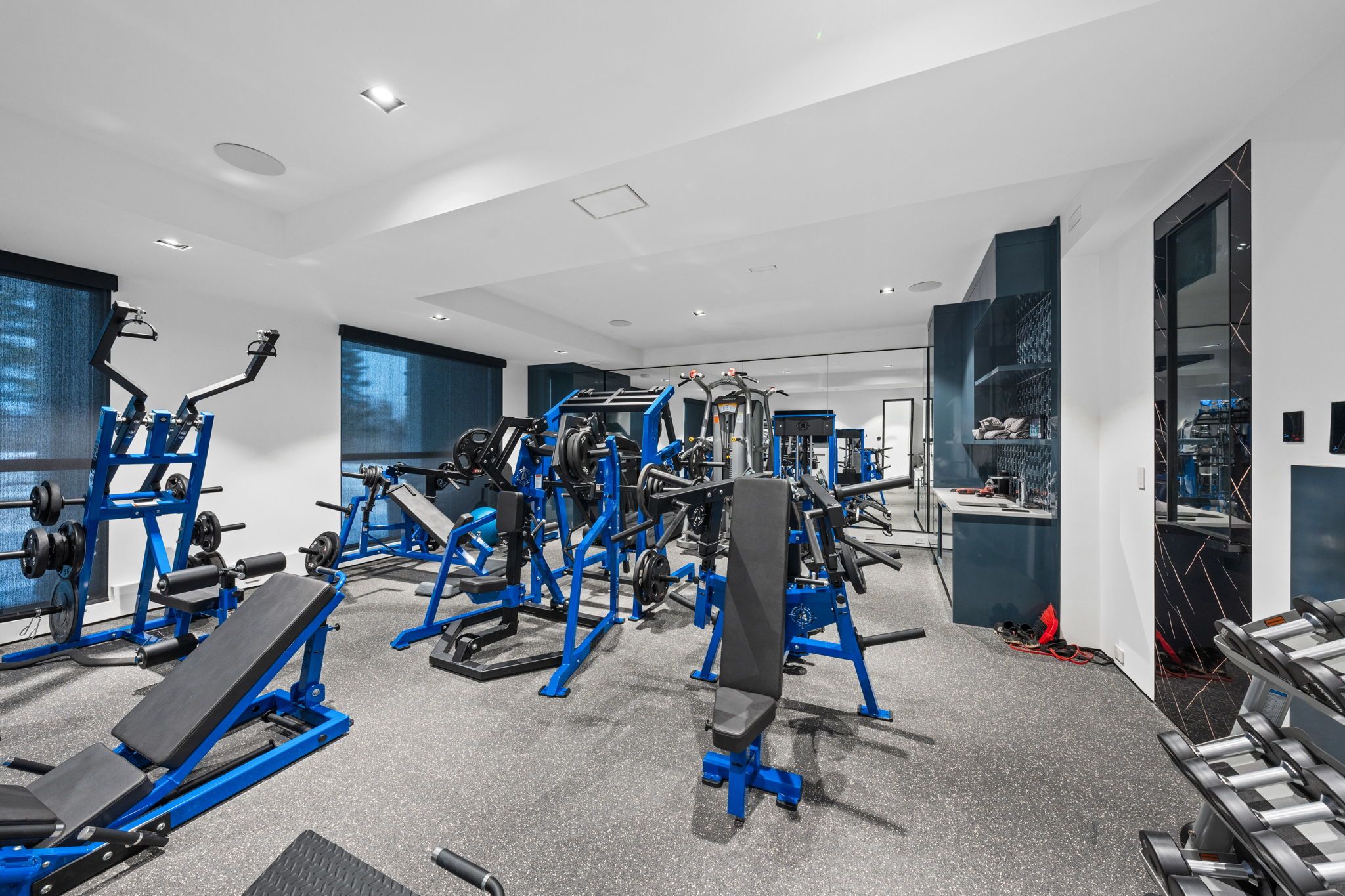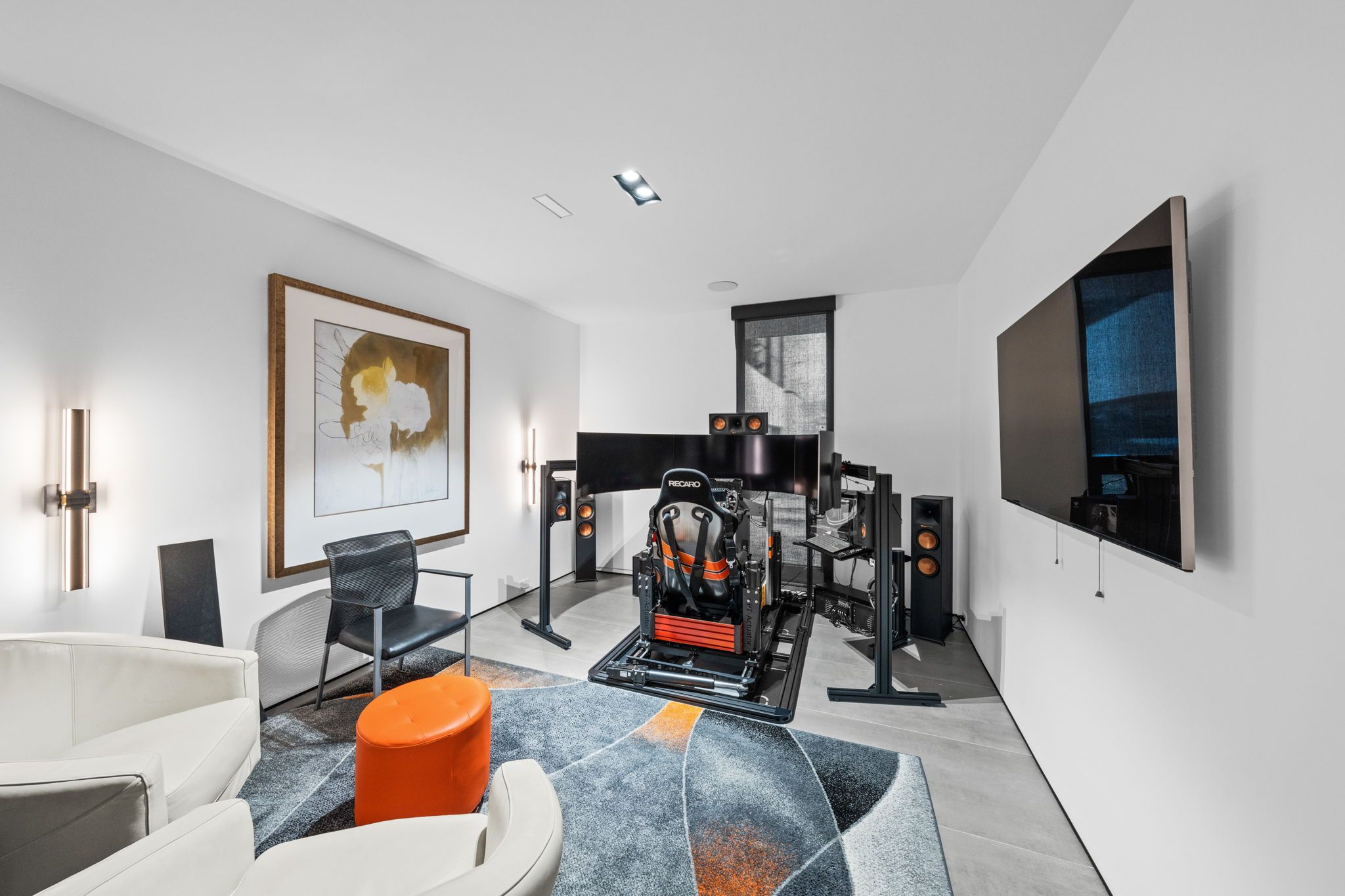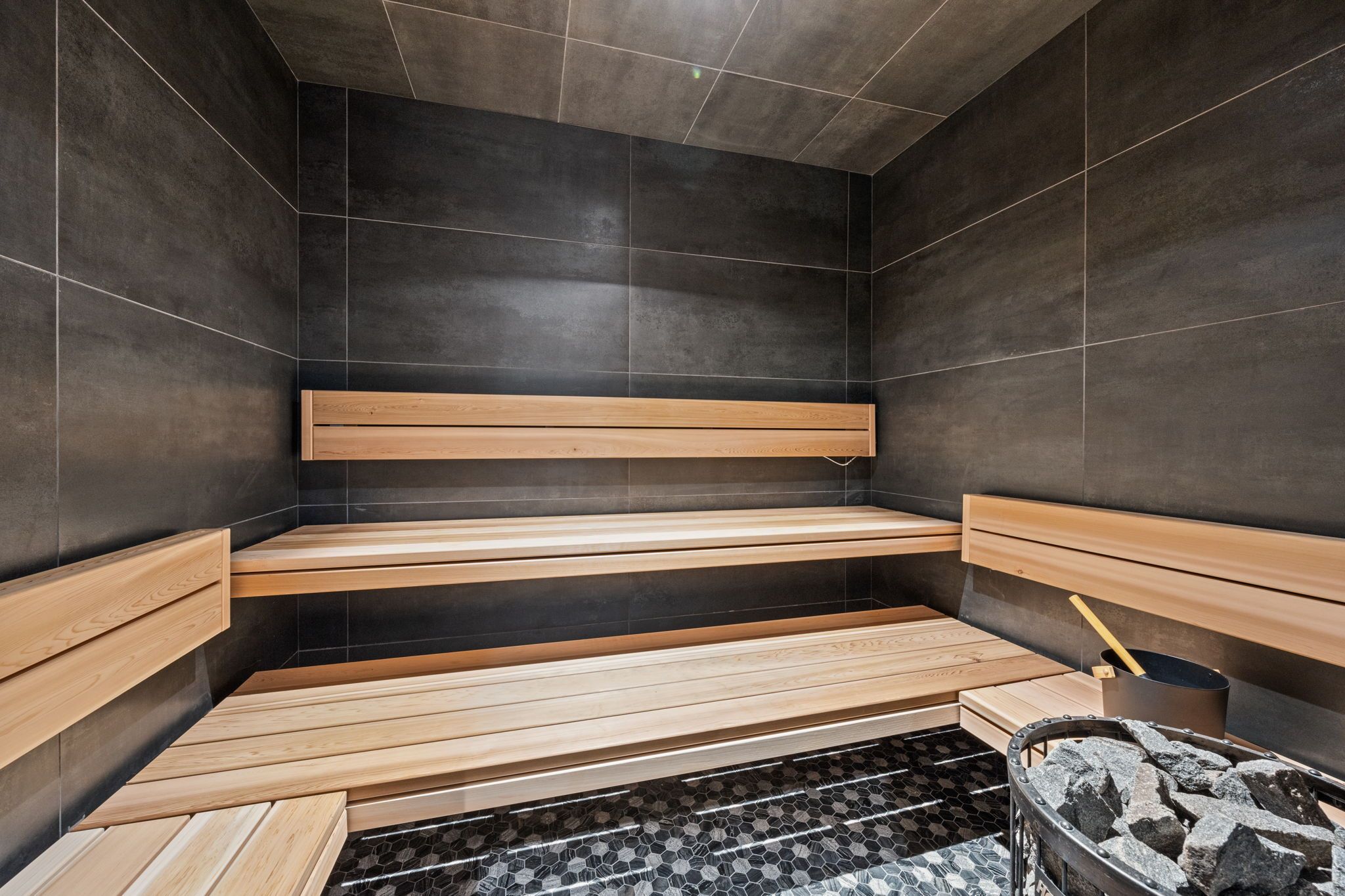 • Private wellness area featuring sauna, fitness room, and cinema-quality theatre.