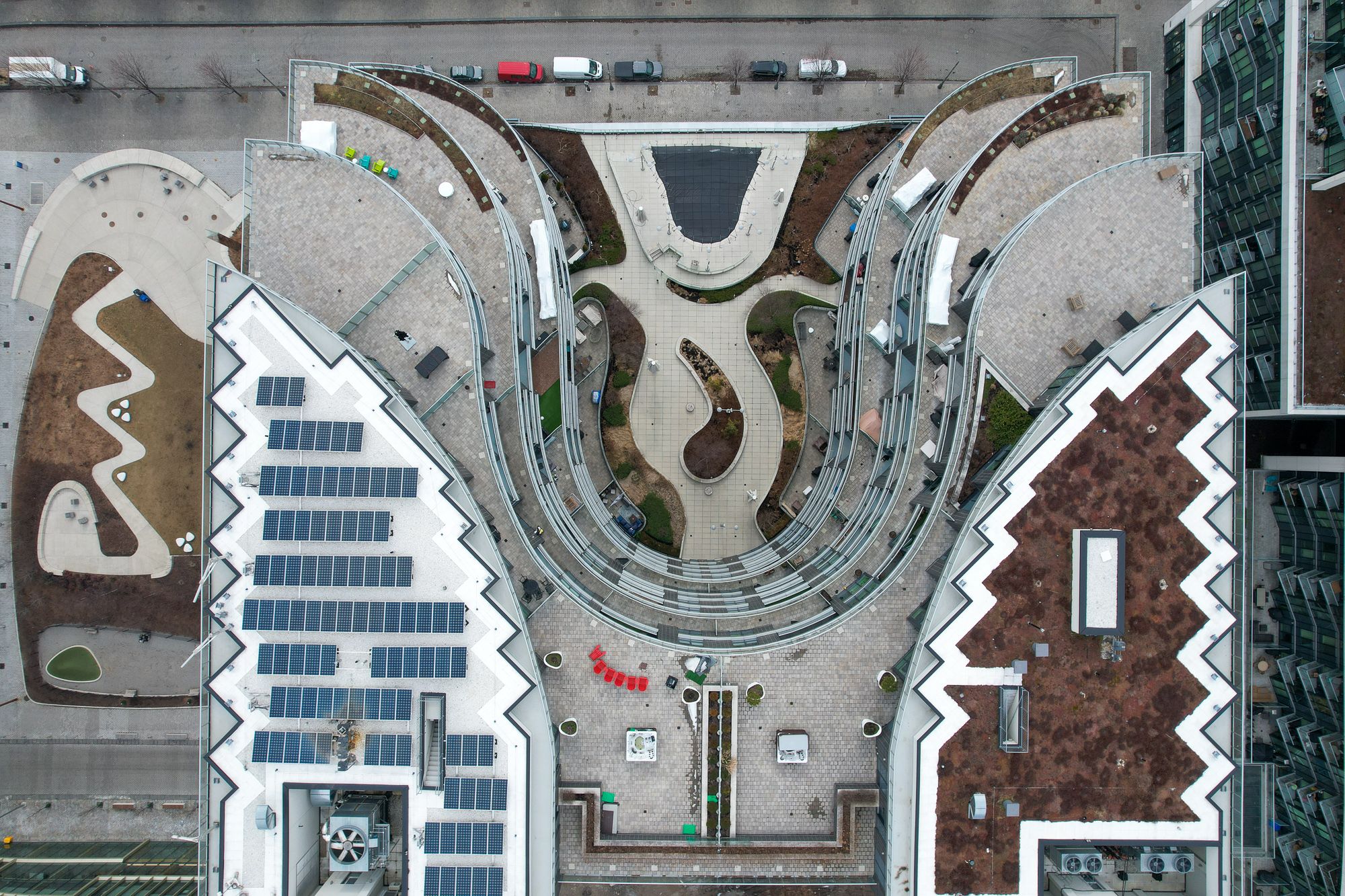 • Stylish kitchen with integrated appliances and quartz countertops.