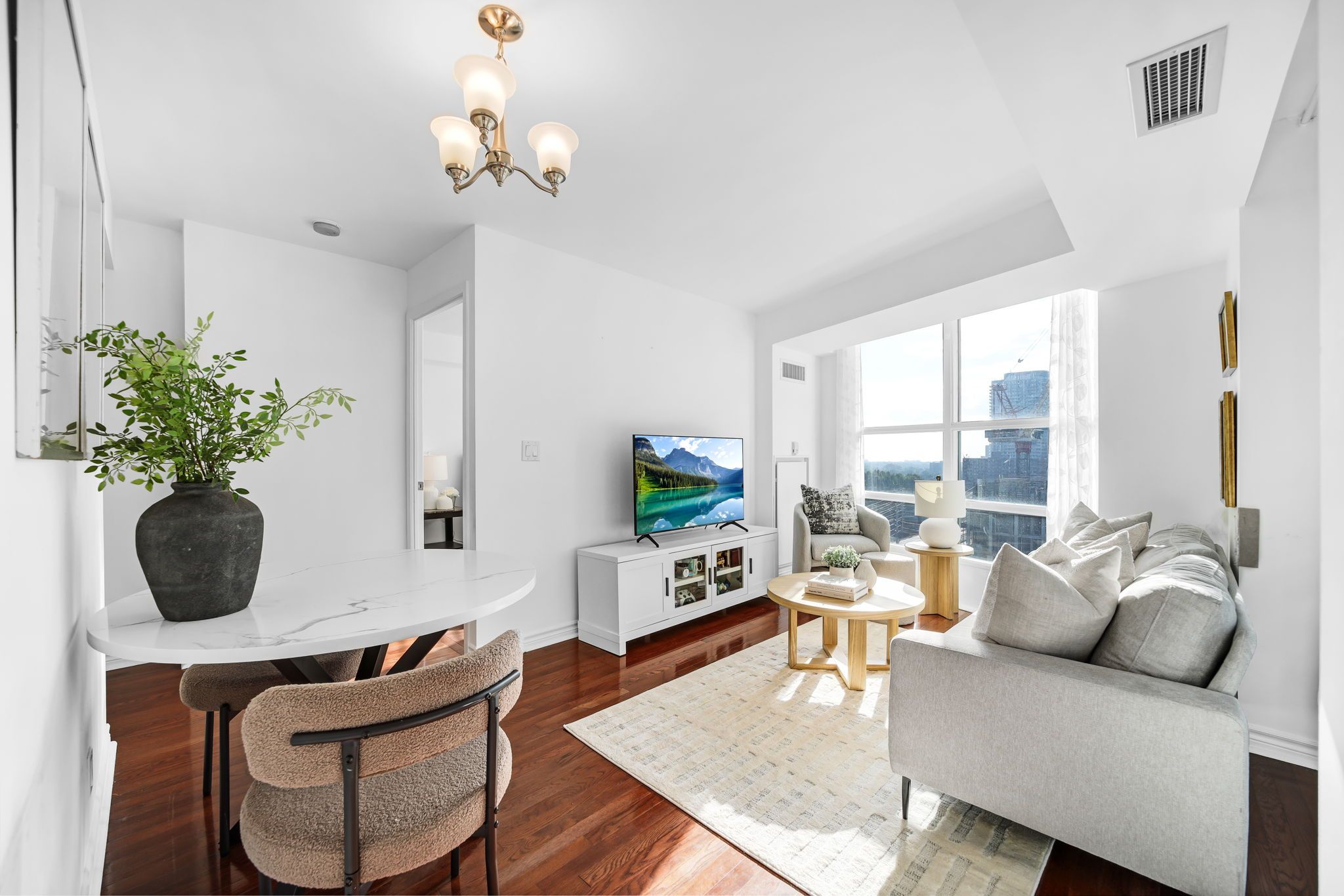 Immaculate daniels-built corner suite featuring 2 spacious bedrooms and 2 full bathrooms, ideally situated in the vibrant core of mississauga. Just steps from square one mall and the upcoming lrt line, this luxury condo showcases upgraded hardwood flooring throughout and breathtaking views from the balcony, living room, kitchen, and both bedrooms. The thoughtfully designed layout places bedrooms on opposite sides for added privacy, while the eat-in kitchen offers a welcoming breakfast area. The primary ensuite features a relaxing spa-style soaker tub, perfect for unwinding after a long day. This well-maintained building is known for its low maintenance fees and exceptional amenities, including a saltwater indoor pool, modern fitness centre, 24-hour concierge, guest suites, party and meeting rooms, library, billiards, recreation room, and ample visitor parking. A convenient variety store in the lobby adds everyday ease. Unbeatable central location within walking distance to public transit, future lrt, schools, parks, cafés, shops, restaurants, plazas, and office towers. Nearby landmarks include celebration square, living arts centre, city hall, and theatres. Quick highway access (403/qew/427/401/407) plus go train and bus services make commuting a breeze.