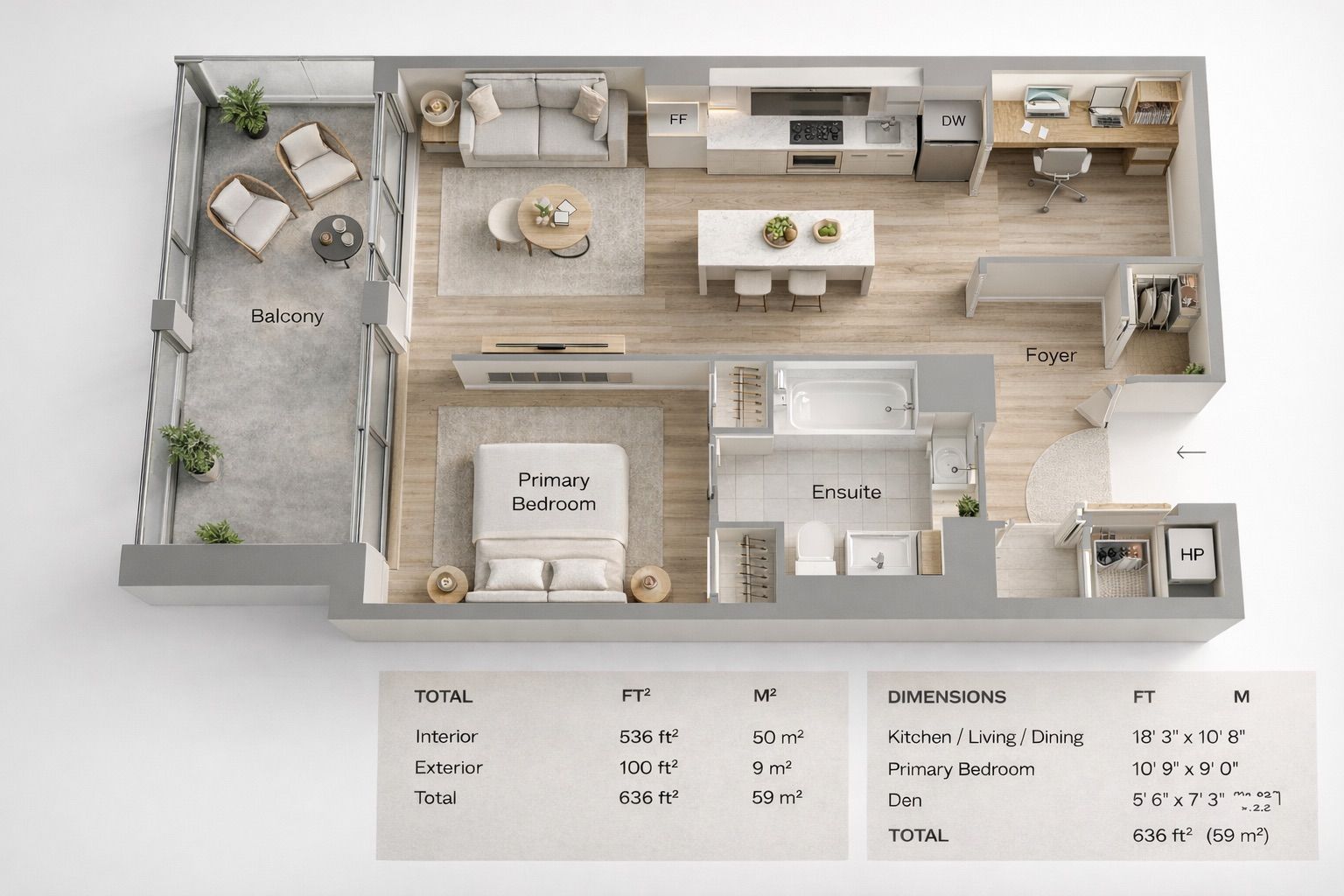 • Functional 1 bedroom + den with private balcony for extra space.