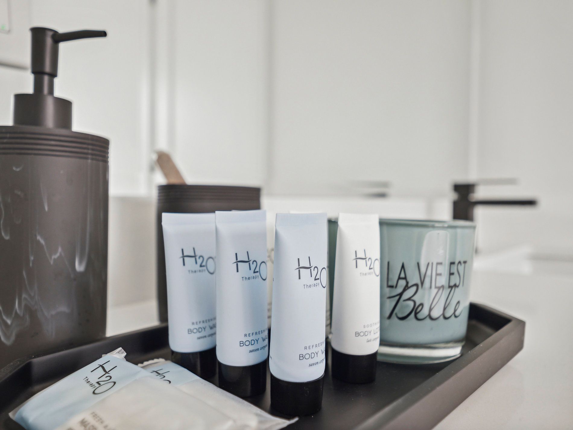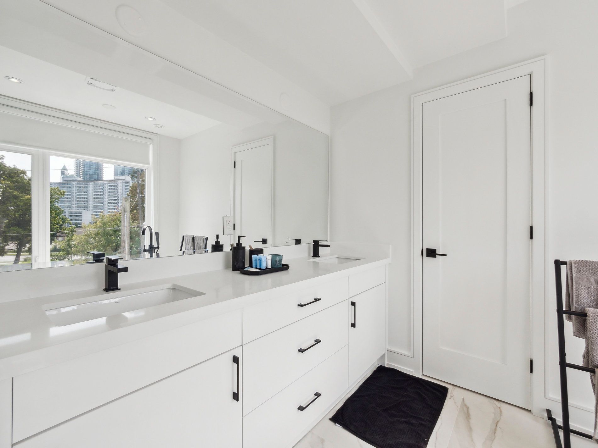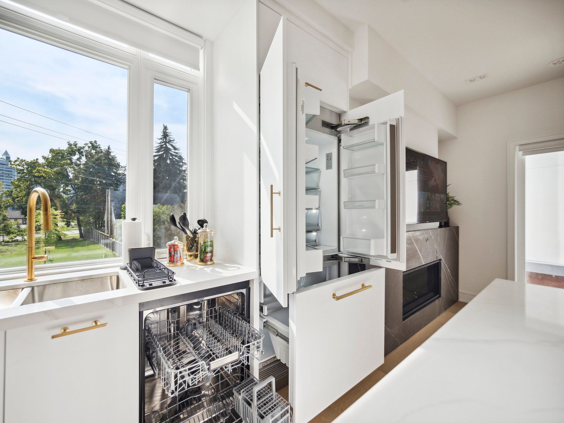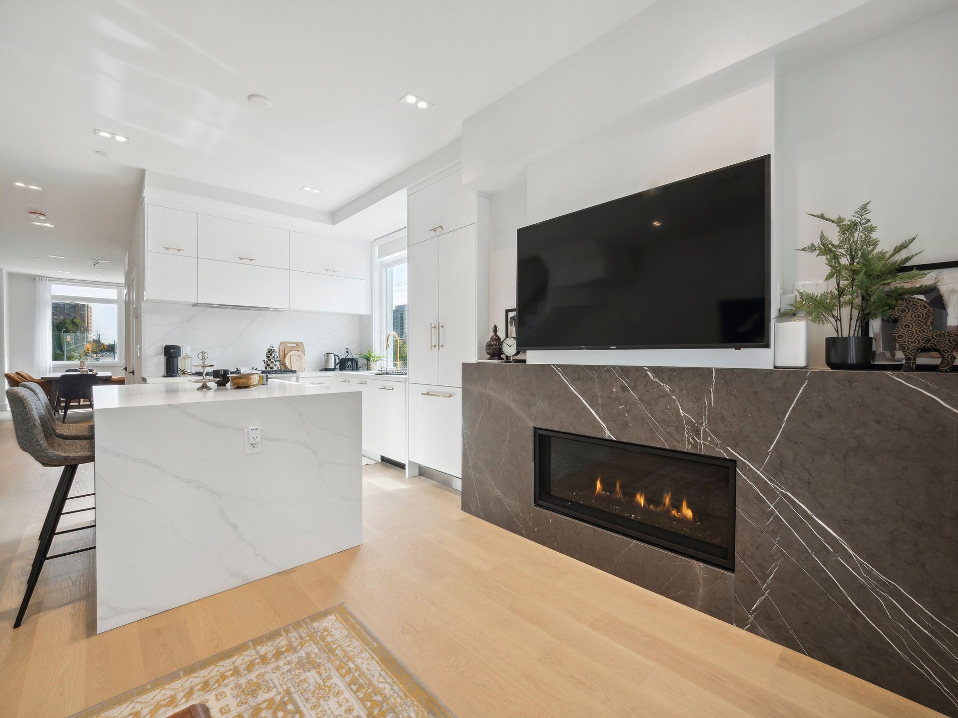 • Modern white kitchen with quartz countertops and luxury appliances.