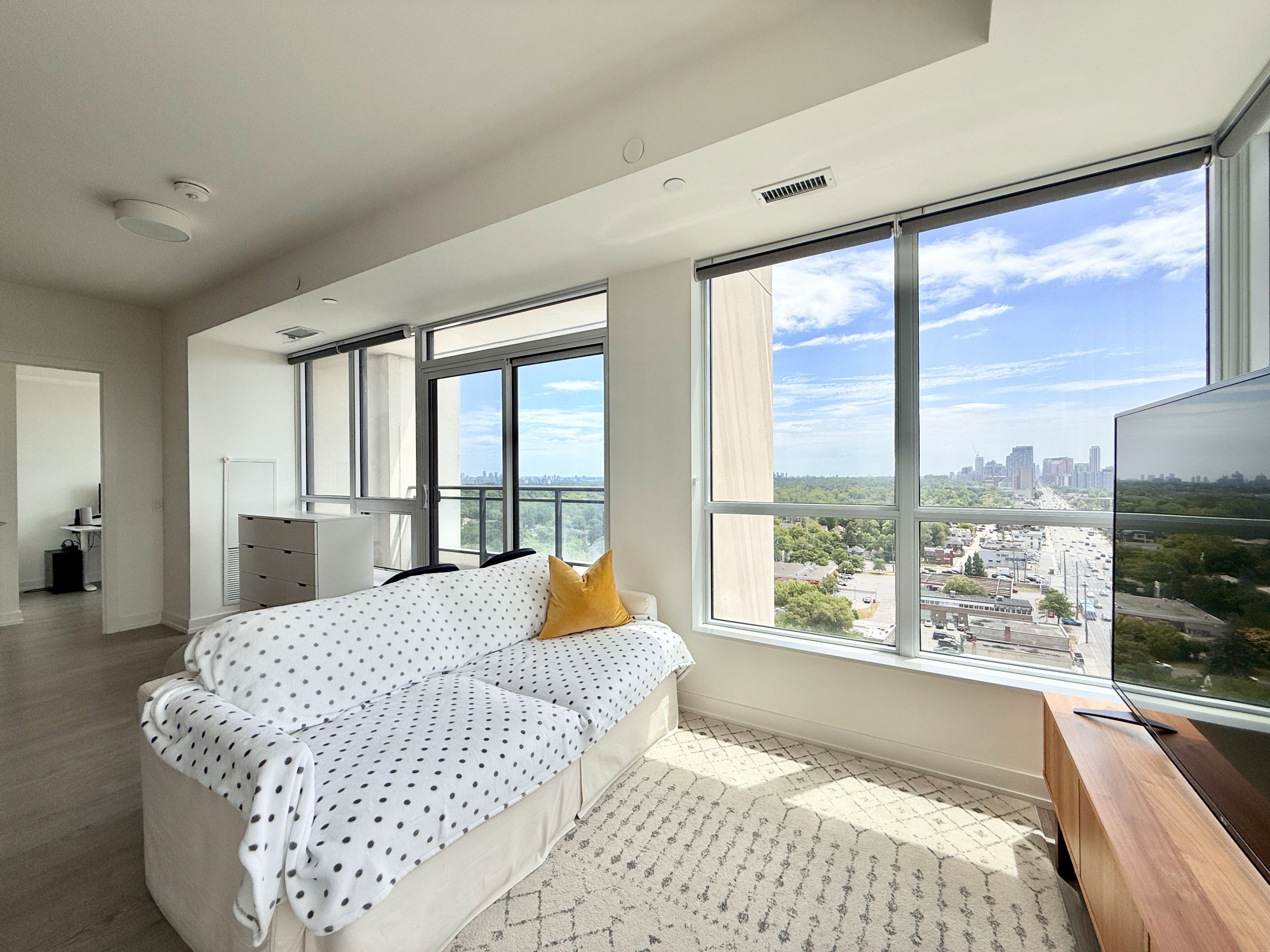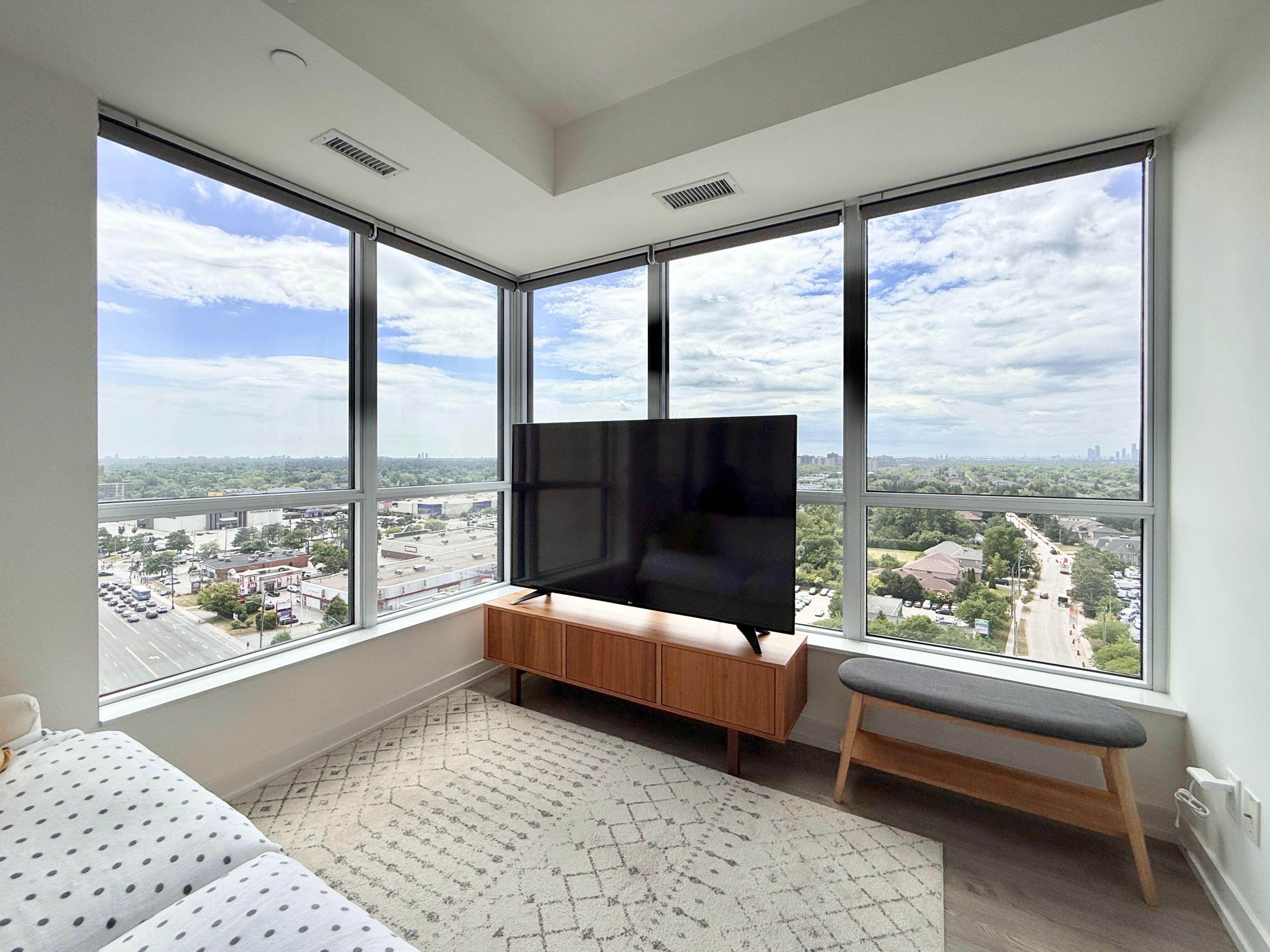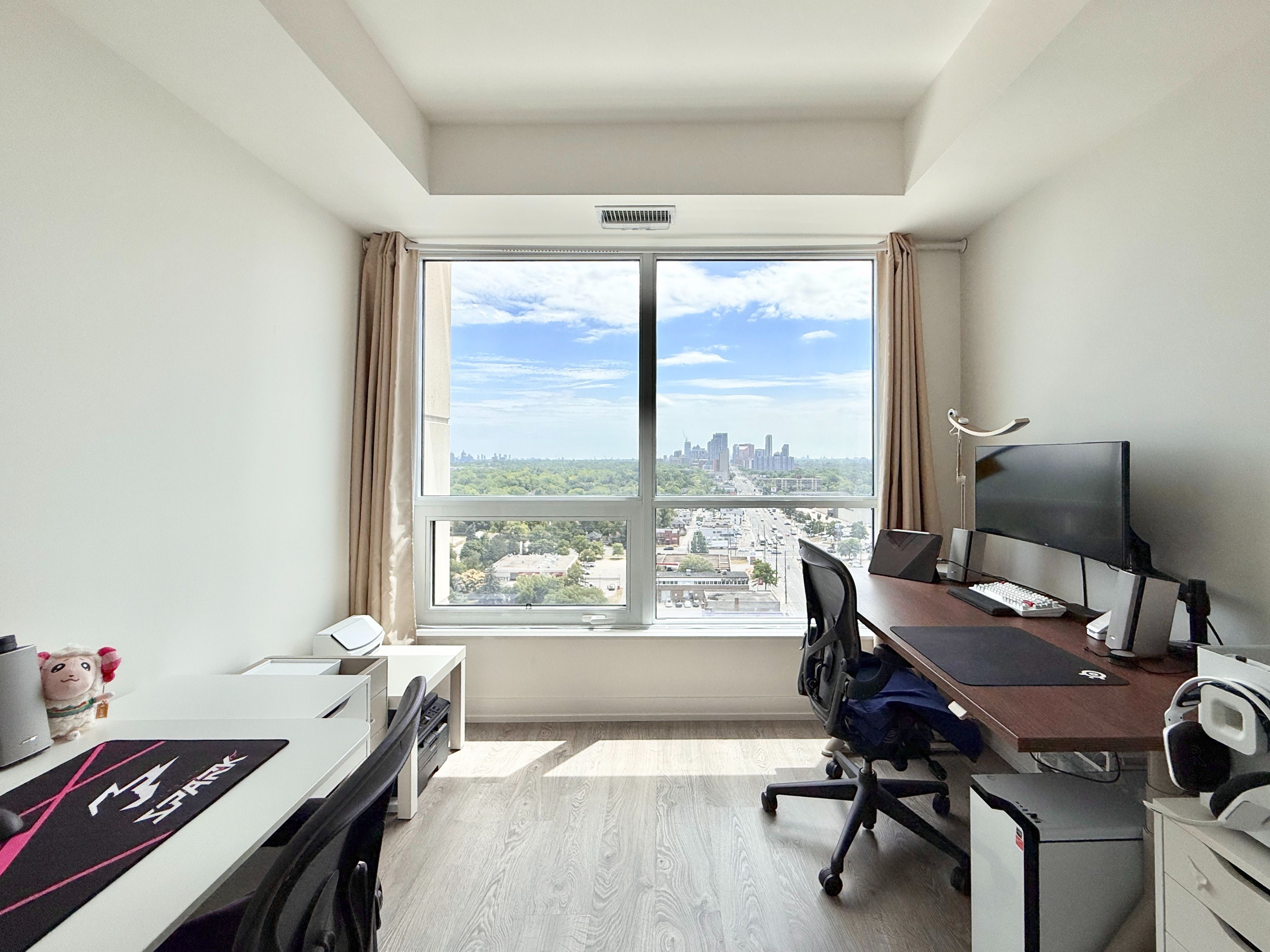 For lease at the vanguard! Experience luxury and comfort in this spacious condo offering over 1,000 sq. Ft. Of modern living space. This 2-bedroom, 2-bathroom suite includes a large denideal for a home office or third bedroom. Enjoy breathtaking, unobstructed south and west-facing views from both bedrooms, with floor-to-ceiling windows that fill the home with natural light. The primary bedroom features a private ensuite with double side-by-side sinks for added convenience. The upgraded kitchen offers an oversized fridge and an abundance of storage space for all your culinary needs. Step out onto your private 58 sq. Ft. Balcony and take in the city skyline. Located just steps from yonge & steeles, transit, and restaurants. Includes 1 parking spot and access to top-tier amenities: fitness & yoga rooms, theatre, saunas, guest suites, childrens playroom, library, and lounge/party room.