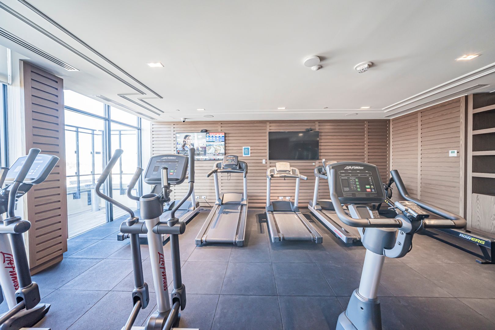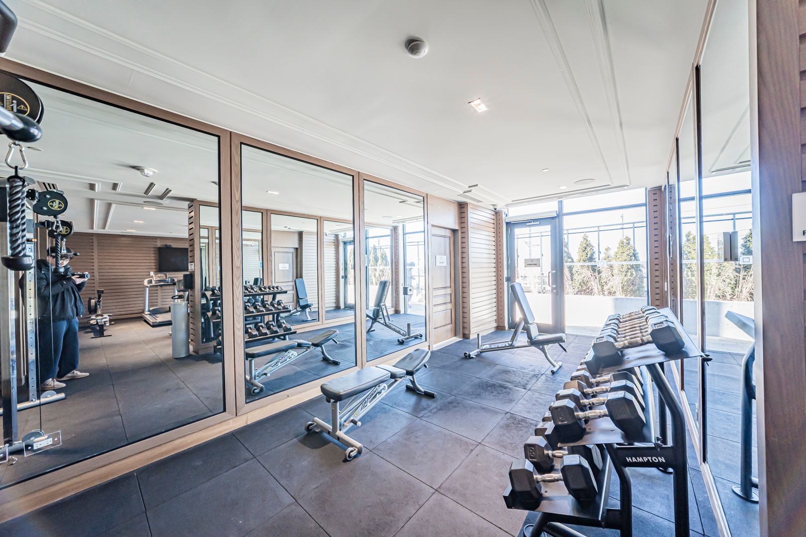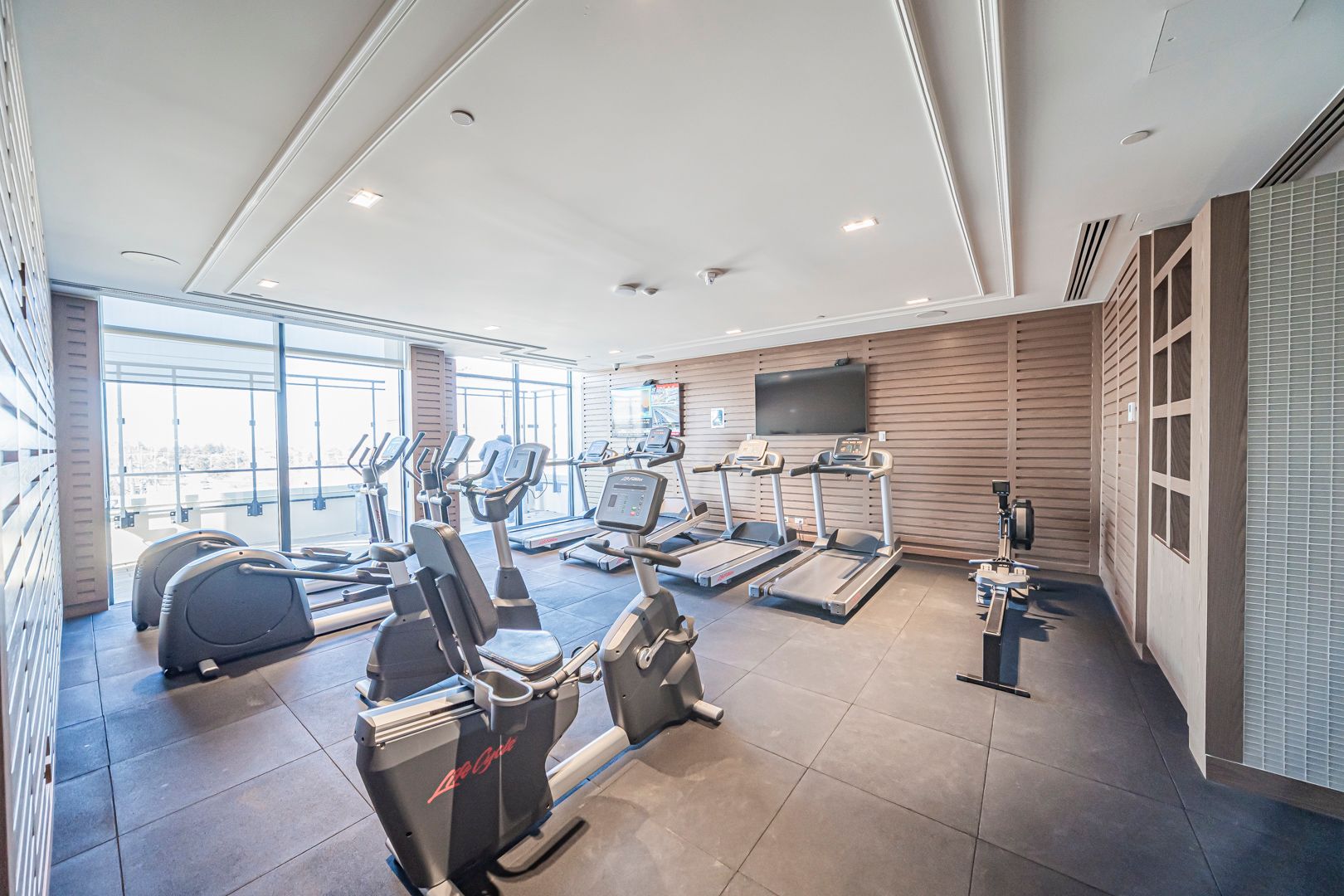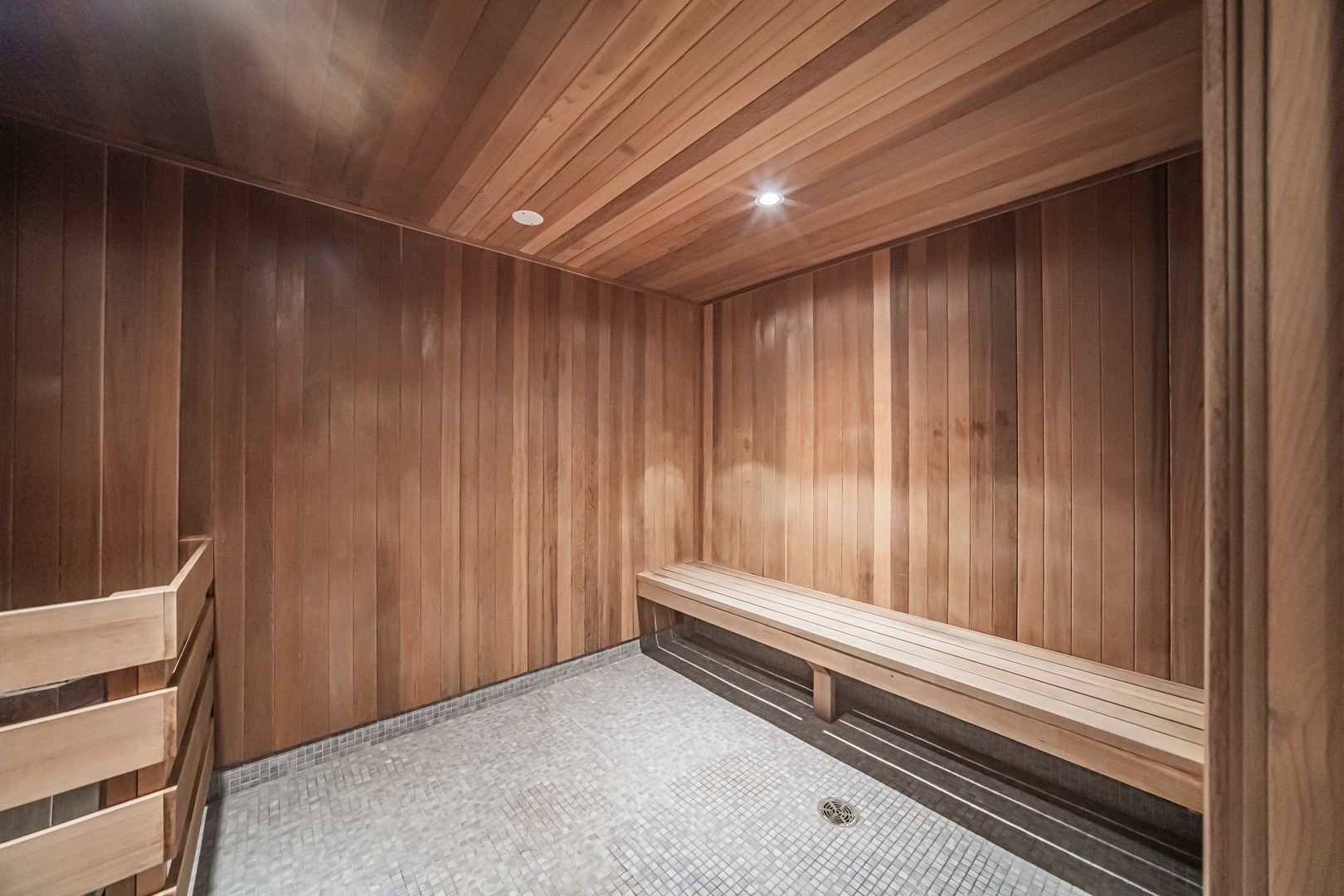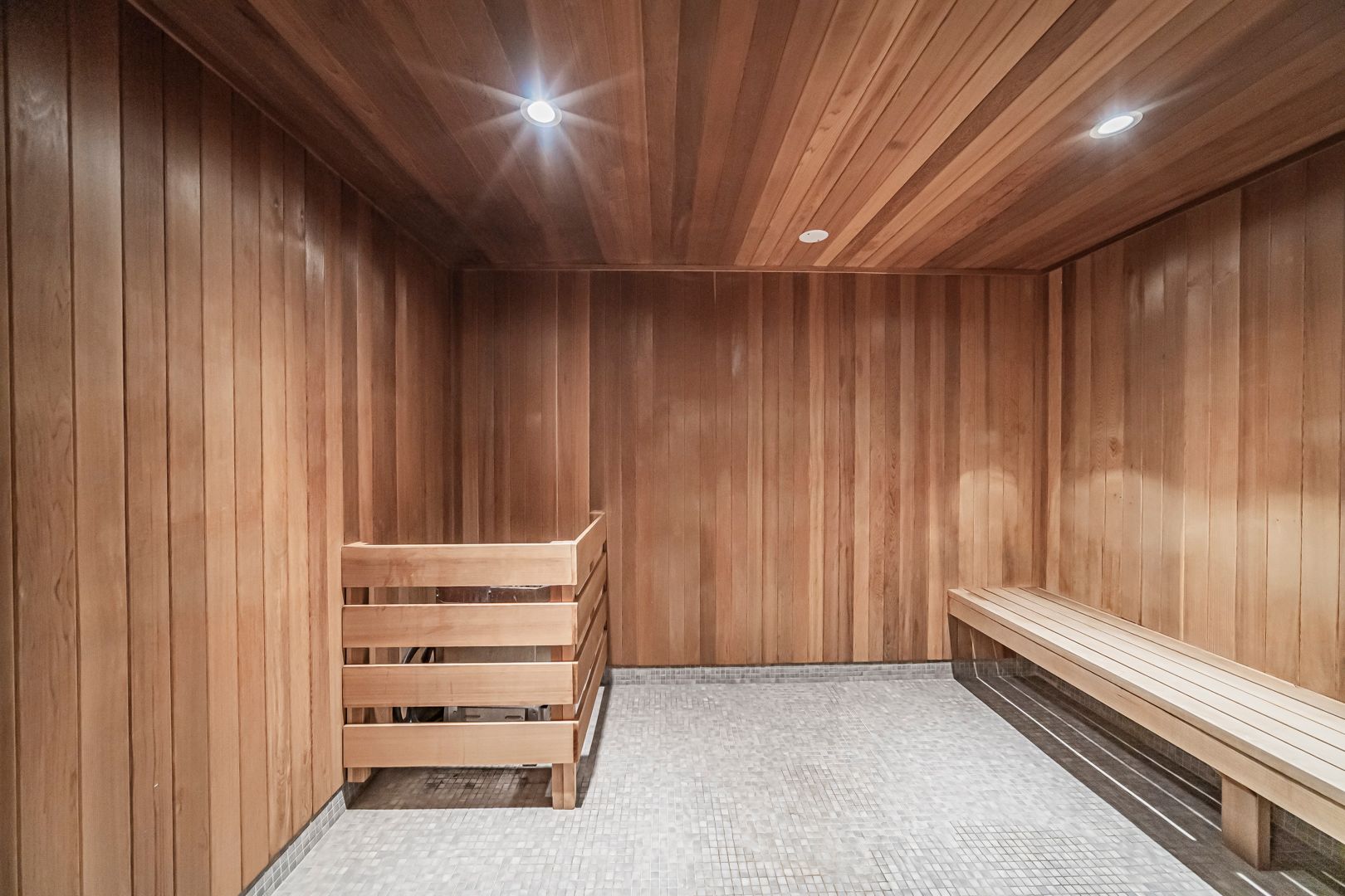 • Resort-style amenities include a gym, sauna, and terrace with BBQ.