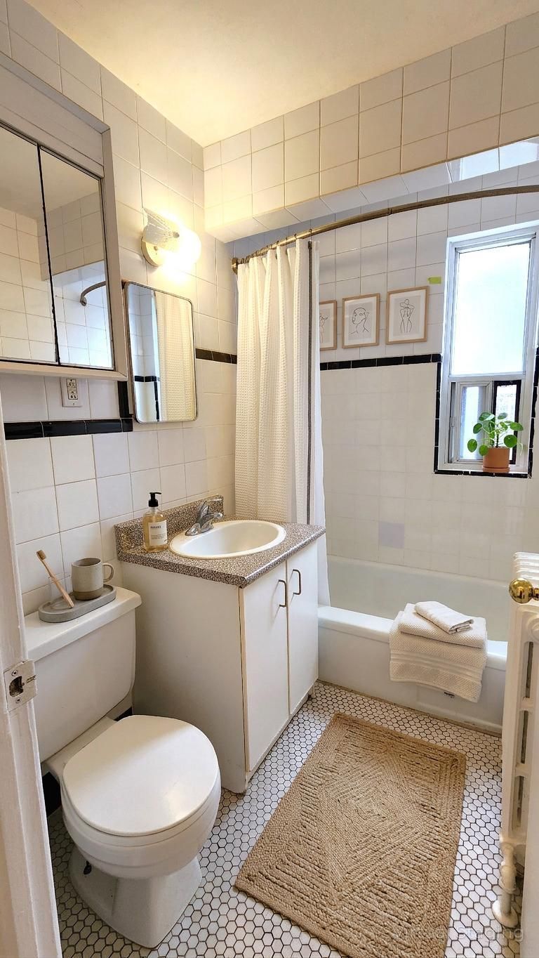 • Updated bathroom featuring stylish floor-to-ceiling tiles.