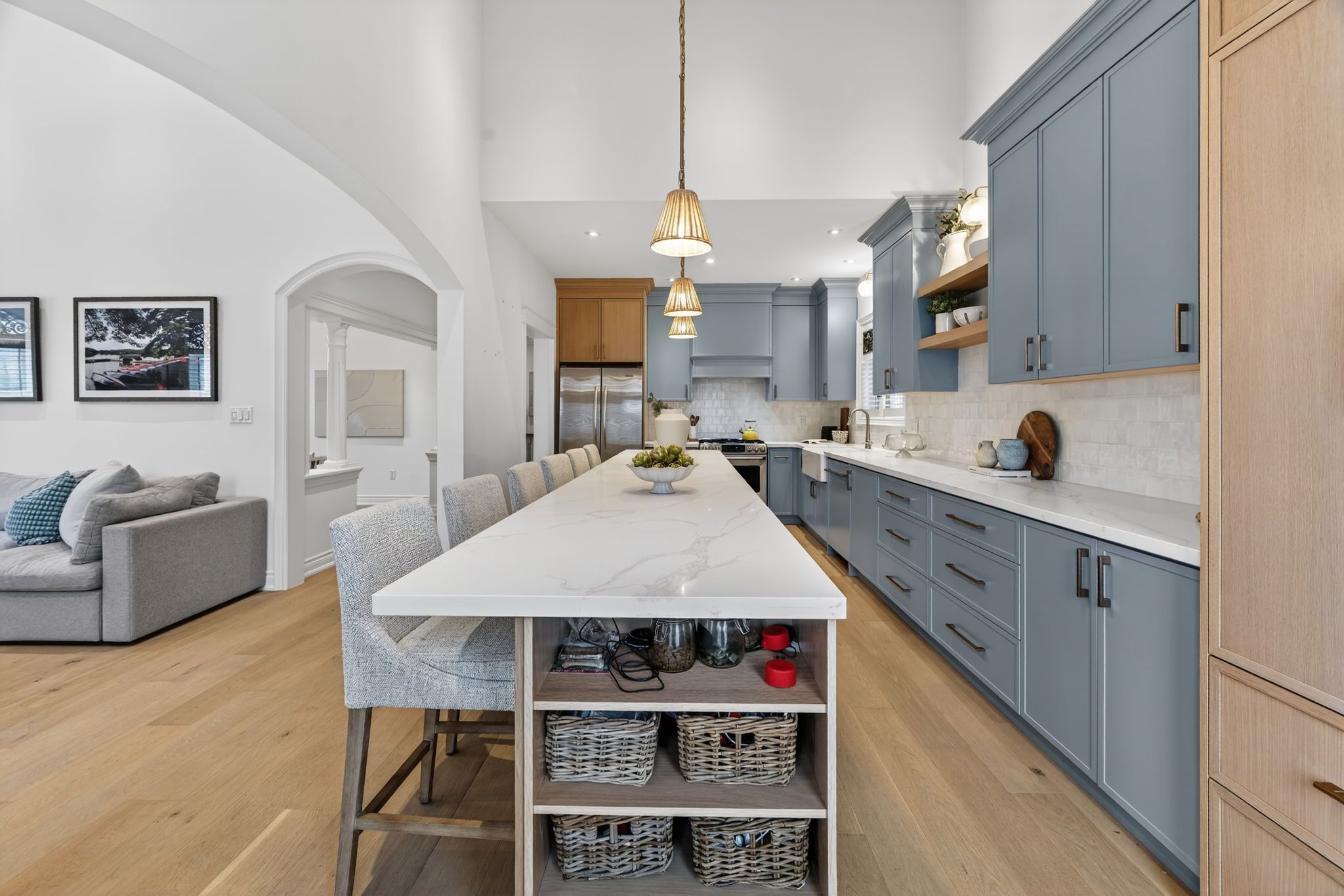 • Open-concept design connects living, family rooms, and chef's kitchen.