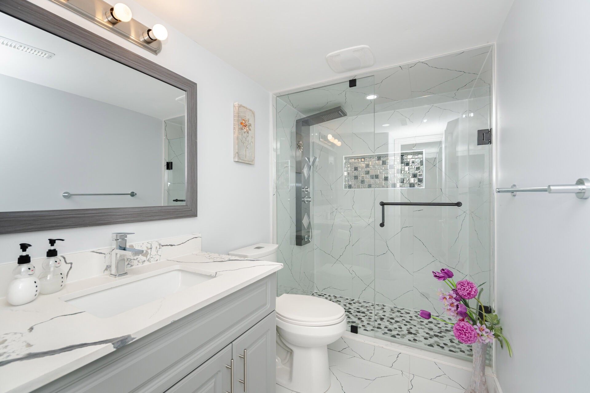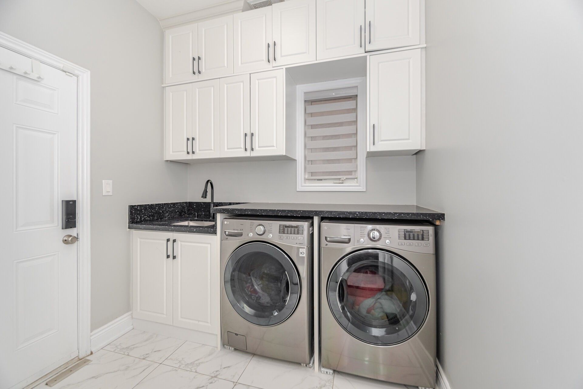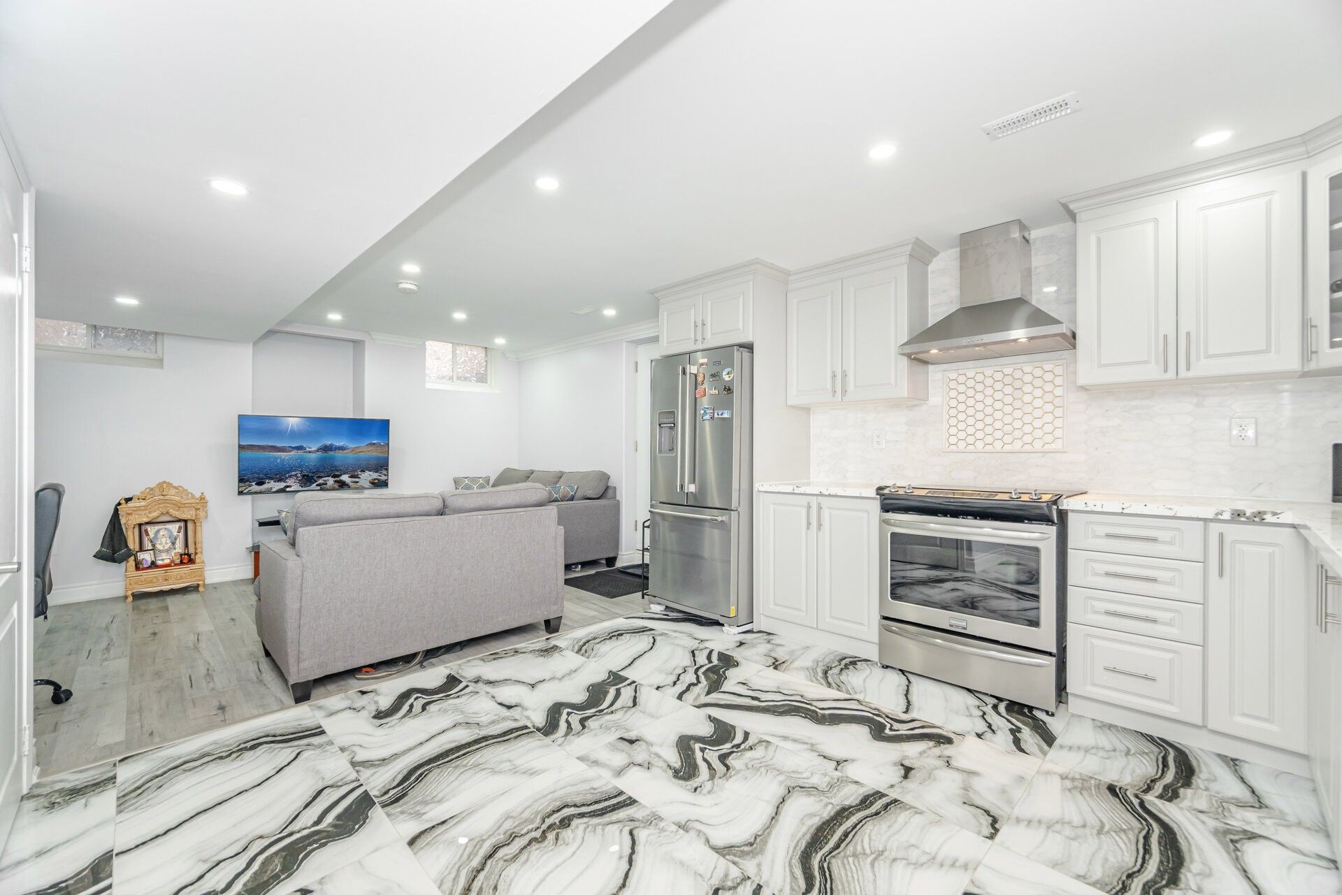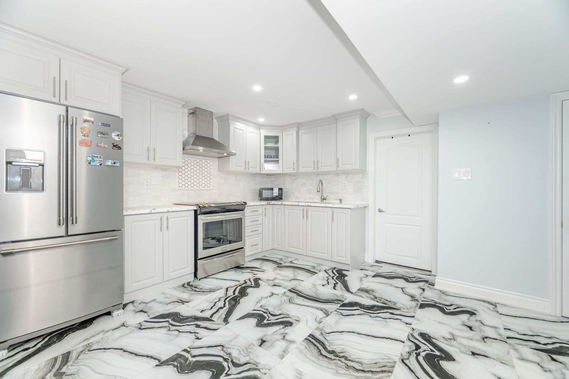 • Modern kitchen featuring quartz countertops and stainless steel appliances.
