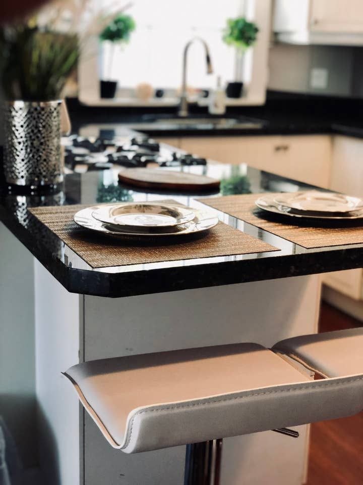 • Bright, modern eat-in kitchen with gas range and breakfast bar.