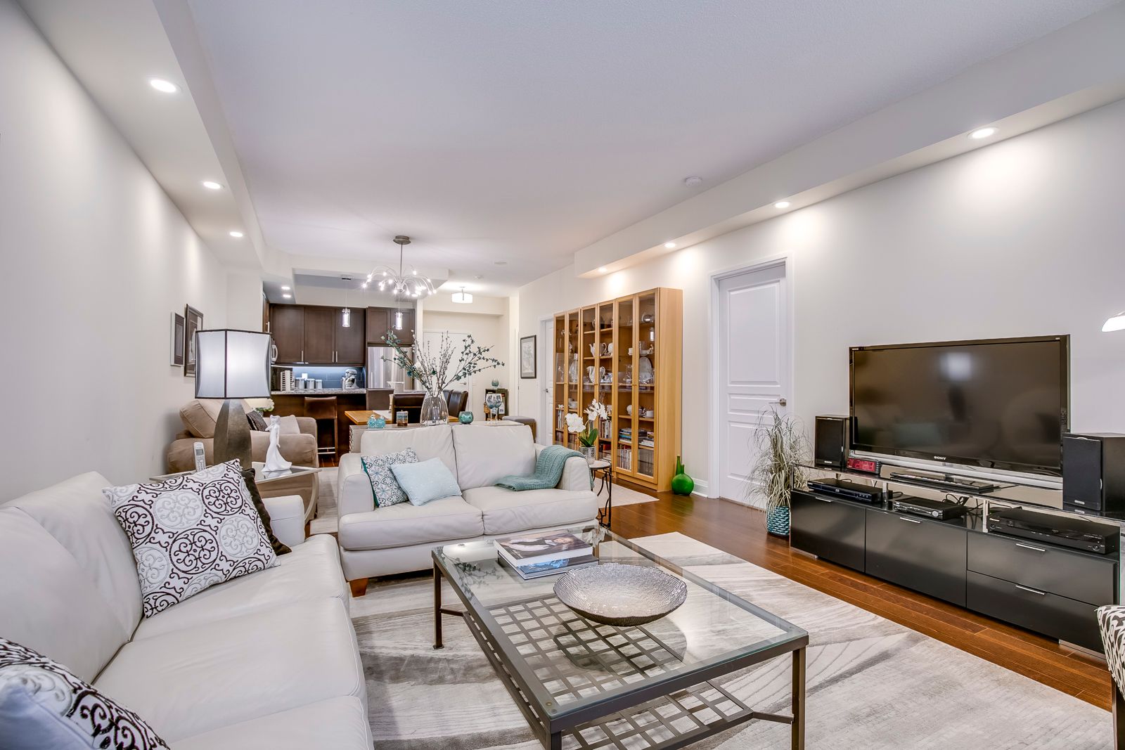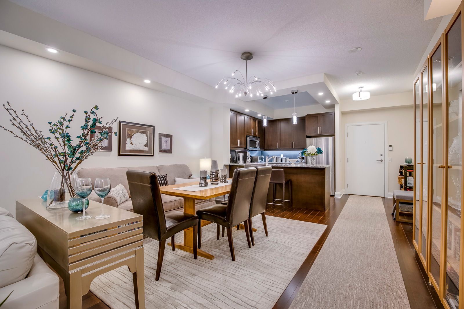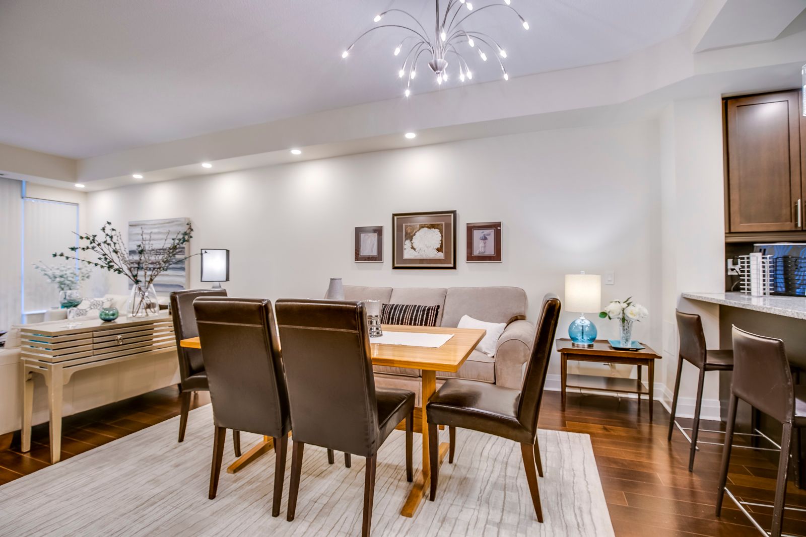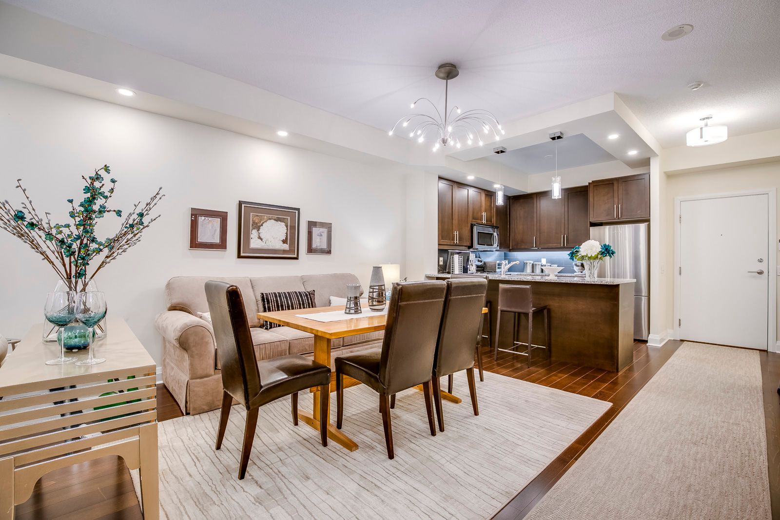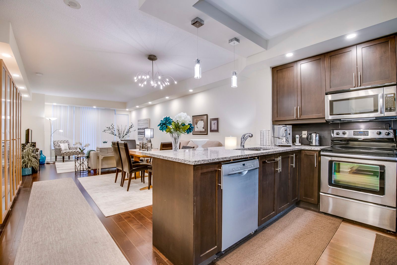 • Open-plan kitchen with premium granite countertops and high-end appliances.