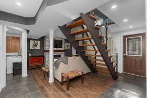 • Spacious recreation room with a custom built staircase and gas fireplace.