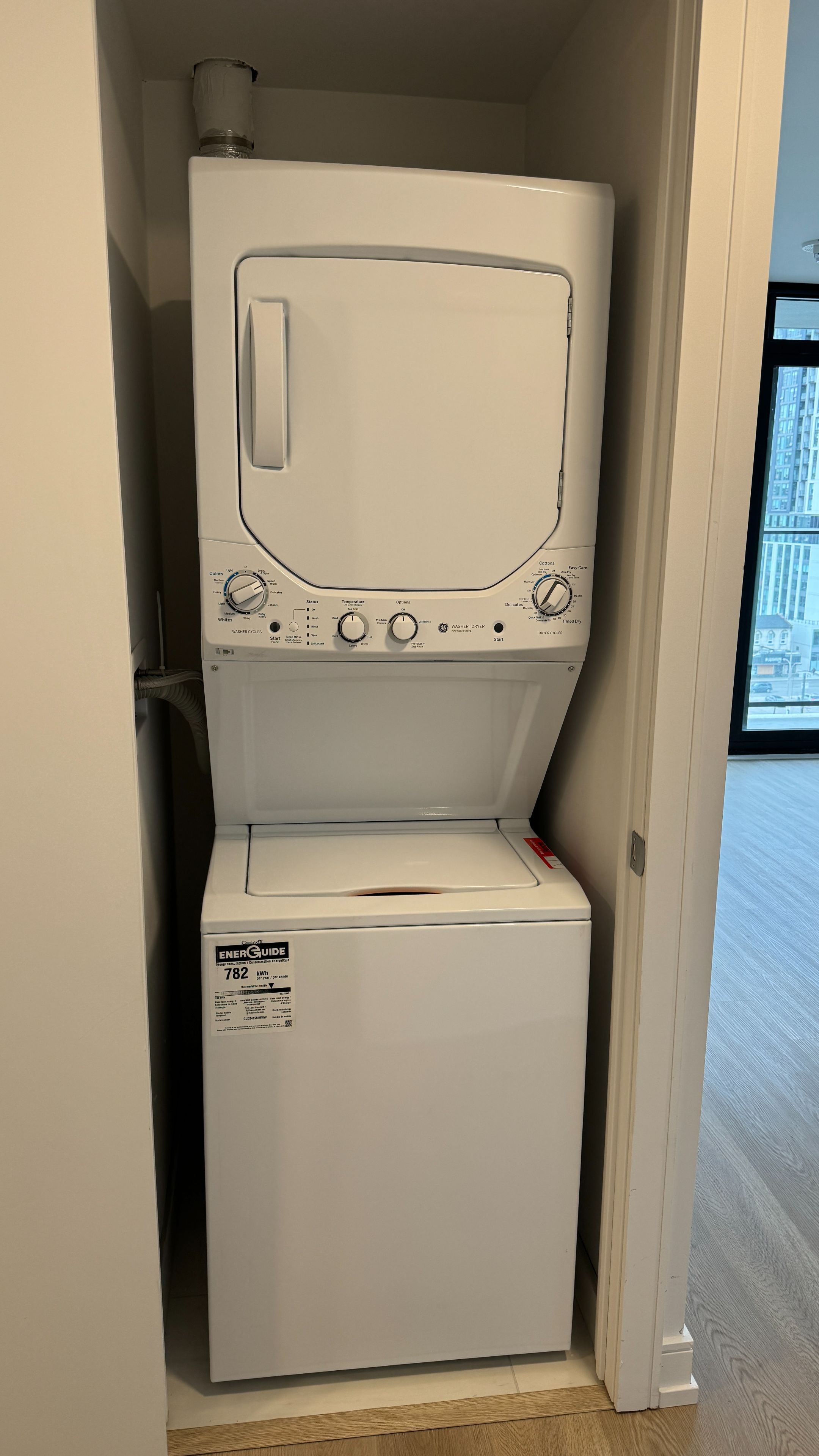 • Modern kitchen with stainless steel appliances and in-suite laundry.