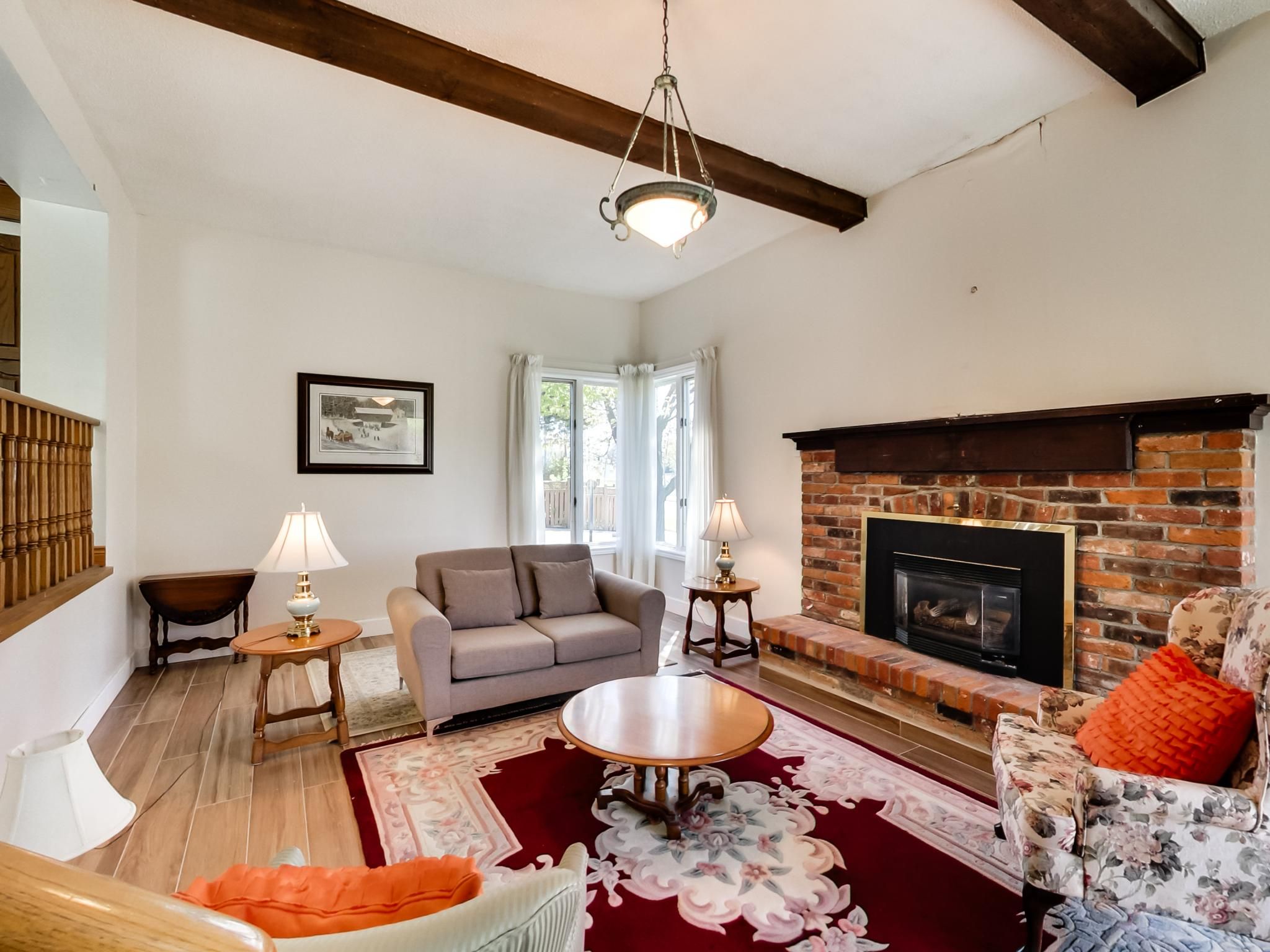 • Inviting sunken living room featuring exposed beam ceilings and fireplace.