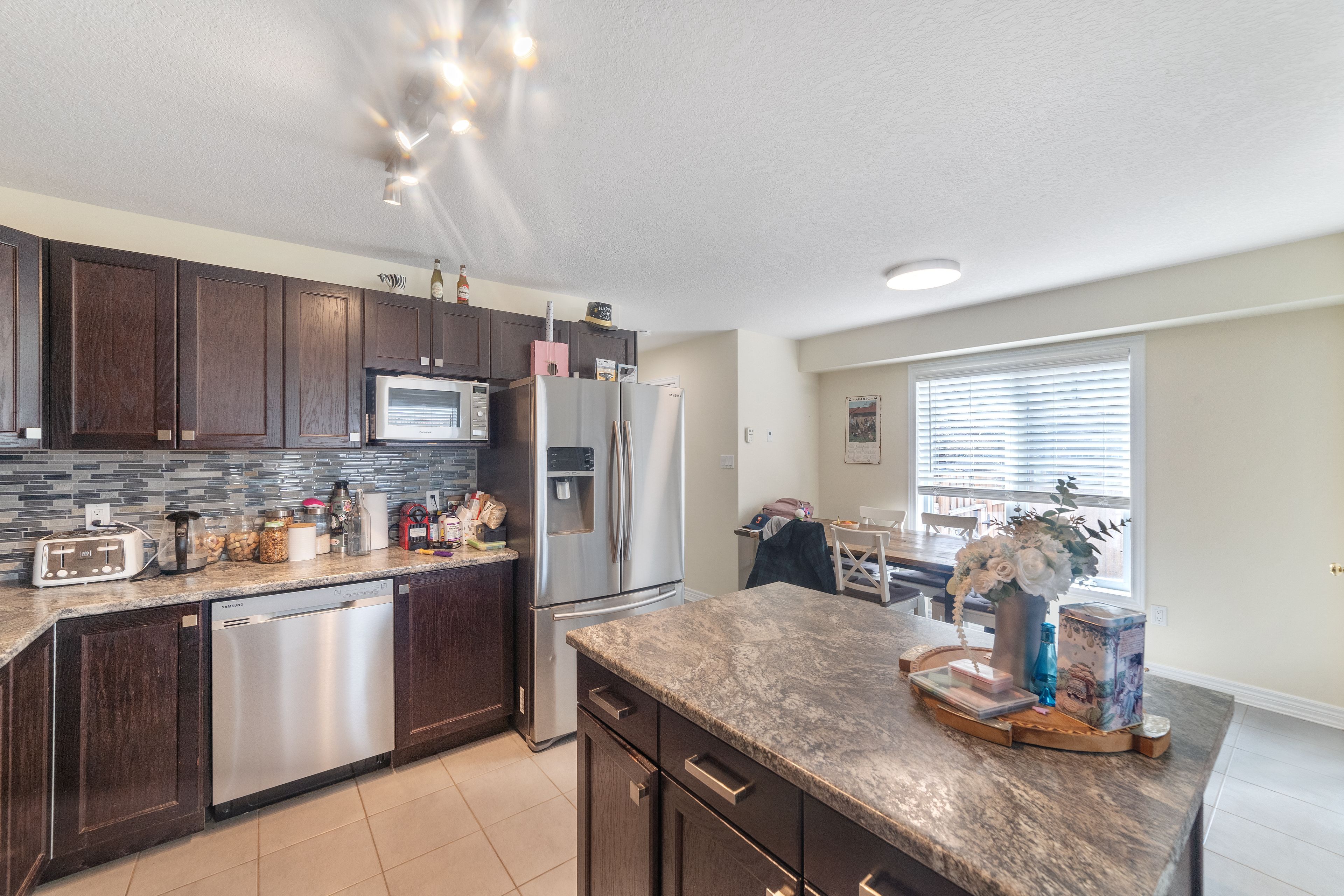 • Modern kitchen featuring stainless steel appliances and breakfast bar.