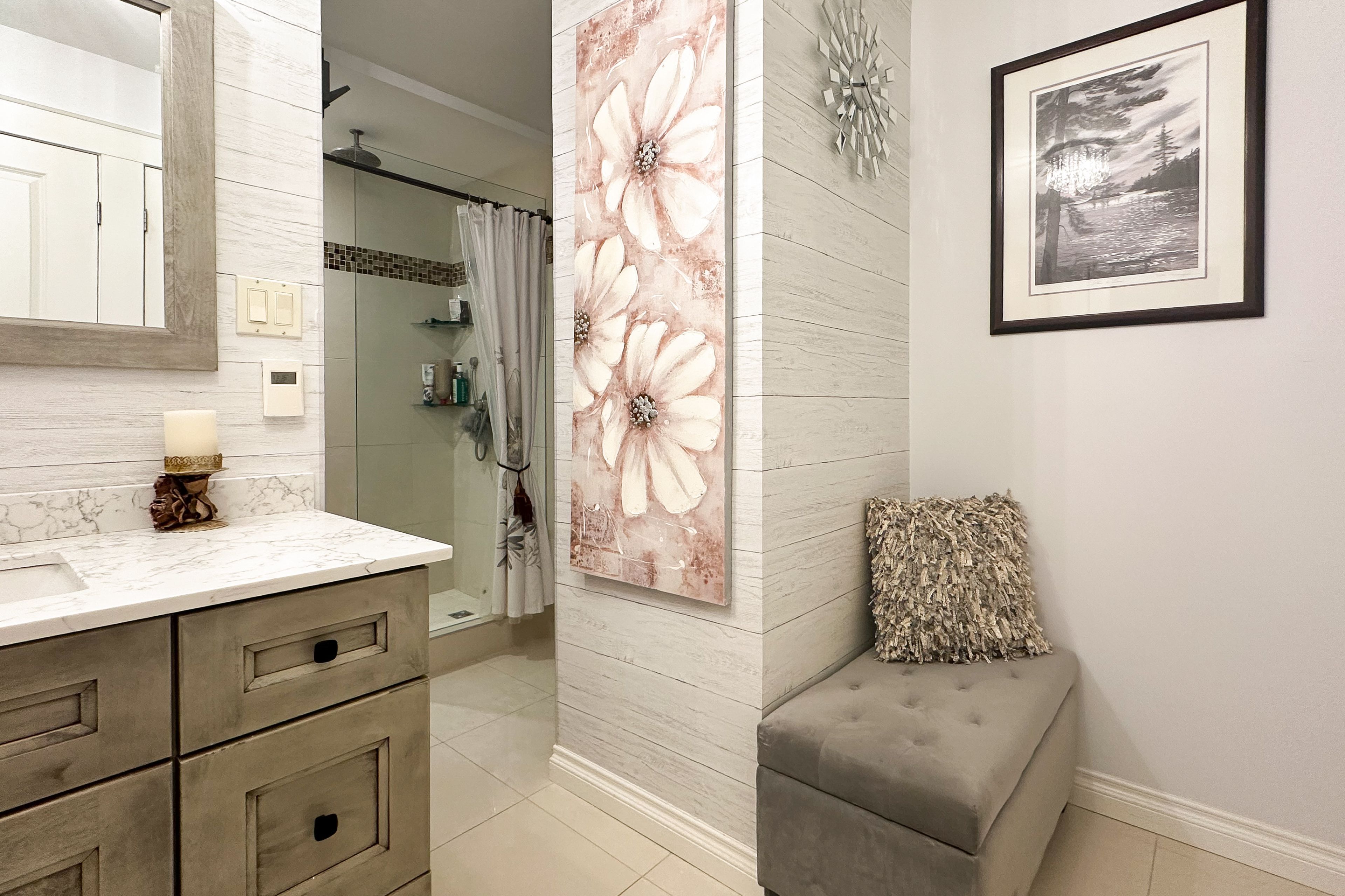 • Bright foyer opens to a great room with lake views and a fireplace.
