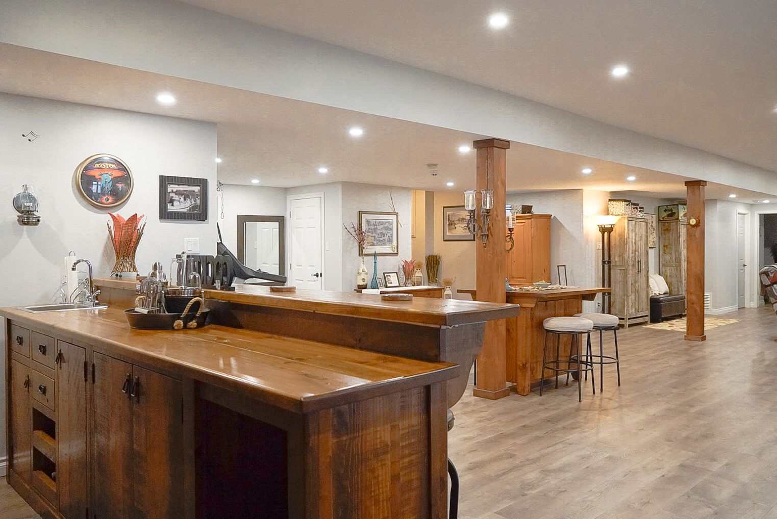 • Walkout lower level has high ceilings, a wet bar, and a rec room.