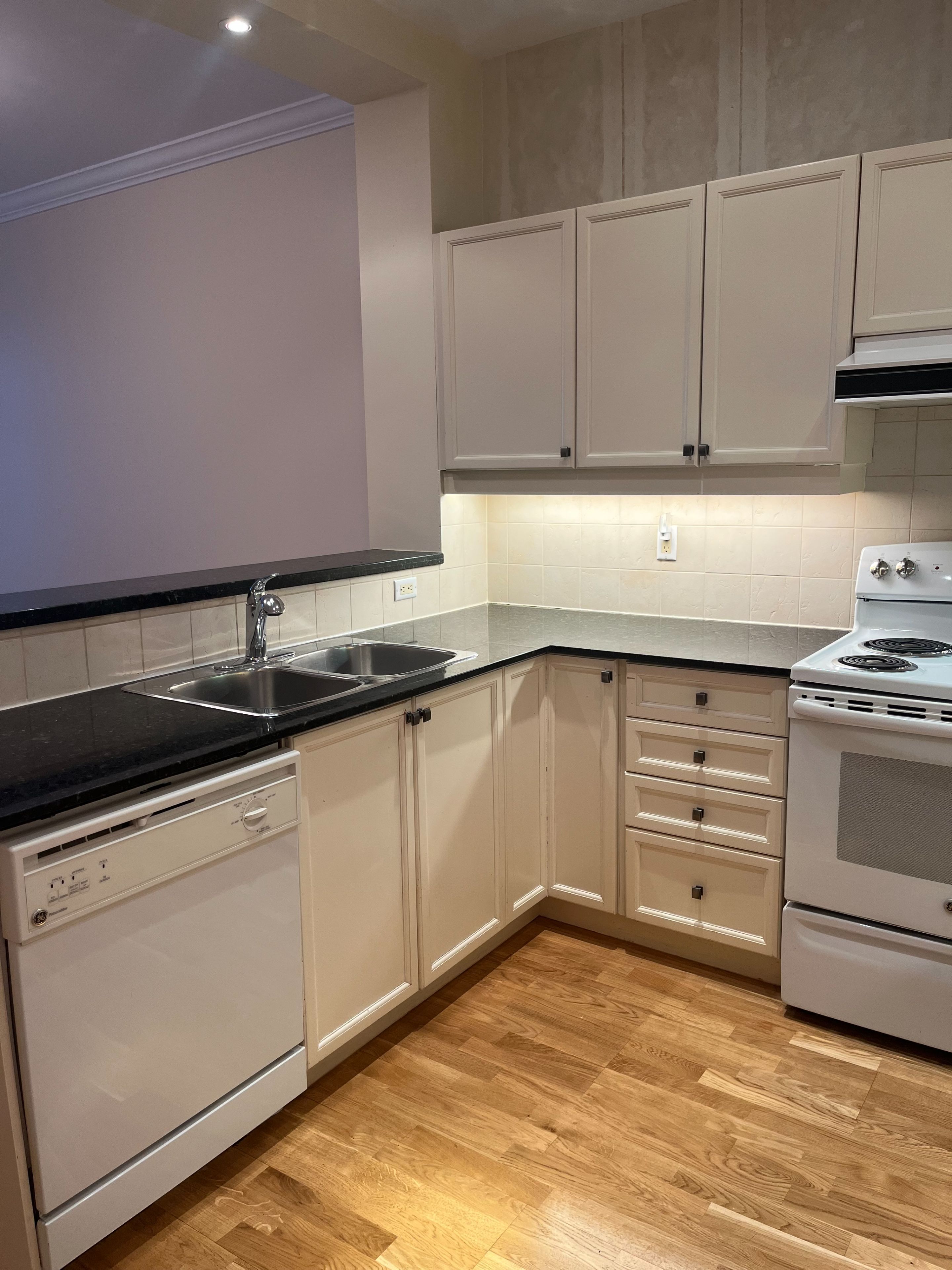 • Modern kitchen featuring granite countertops and stainless steel appliances.