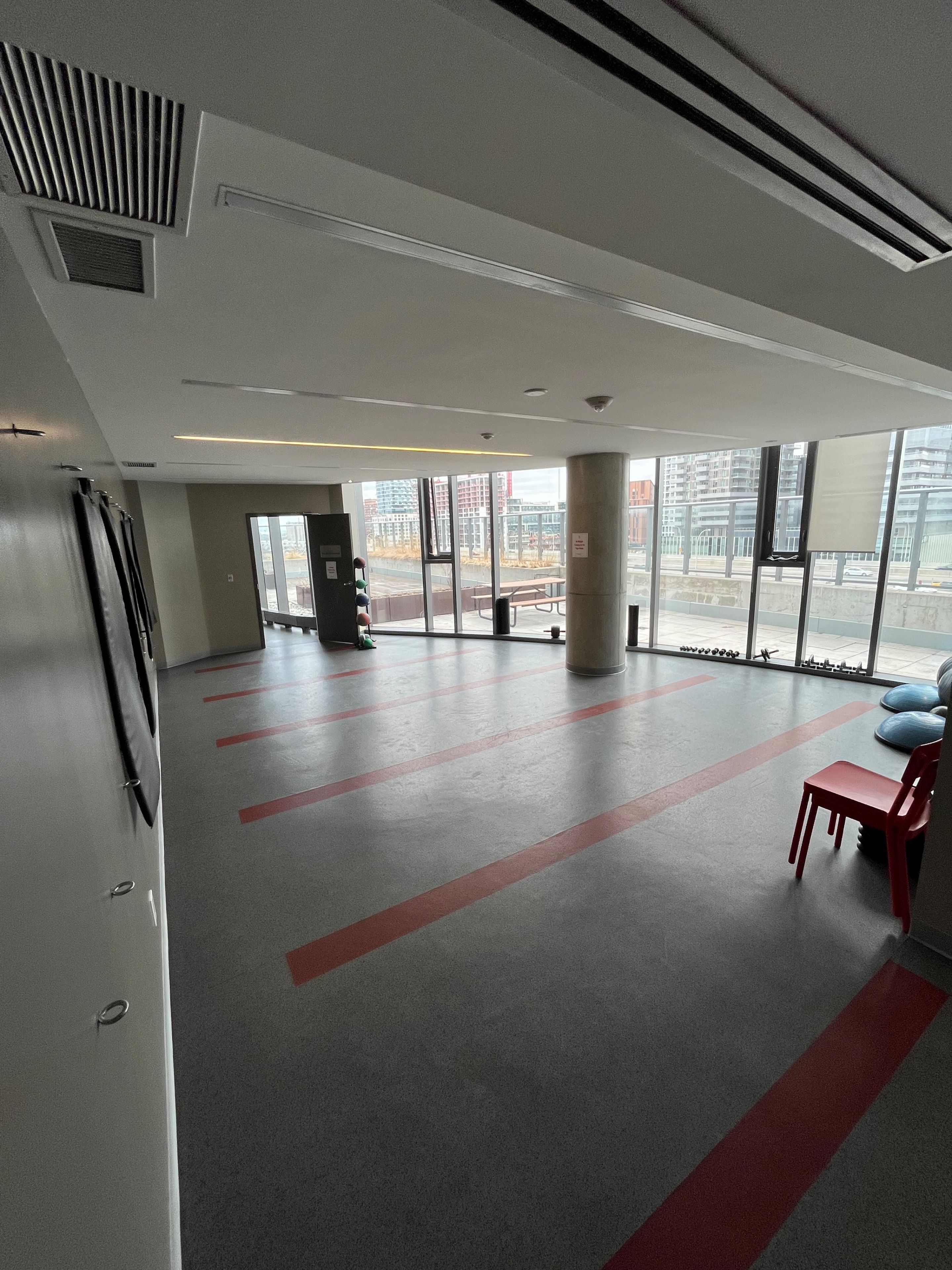 • Building includes fitness center, rooftop terrace, and party room for gatherings.