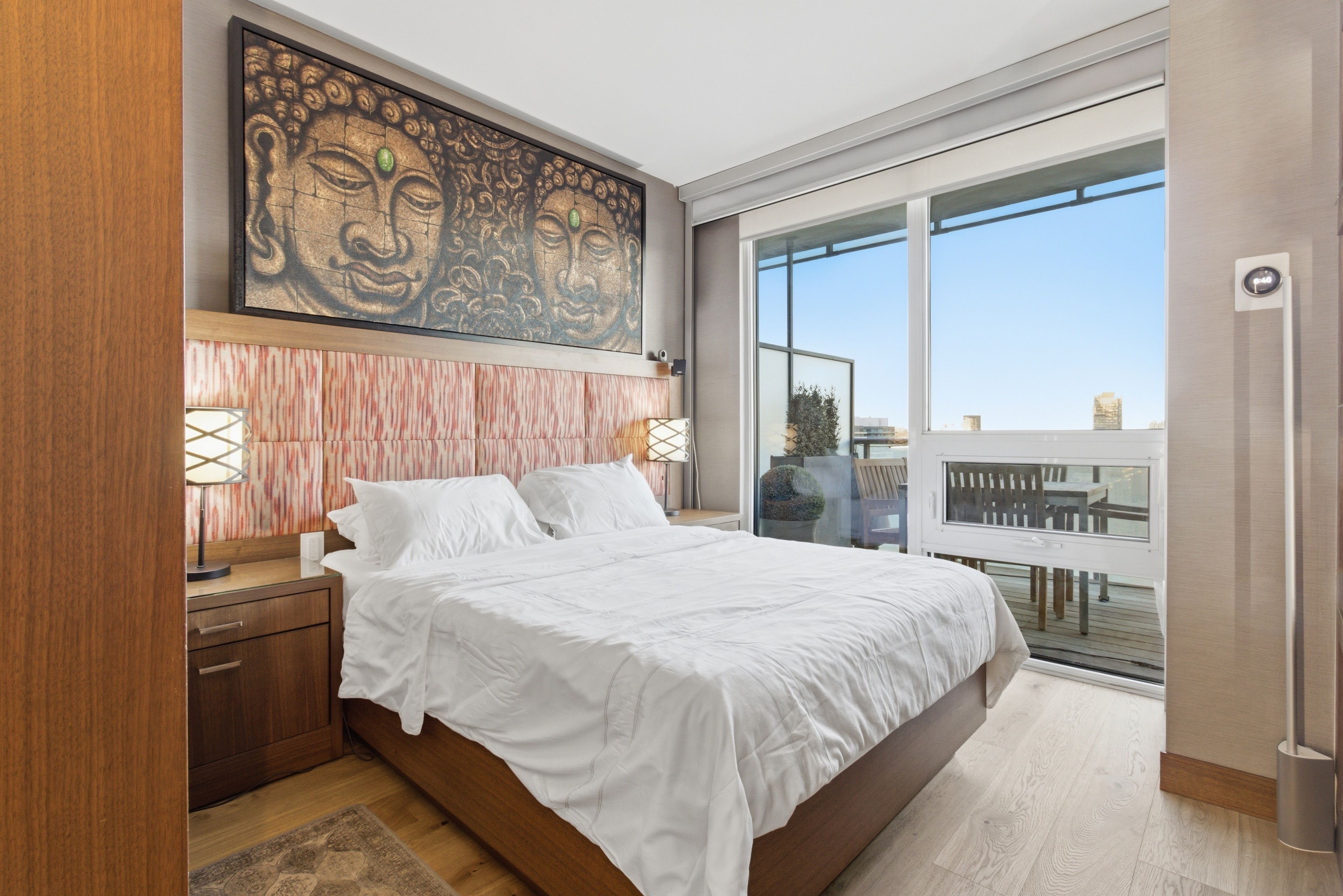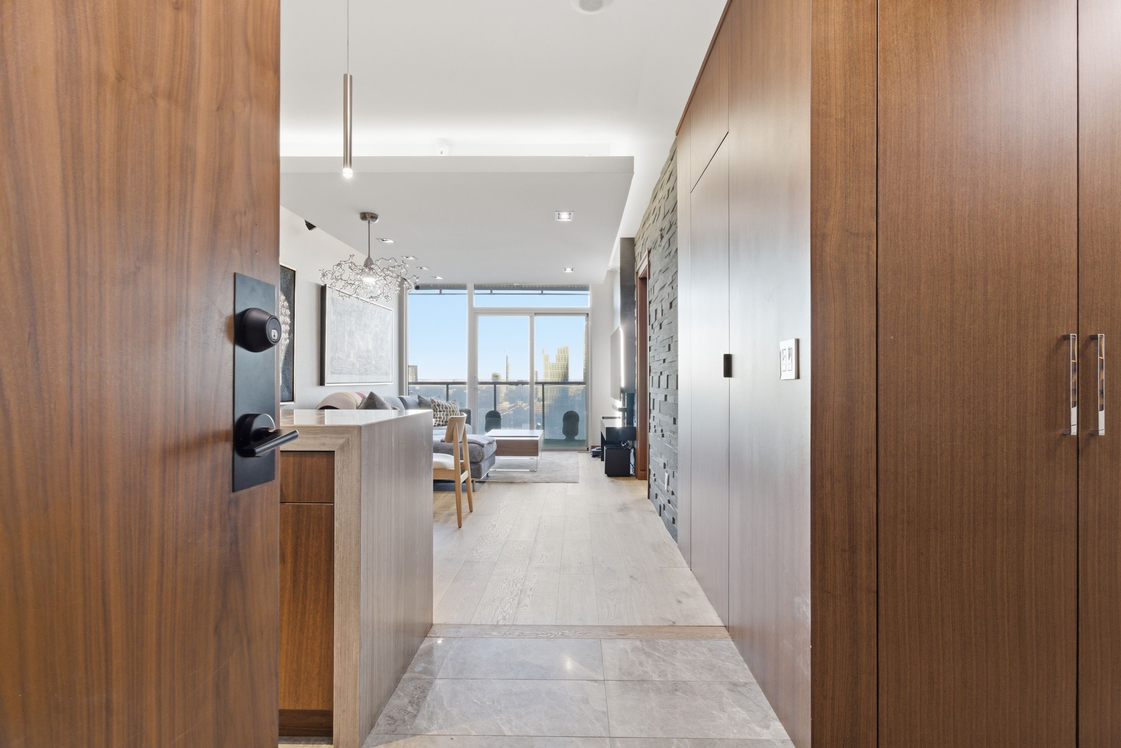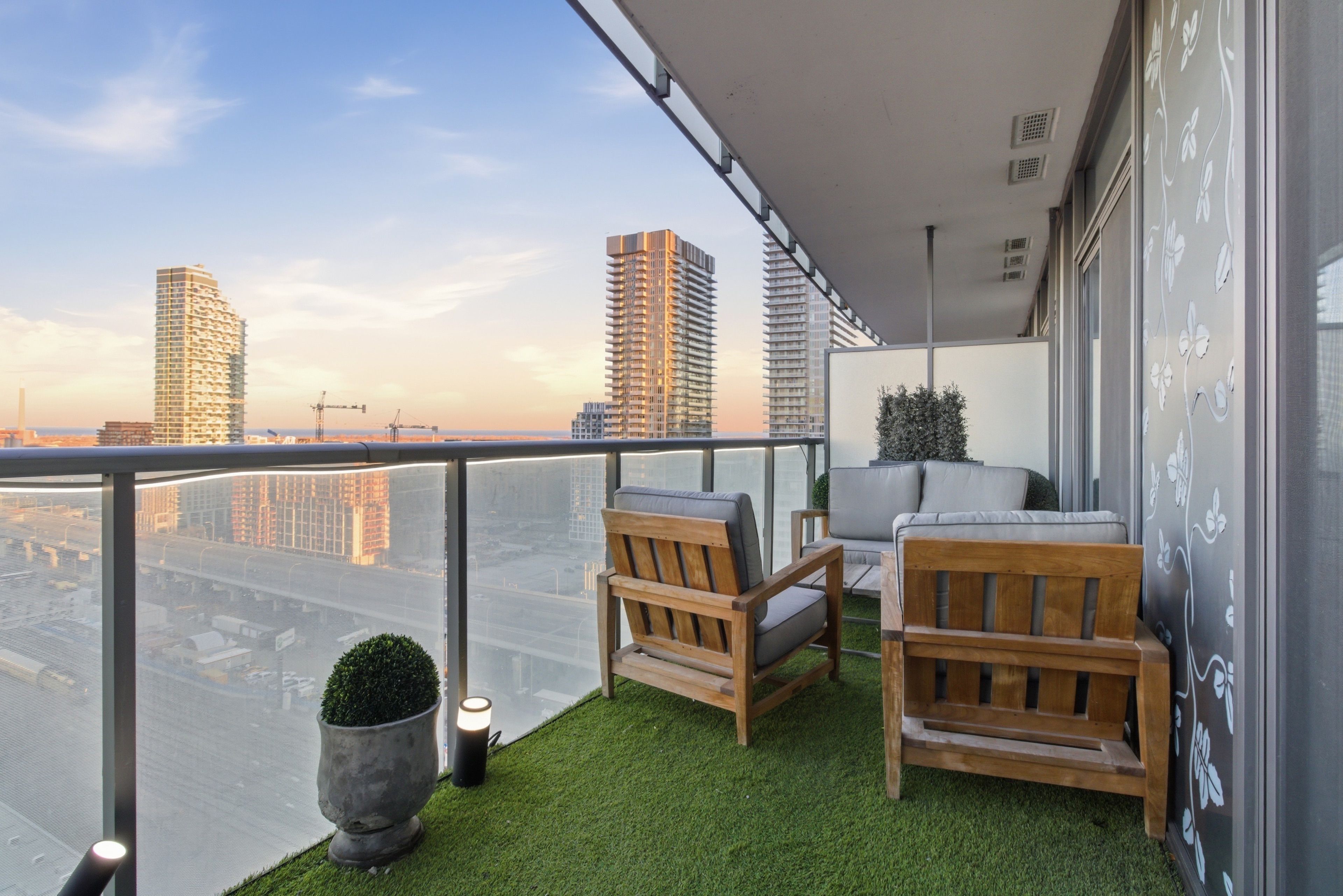 Enjoy the pinnacle of luxury in the heart of downtown toronto; a one-of-a-kind $275k bespoke renovation. Designed by world-renowned paul rafauli, this fully-furnished, turnkey 2 bed / 2 bath split-floor residence offers 885sf of sophisticated interior living with unobstructed south-east views of the skyline, treetops, and lake ontario + 238sf private rooftop terrace! Walnut-paneled walls and doors, custom built-ins, contemporary stone accents, designer lighting, and fully integrated smart home automation create effortless, jet-set-ready elegance. The kitchen is a masterpiece of form and function: granite waterfall island with recessed led lighting, marble floors, custom walnut and high-gloss cabinetry, glass tile backsplash, built-in pantry, premium sub-zero and miele appliances; perfect for curated entertaining or quiet gourmet moments. An lg styler keeps your wardrobe perfectly steamed, sanitized, and pressed at a touch. Sun-drenched living and dining areas with floor-to-ceiling windows frame breathtaking vistas, providing a cinematic backdrop for work, leisure, or hosting guests. The primary retreat is a sanctuary of bespoke luxury with walnut millwork paneling, built-in his and hers closets with organizers, illuminated shelving, designer wallpaper, custom blackout shades, and a 4-piece marble ensuite featuring toto smart toilet and frameless glass shower and tub. The second bedroom, designed as an executive office, includes custom built-ins, abundant storage, and a marble-finished ensuite. Step outside to the gorgeous private terrace with wood-plank flooring, astro-turf, integrated lighting, natural gas bbq line, an extraordinary outdoor stage for sunset cocktails, intimate entertaining, work & reflection above the city. Steps to union station, st lawrence market, financial district, universities, film studios, sugar beach, berczy park, loblaws and amenities galore; this is toronto living at its best! Just bring your suitcase.