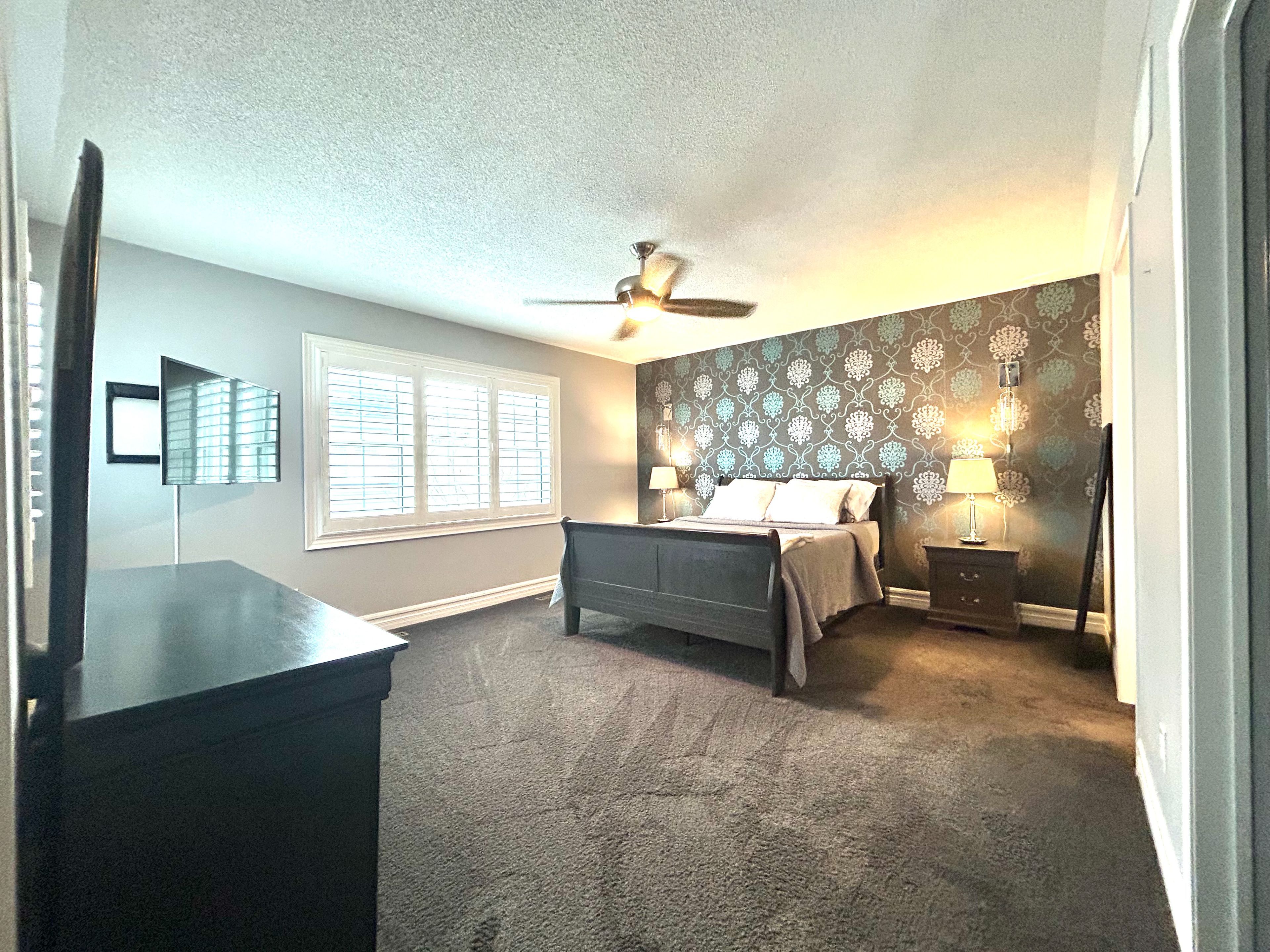 • Spacious master bedroom with separate sinks, shower, and soaker tub.