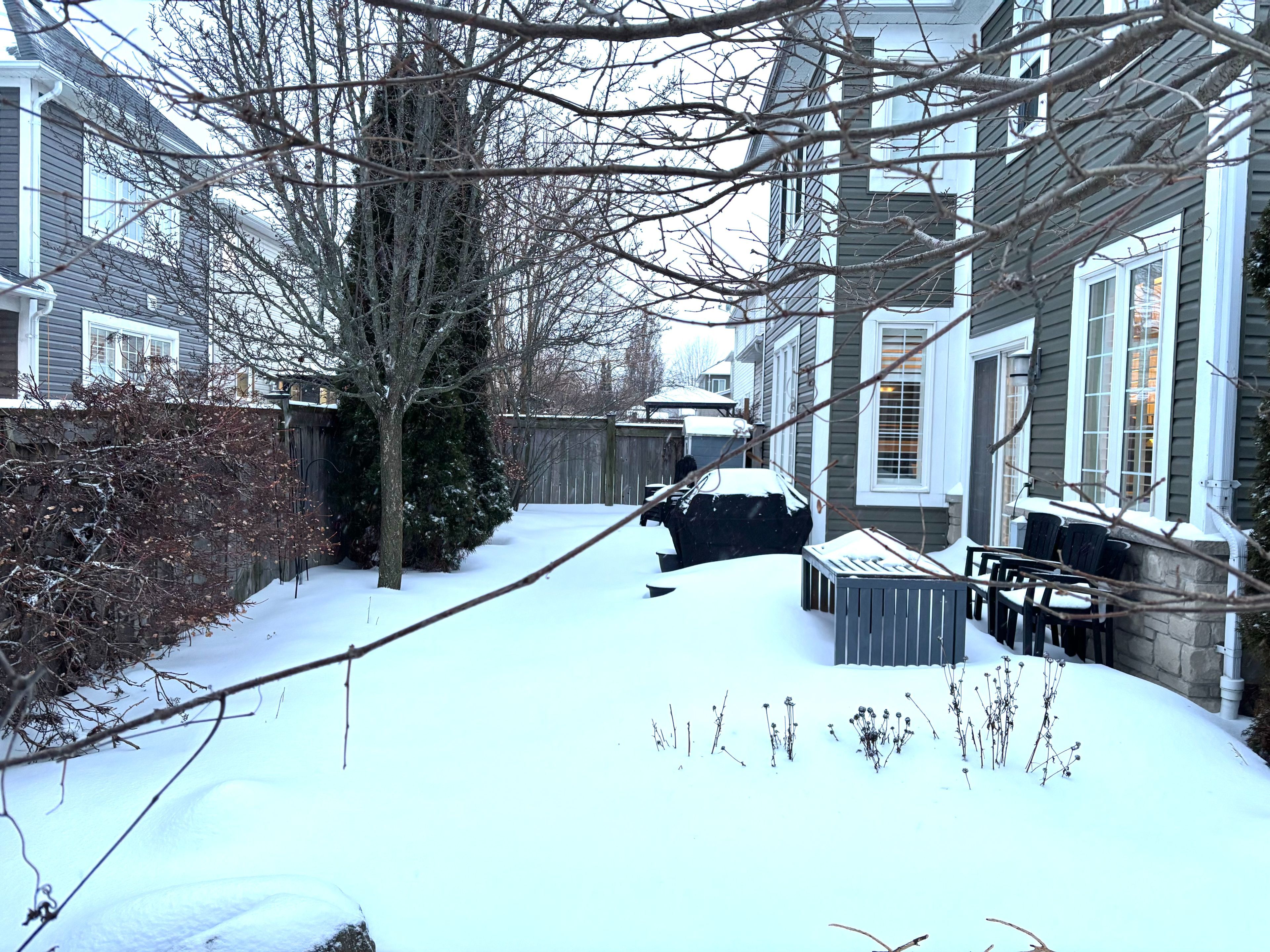 • Custom stamped concrete patio in a fully landscaped backyard for outdoor relaxation.