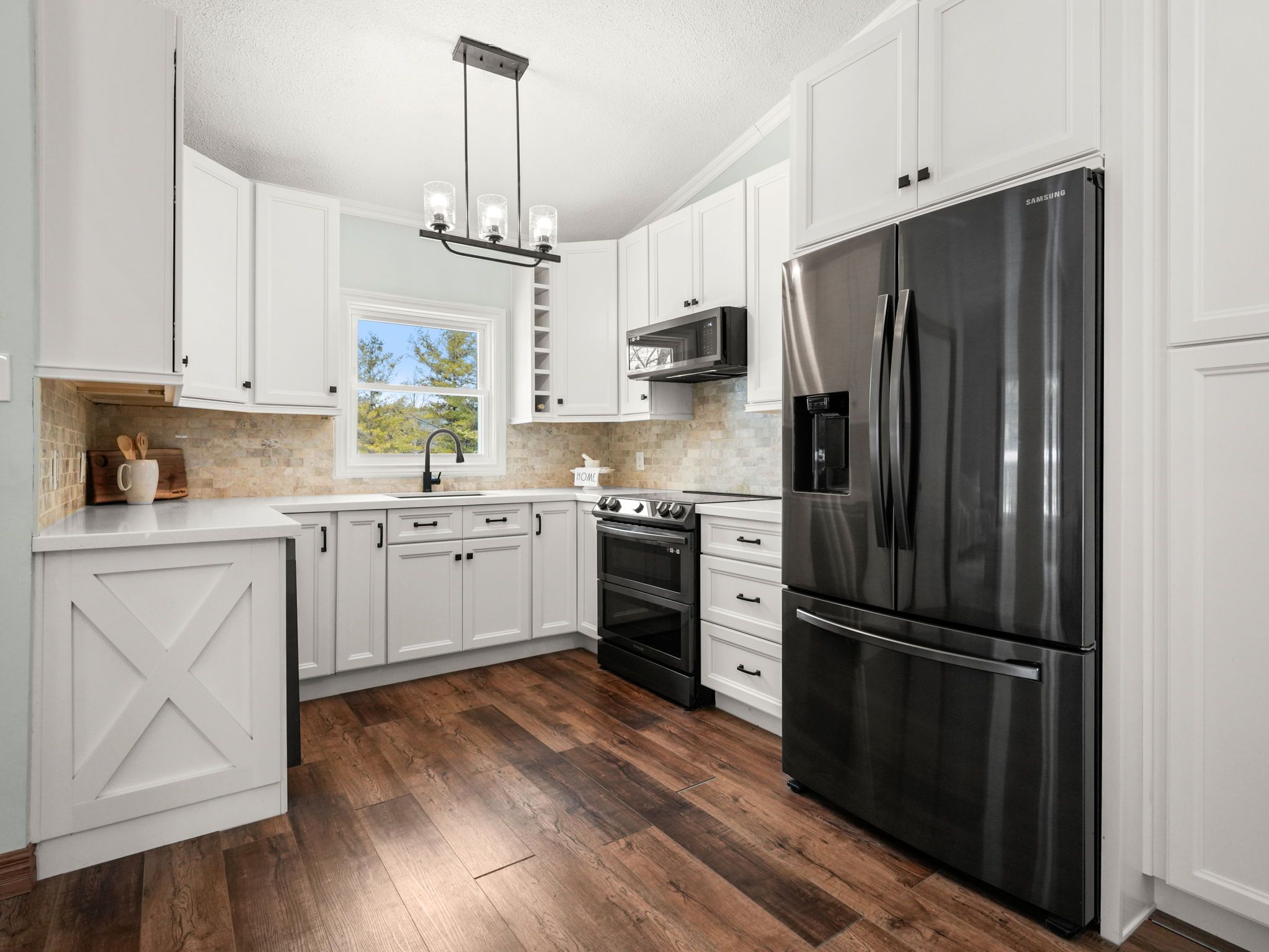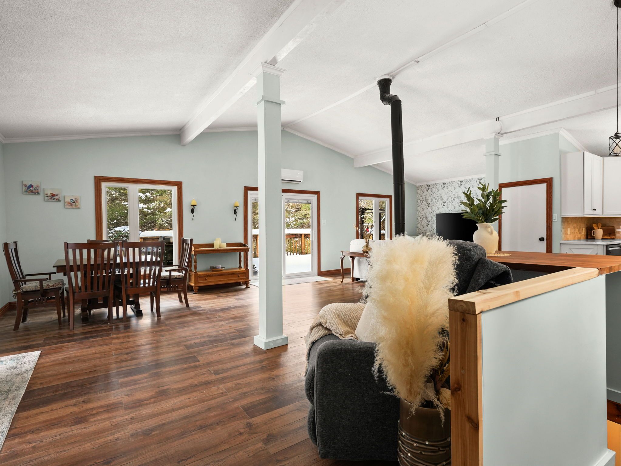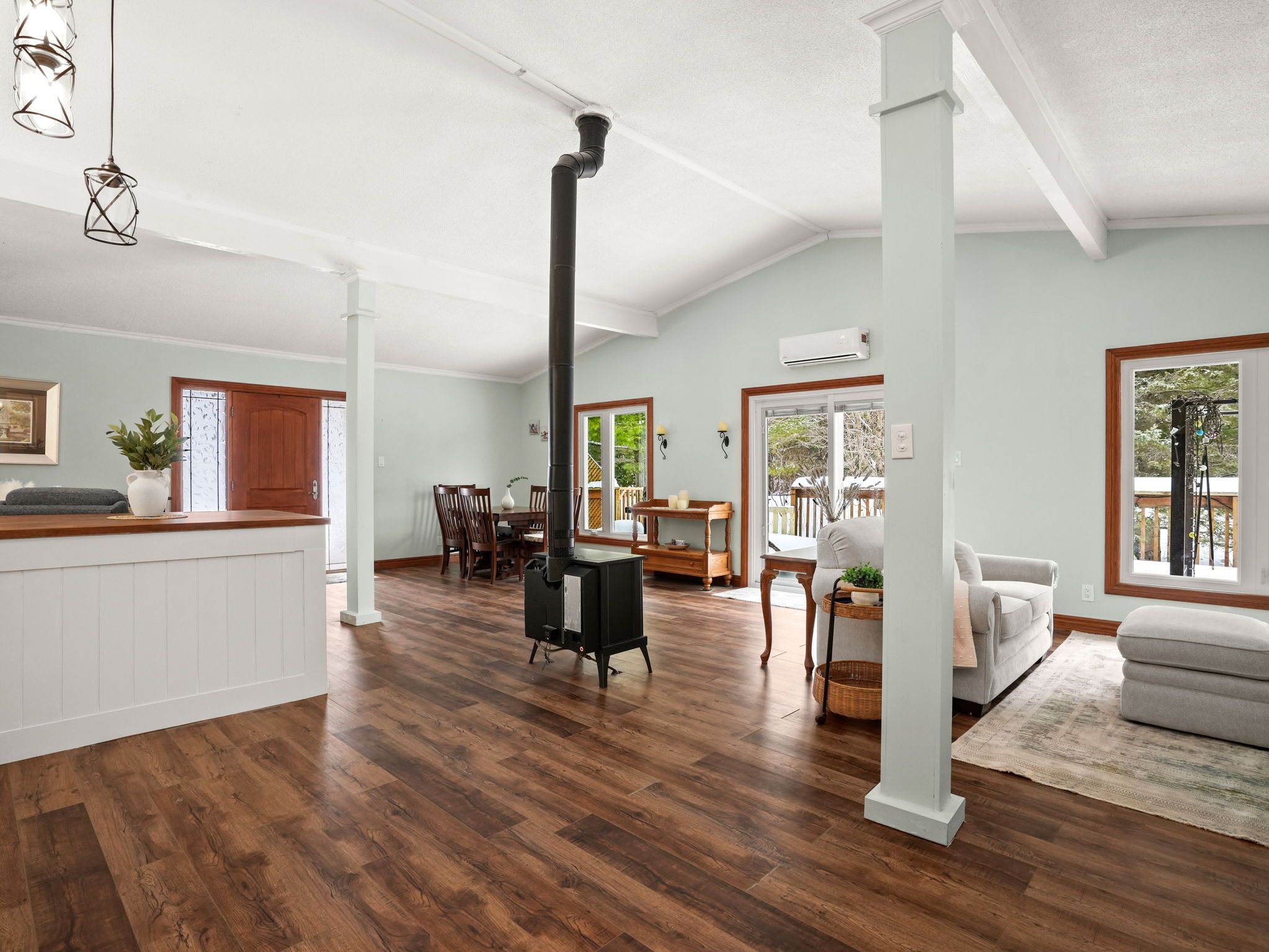 • Updated kitchen flows into living space, featuring a cozy wood stove.