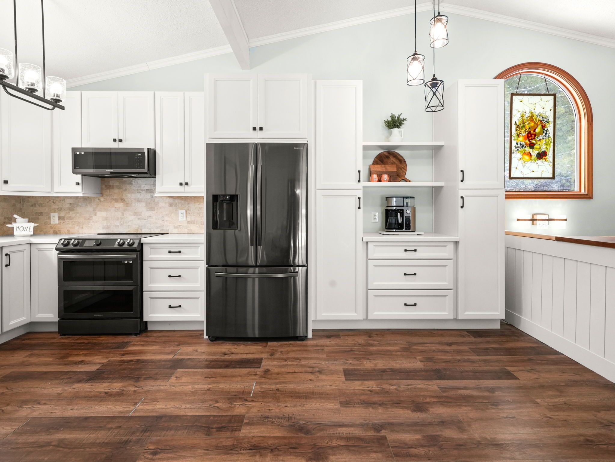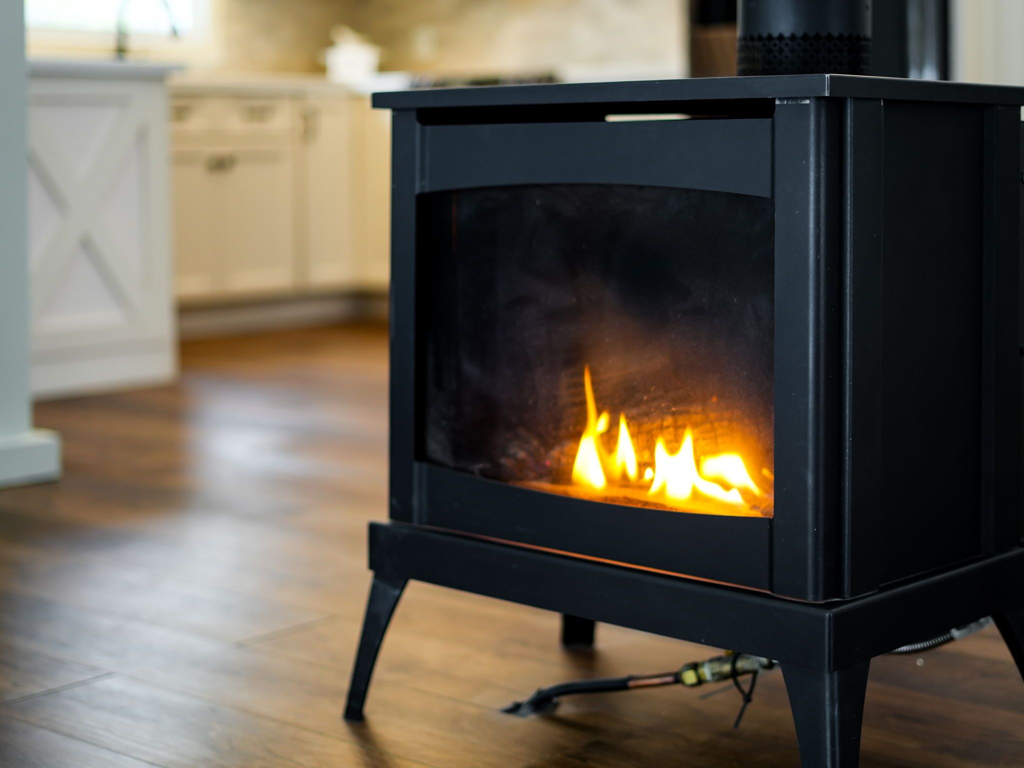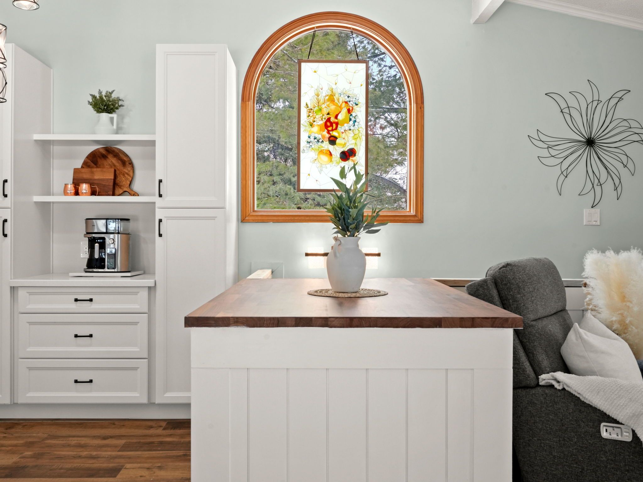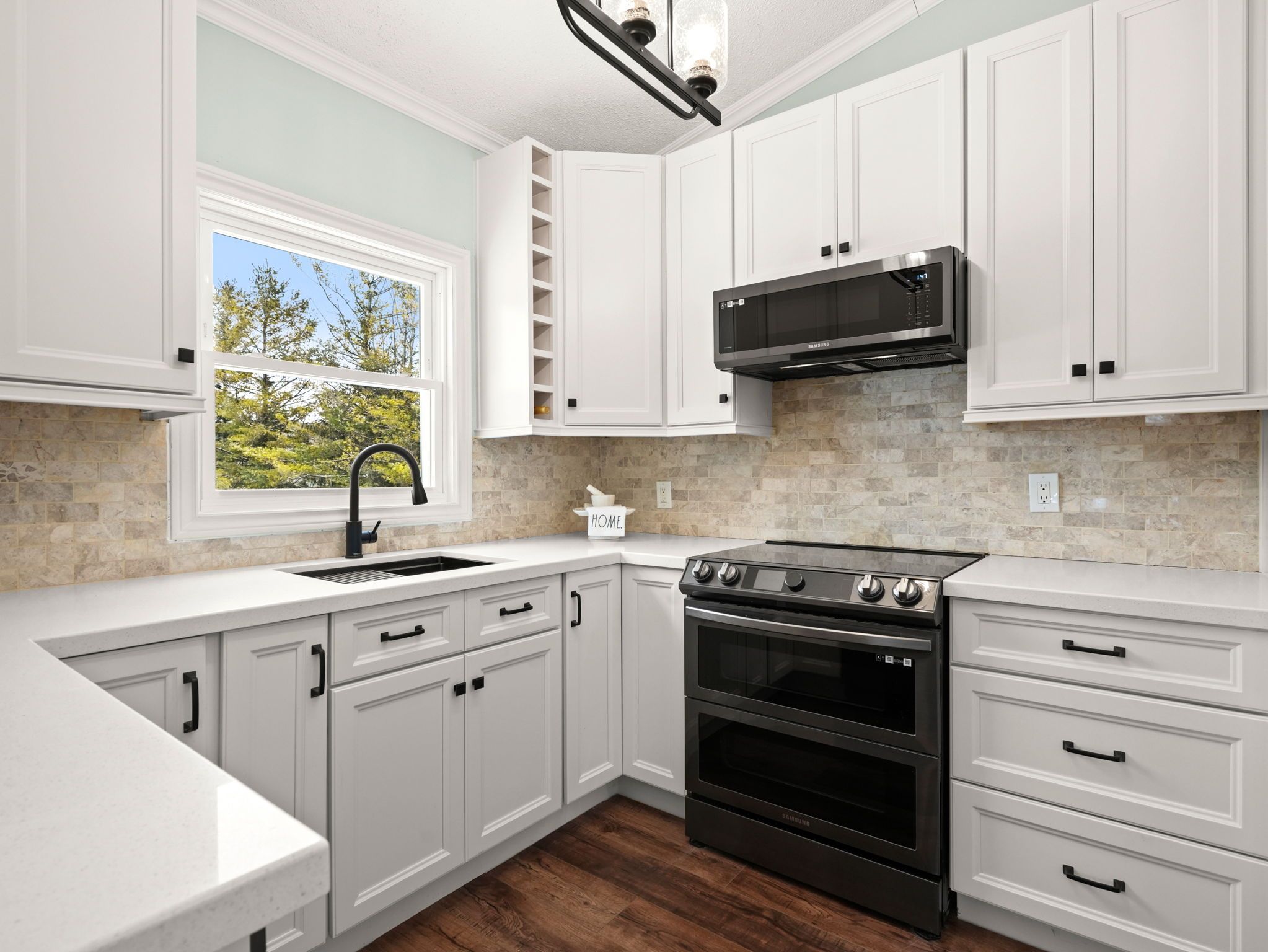 • Updated kitchen flows into living space, featuring a cozy wood stove.