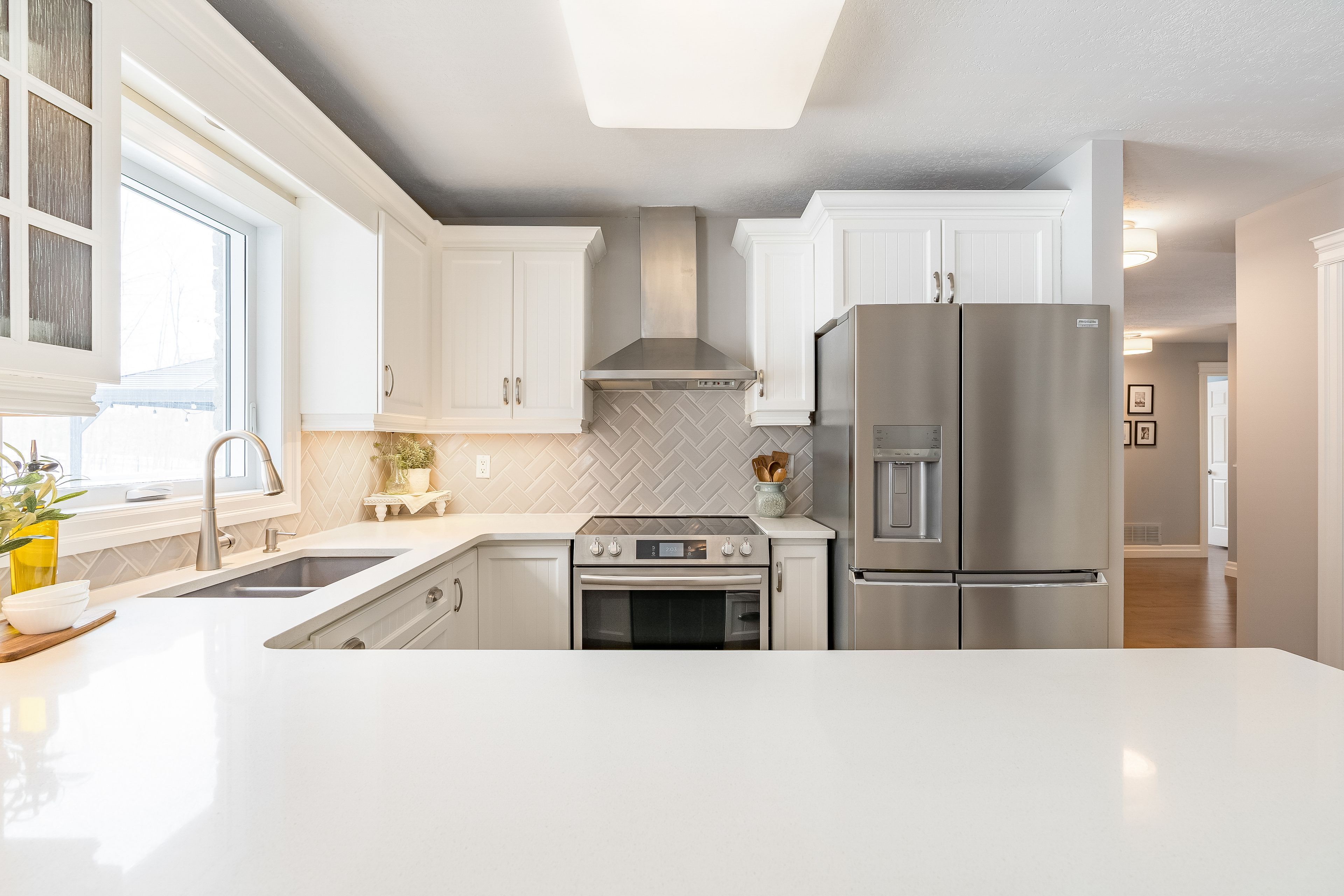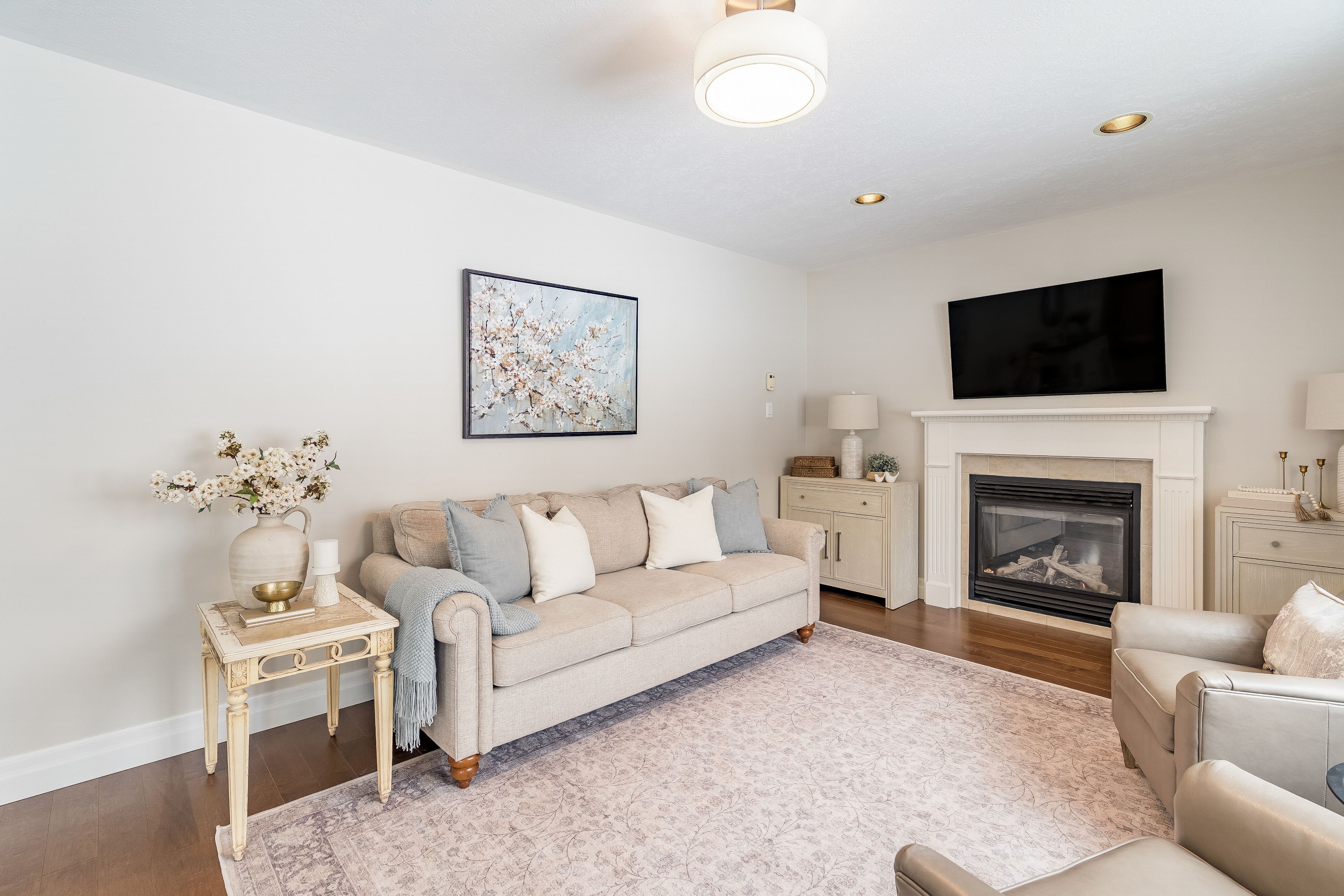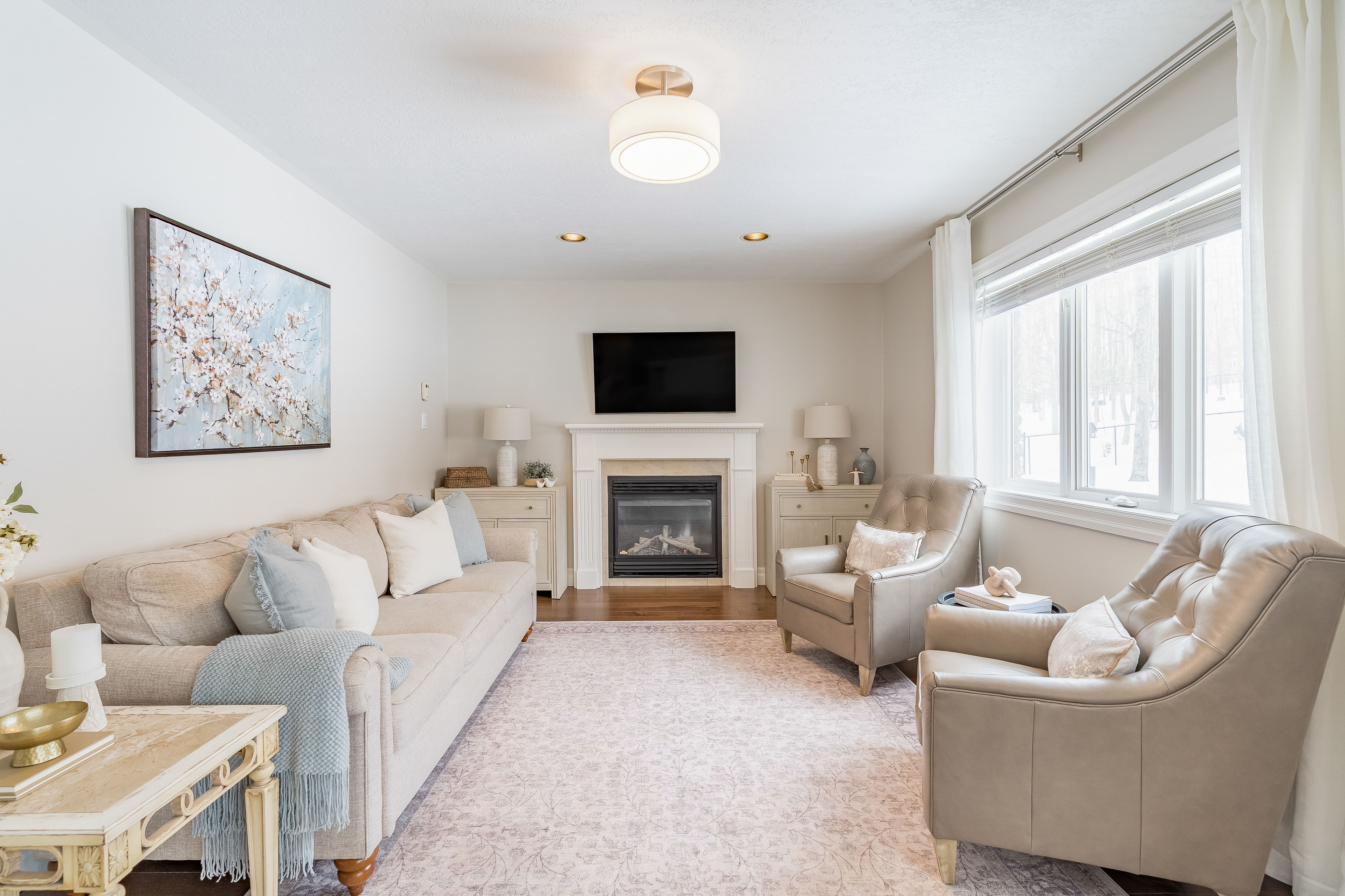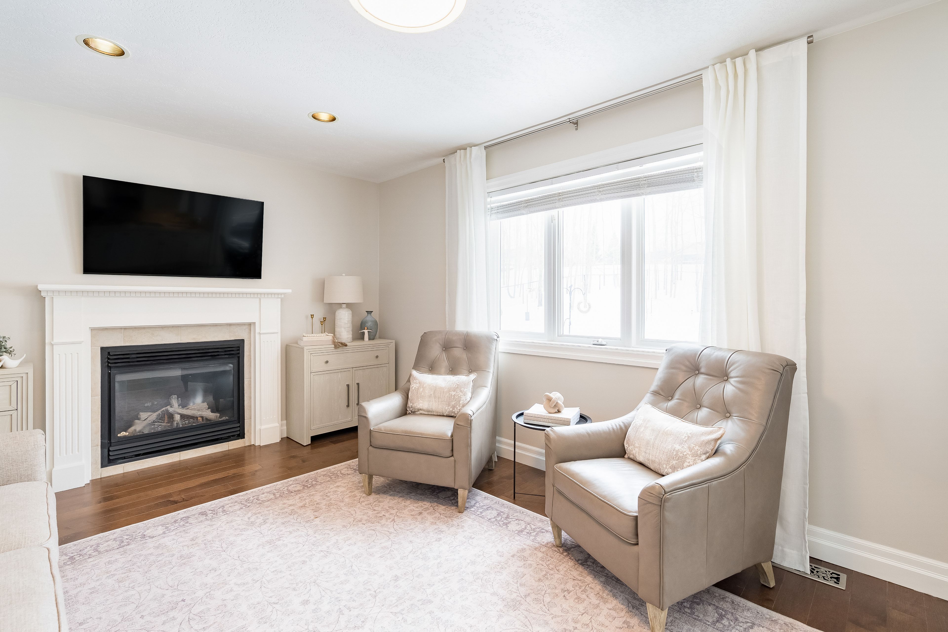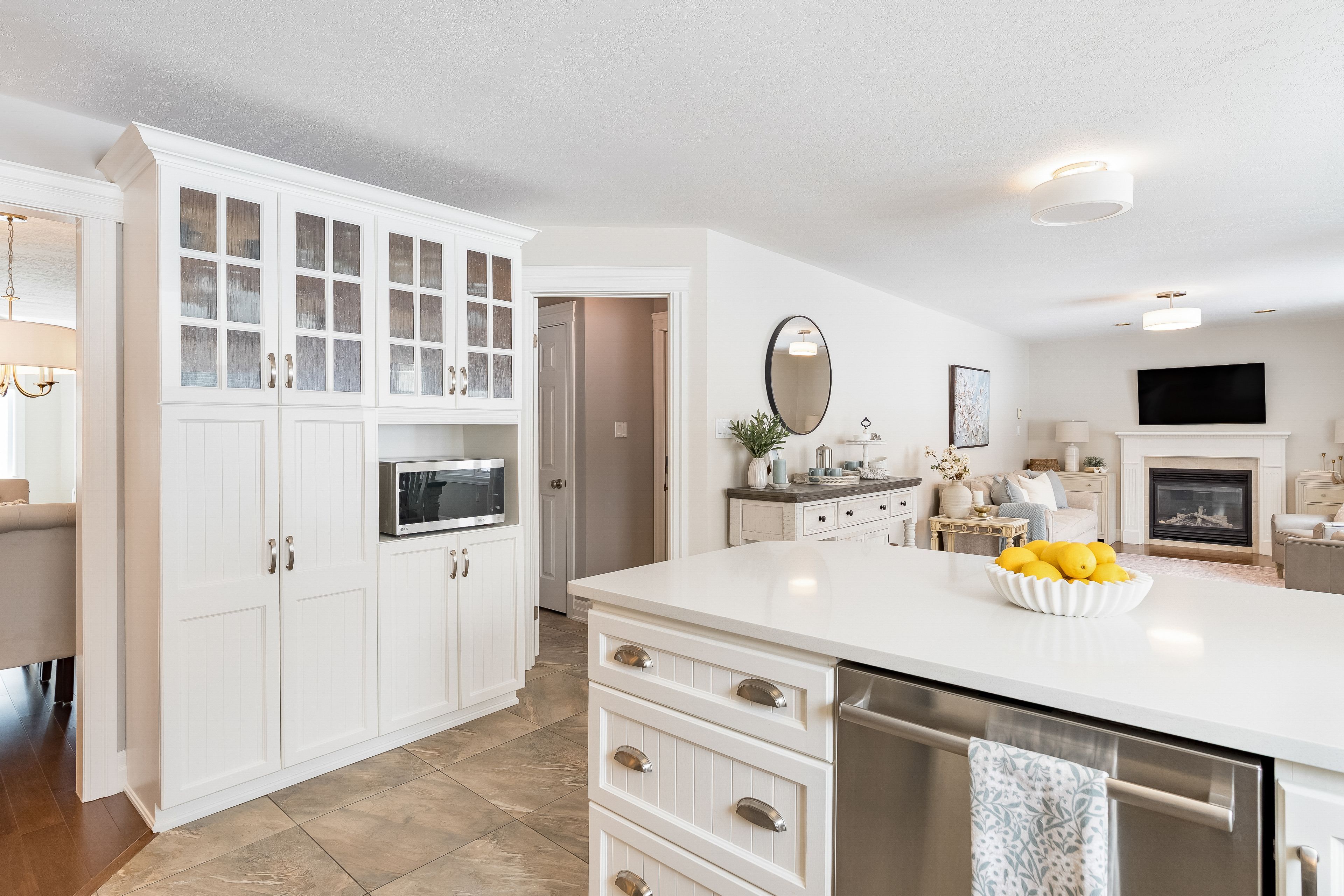 • Bright open-concept layout with modern kitchen and gas fireplace.