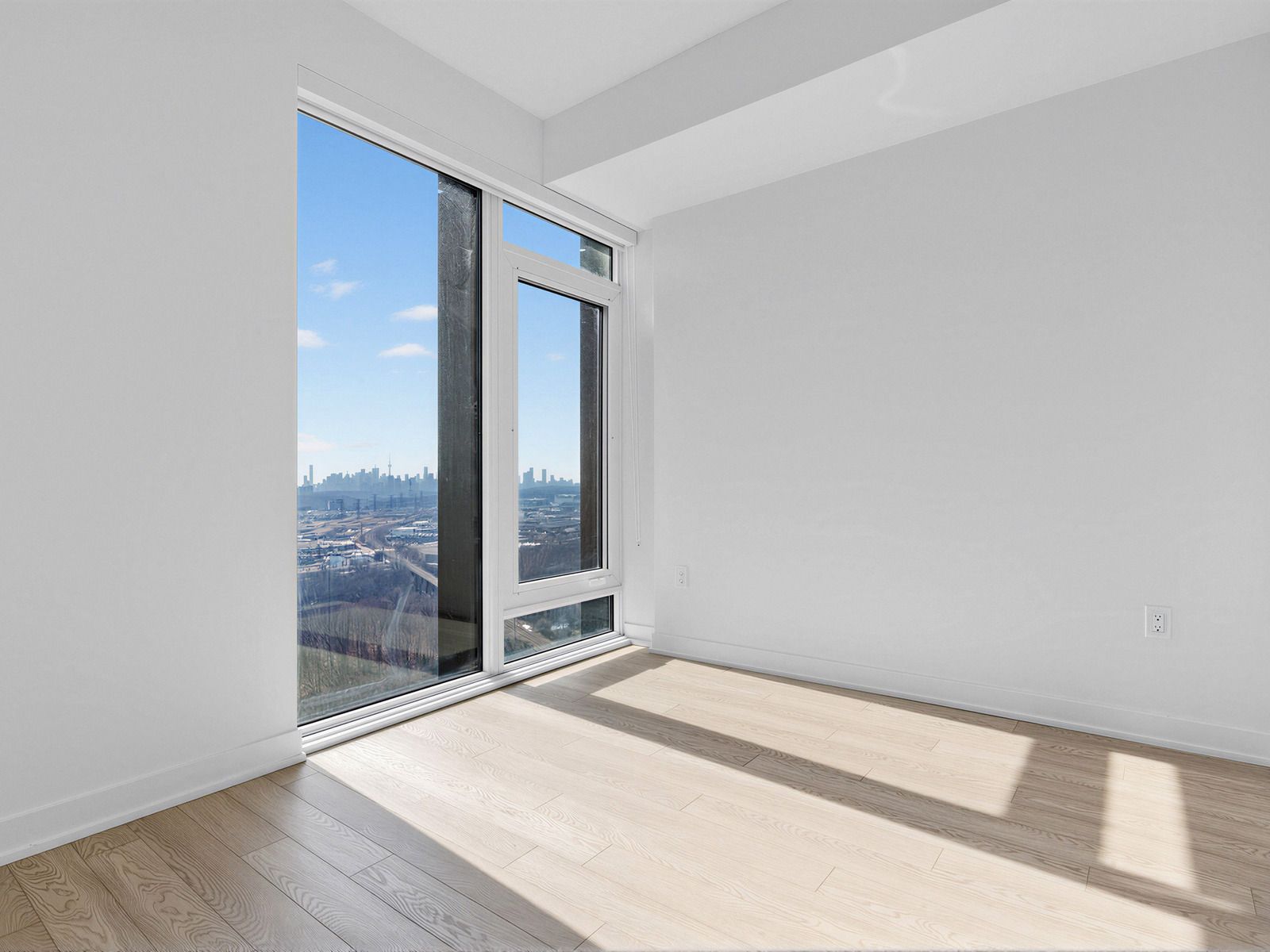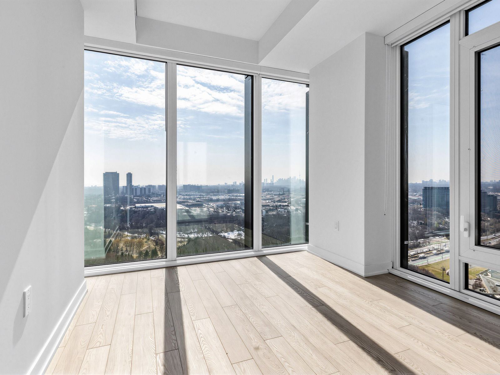 • Bright and modern with large windows showcasing city skyline views.