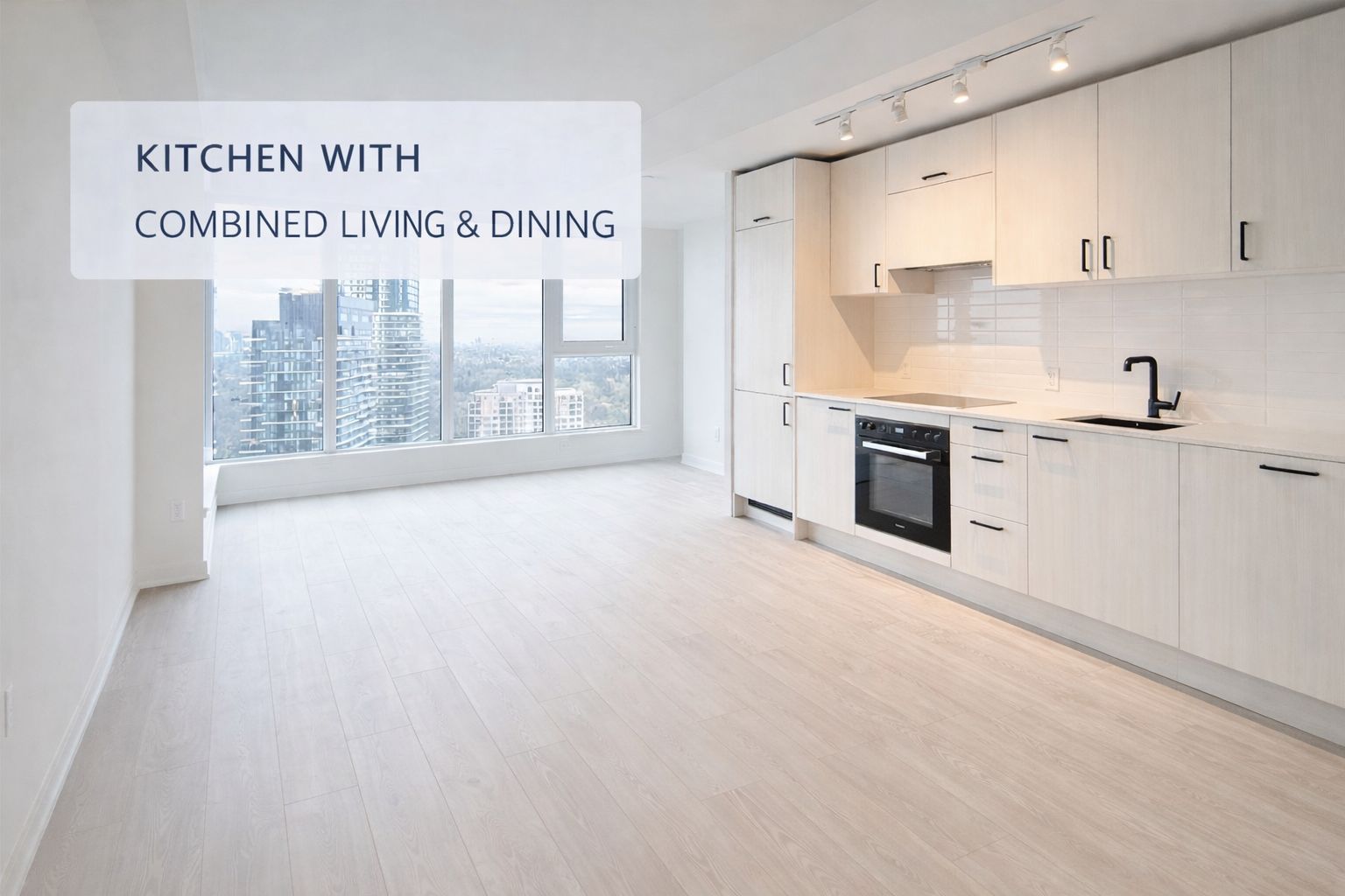 • Bright open-concept living and dining area with city views.