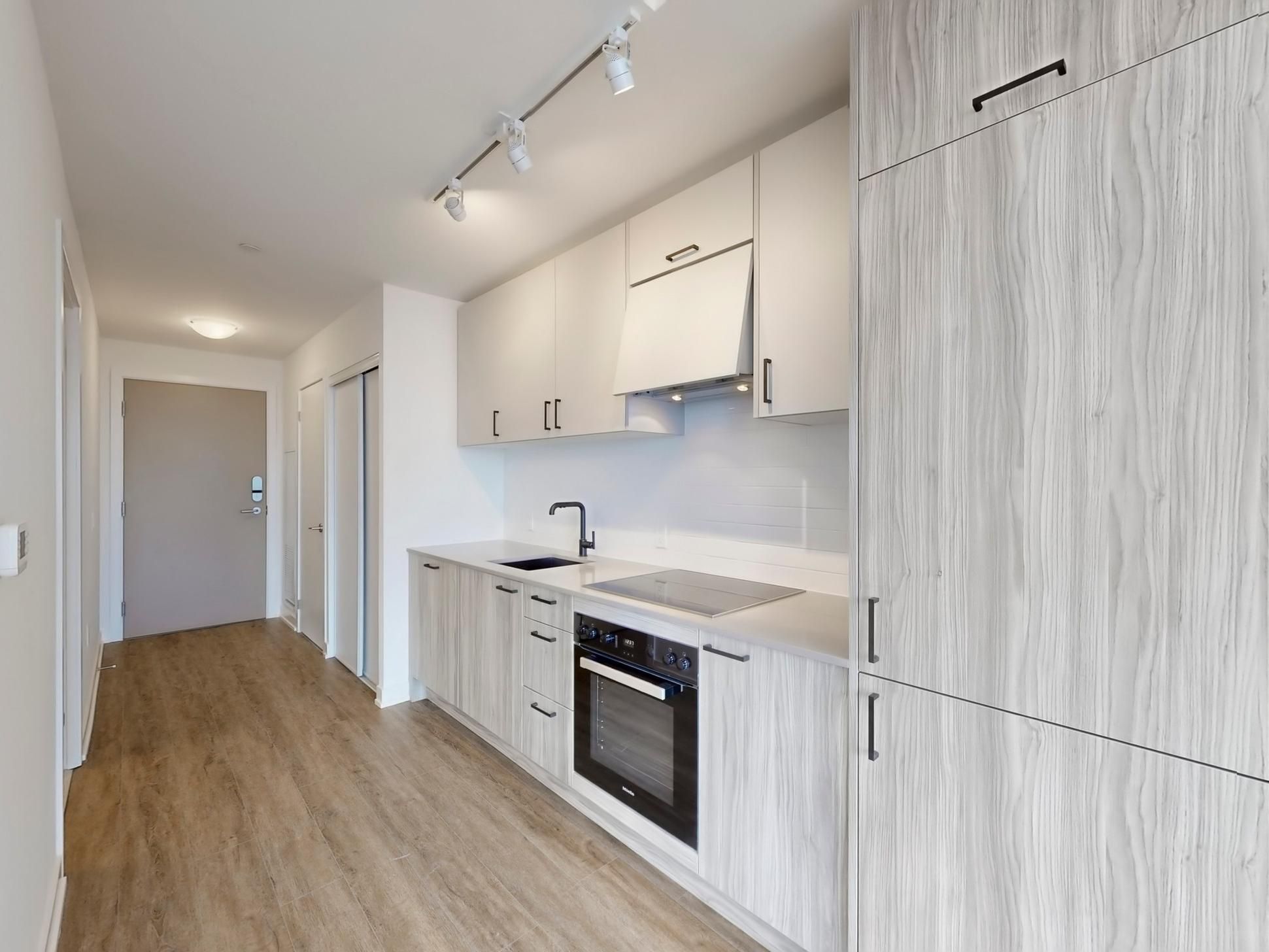 • Modern kitchen with stainless steel appliances and quartz countertops.