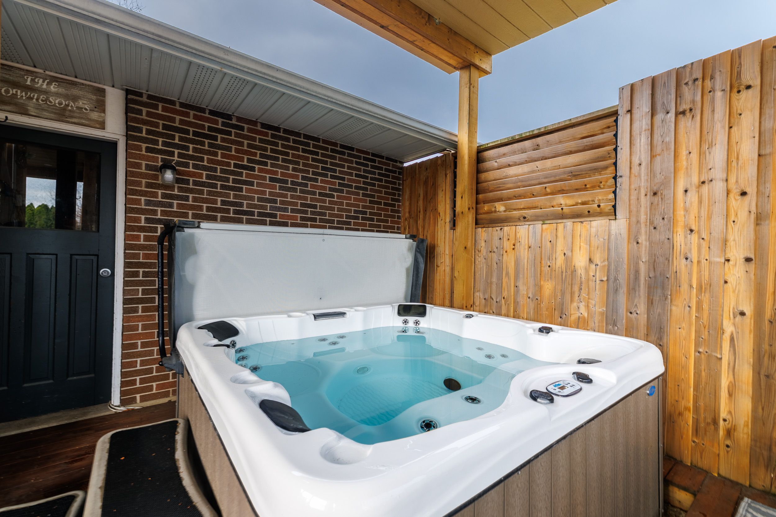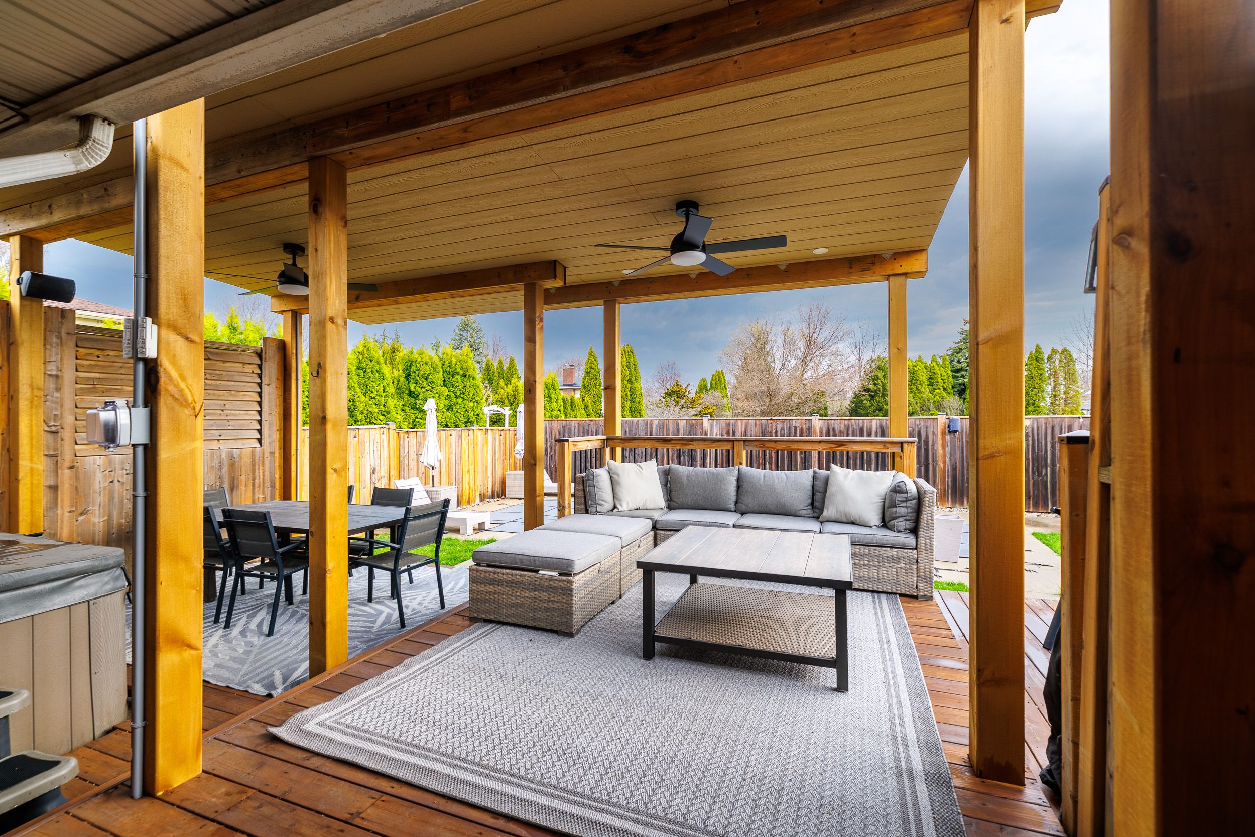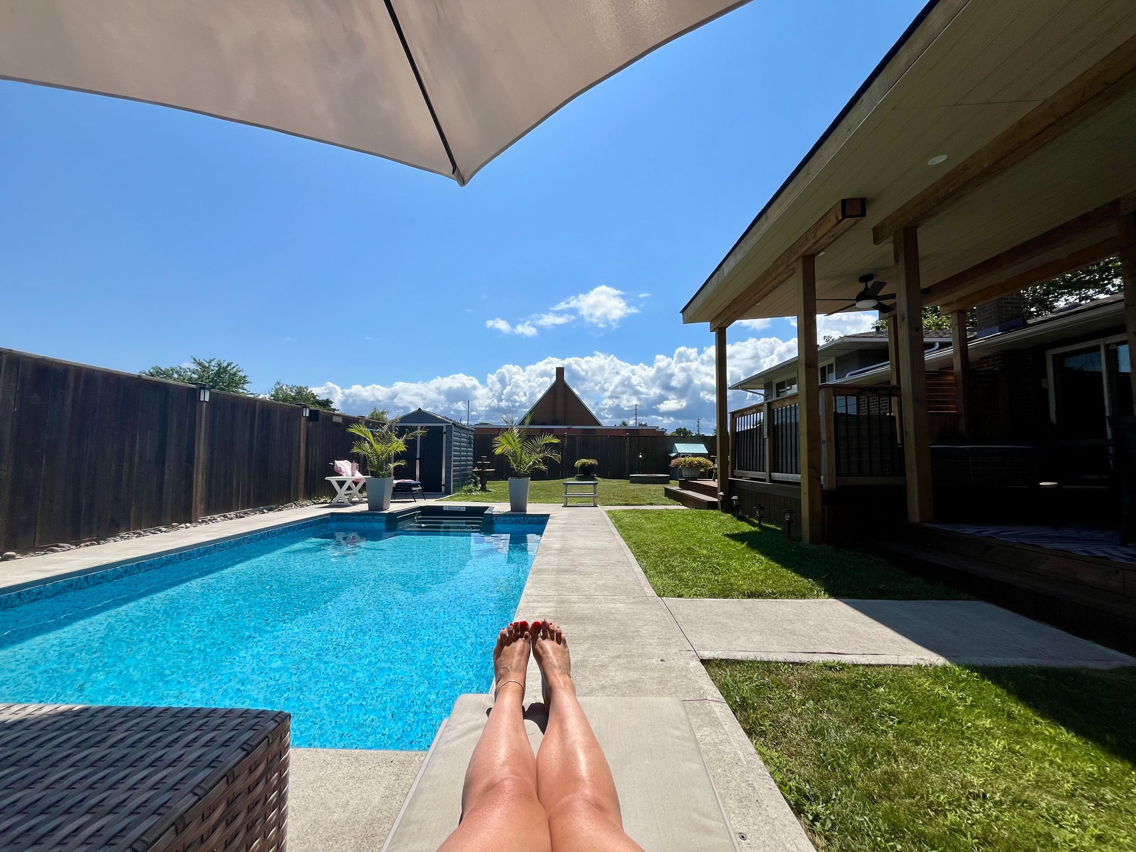 • Backyard retreat with saltwater pool, hot tub, and deck.