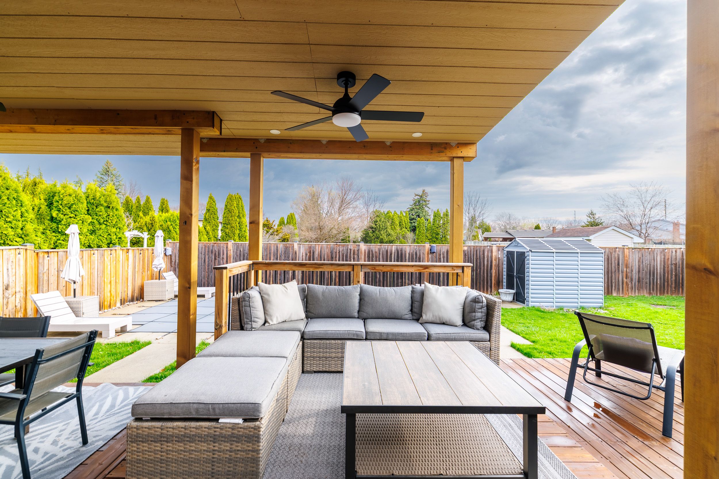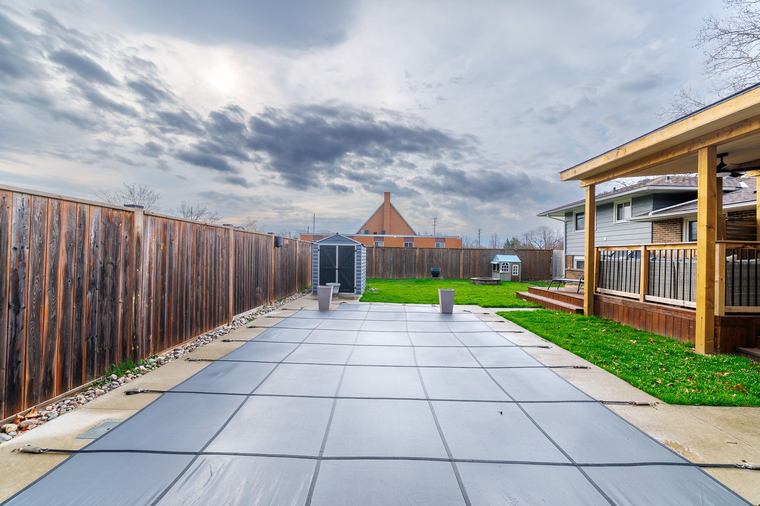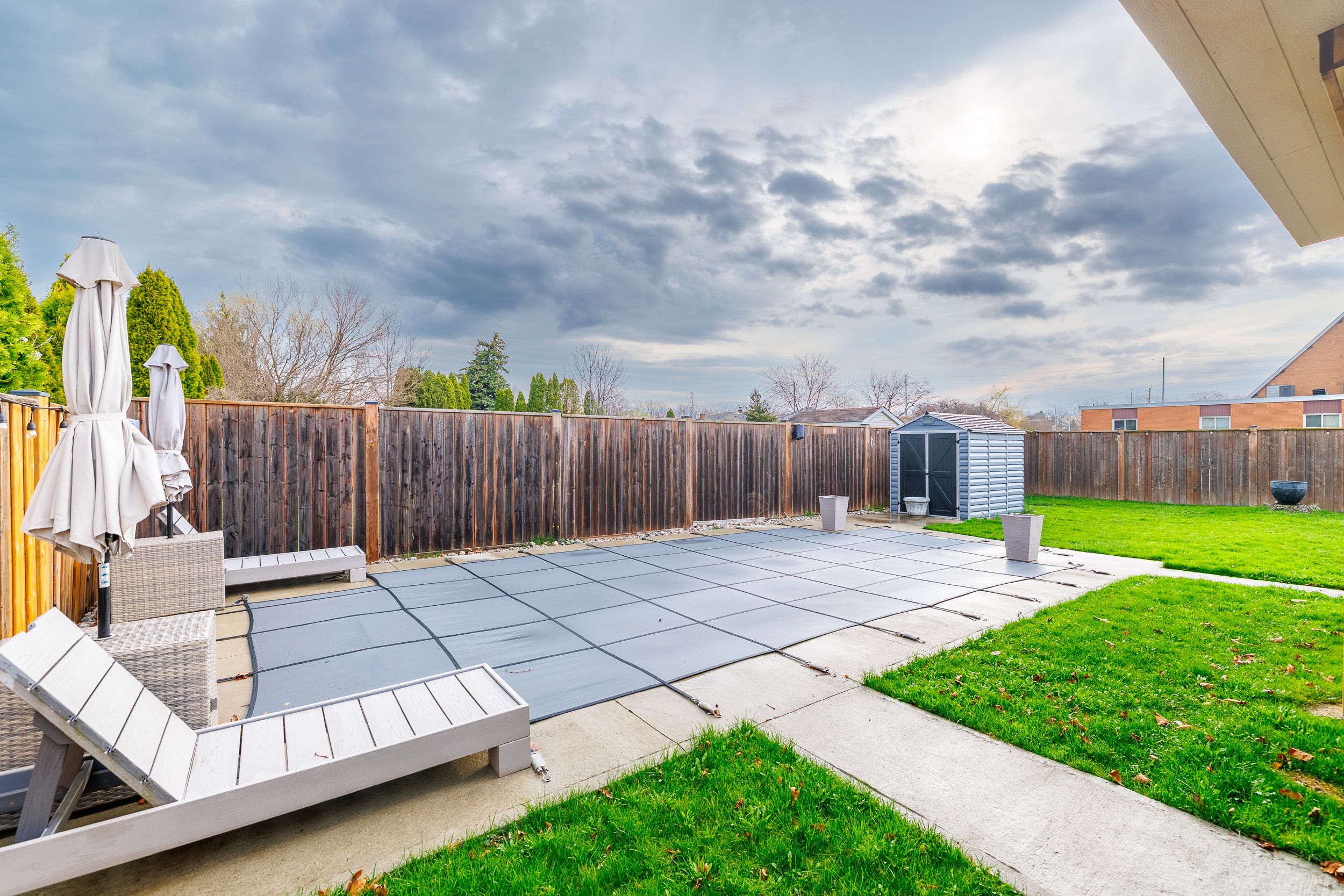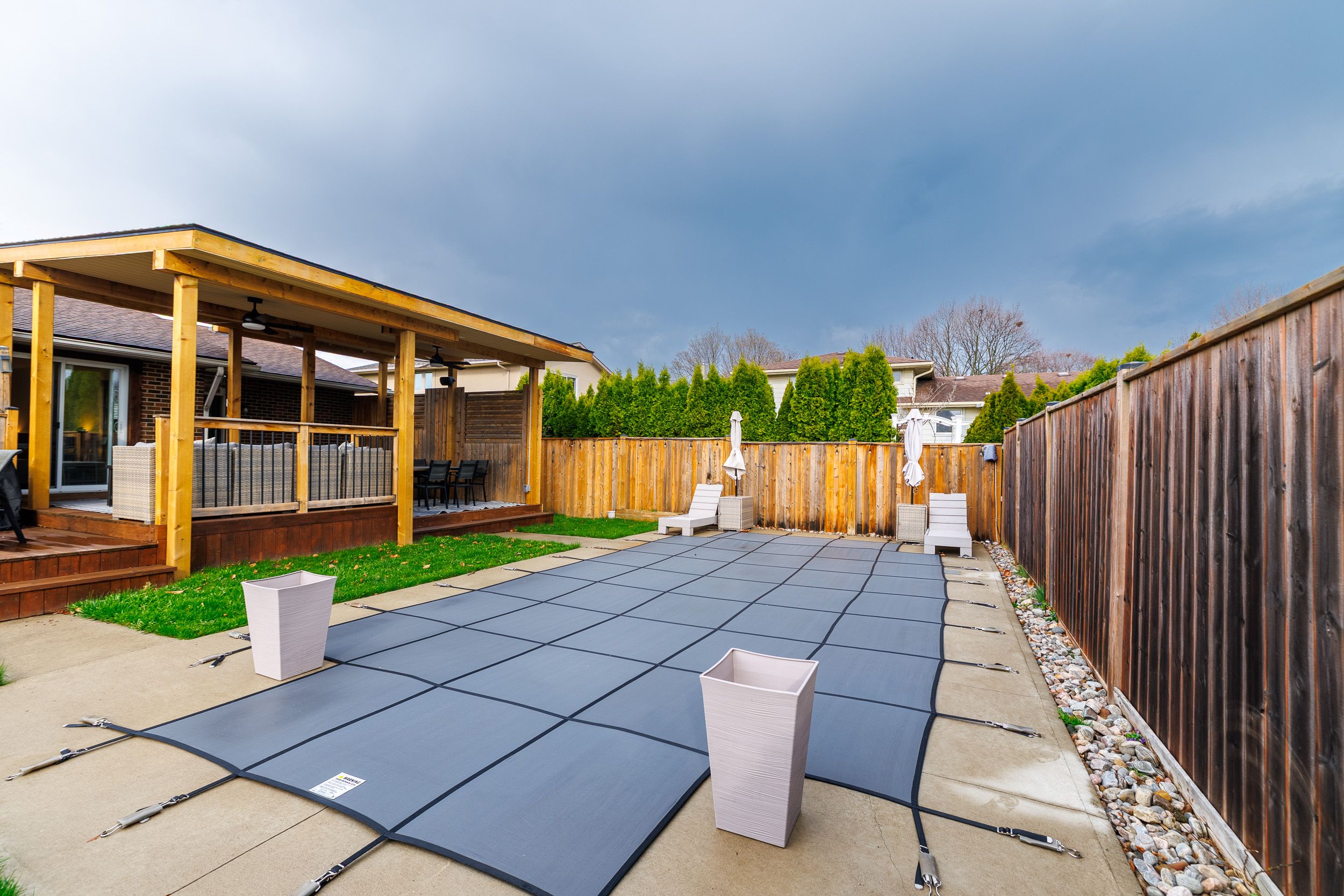 • Backyard retreat with saltwater pool, hot tub, and deck.